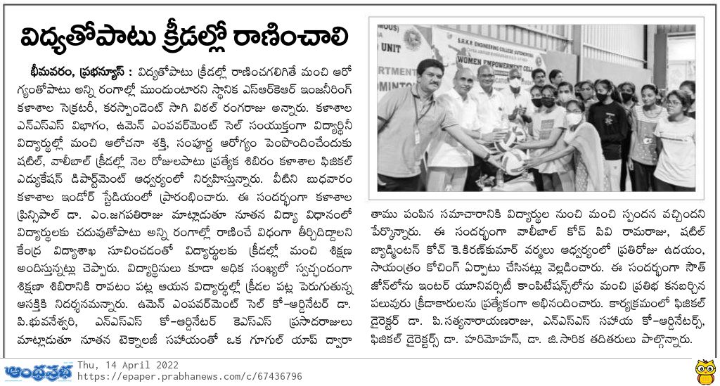 Principal of SRKR Engg College Dr. M. Jagapathi Raju garu had said that the Sports Day celebrations would be held at the college on 23rd April, 2022 at 5:30 PM for which Sri. Ravi prakash, Superintendent of Police of West Godavari Dist and ASP Sri. AV Subbaraju would be attending as the guests and give away the prizes to the students who had excelled in Sports. He invited all the students, parents, teaching and non teaching fraternity to attend all the programmes and make it a grand success.