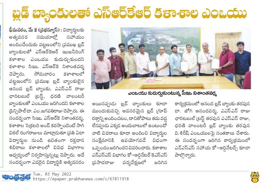 SRKR Engg College had entered an MOU with prominent Blood Banks in Bhimavaram which will facilitate the staff and students to avail blood during the case of emergencies. CEO of SRKR Mr. SRK Nishanth Varma had said that this MOU with Ananda Blood Bank, ASN Raju Charitable Trust and Dharani Voluntary Blood Bank will benefit the students and staff during the unforeseen circumstances. He also said that it is customary to conduct voluntary blood donation camps in the college every year by the students. Secretary & Correspondent of SRKR Sri. SV Ranga Raju, Principal Dr. M. Jagapathi Raju, NSS Coordinator KSN Prasada Raju and Blood Banks representatives Dr. Jogi Anand Varma, Mr. ASN Raju and Mr. V. Sirish took part in this noble activity.