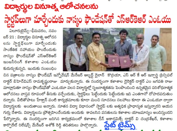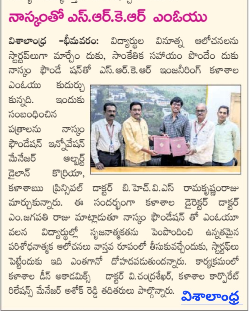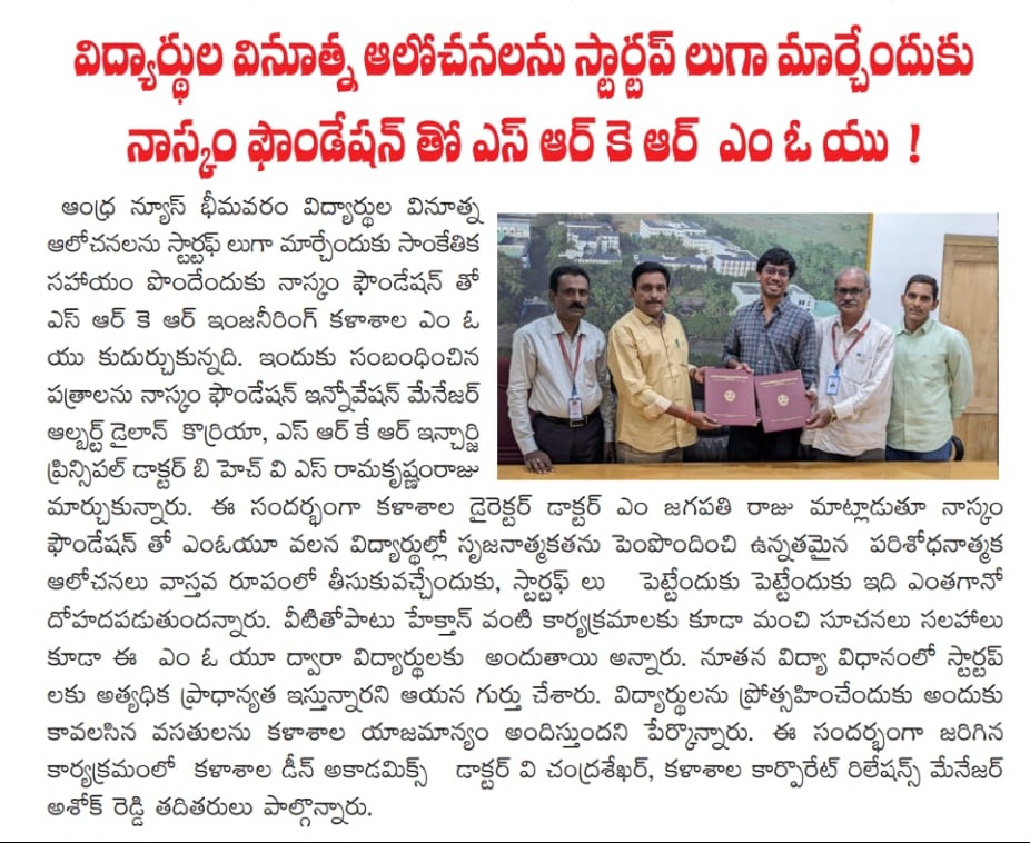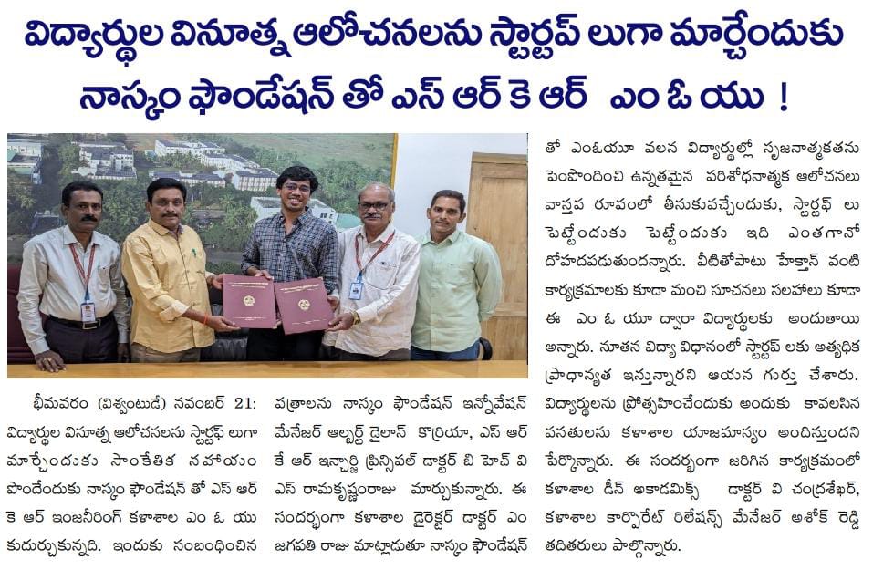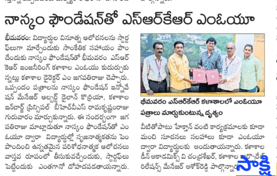 Bhimavaram: SRKR Engineering College has signed a Memorandum of Understanding (MoU) with the NASCOM Foundation to provide technical assistance in transforming innovative ideas from students into practical solutions. The MoU was officially exchanged between NASCOM Foundation Innovation Manager, Albert Dylan Correa, and the College In-charge Principal, BHPS Ramakrishnan Raju, on Thursday.