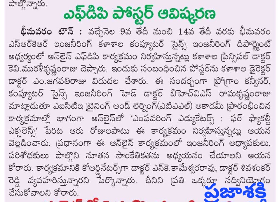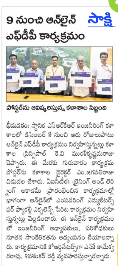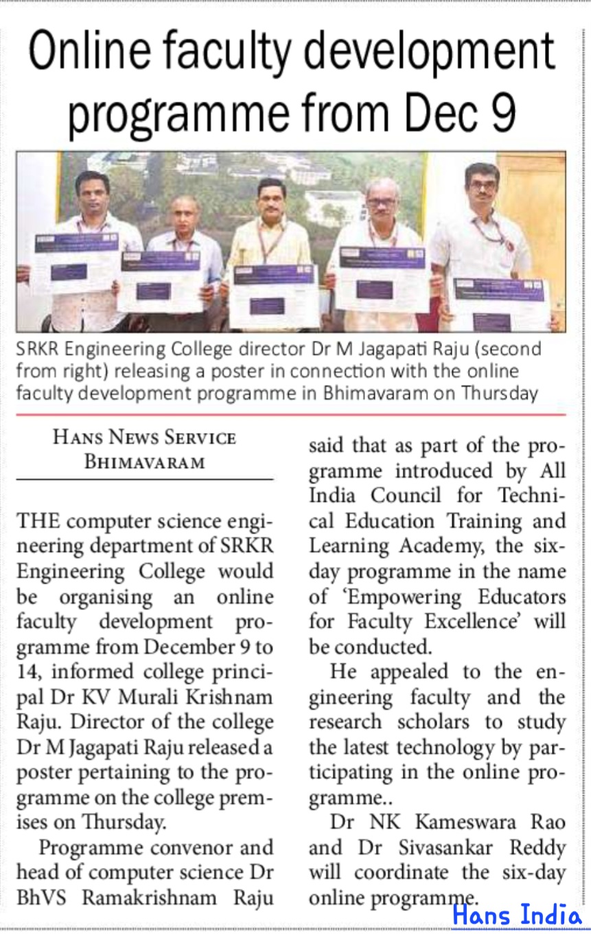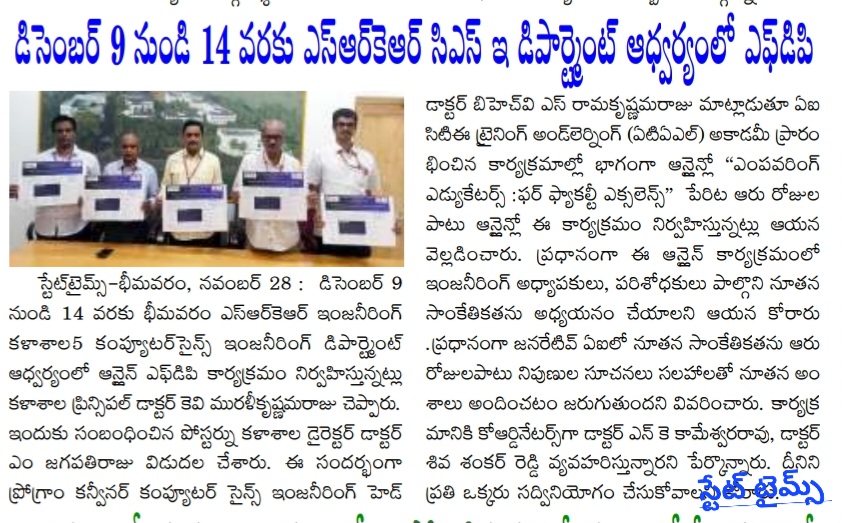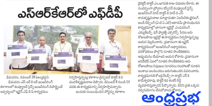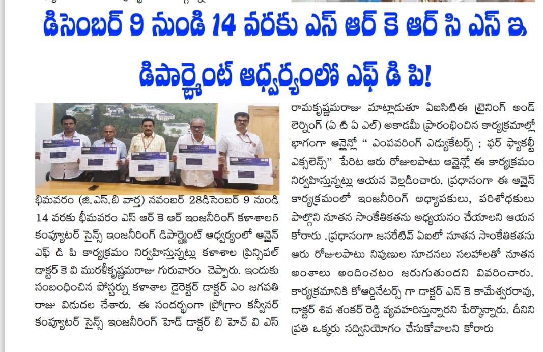 Bhimavaram: SRKR Engineering College’s Computer Science and Engineering (CSE) Department is conducting an online Faculty Development Program (FDP) from November 28 to December 9-14. The program is being organized under the auspices of the AICTE Training and Learning (ATAL) Academy.