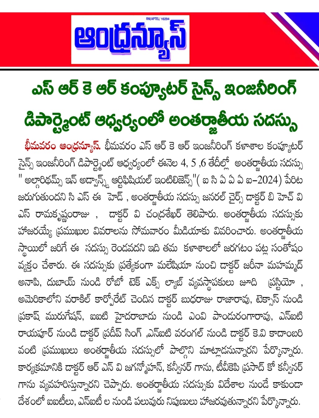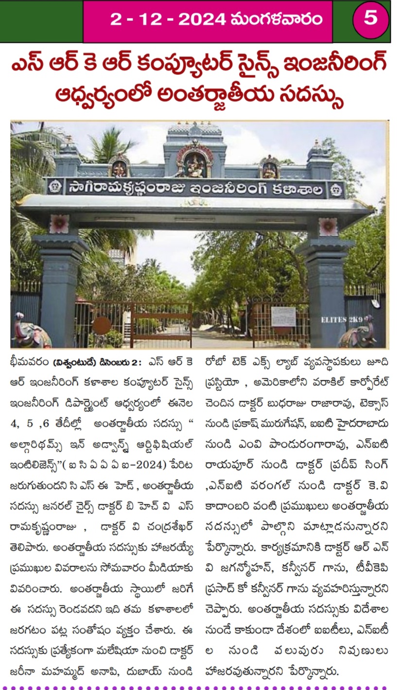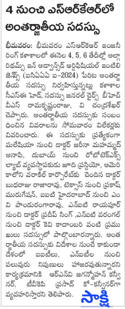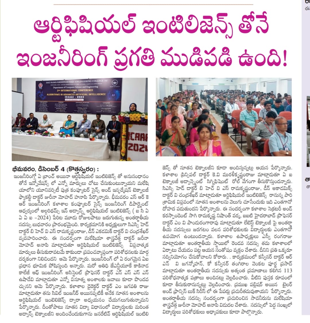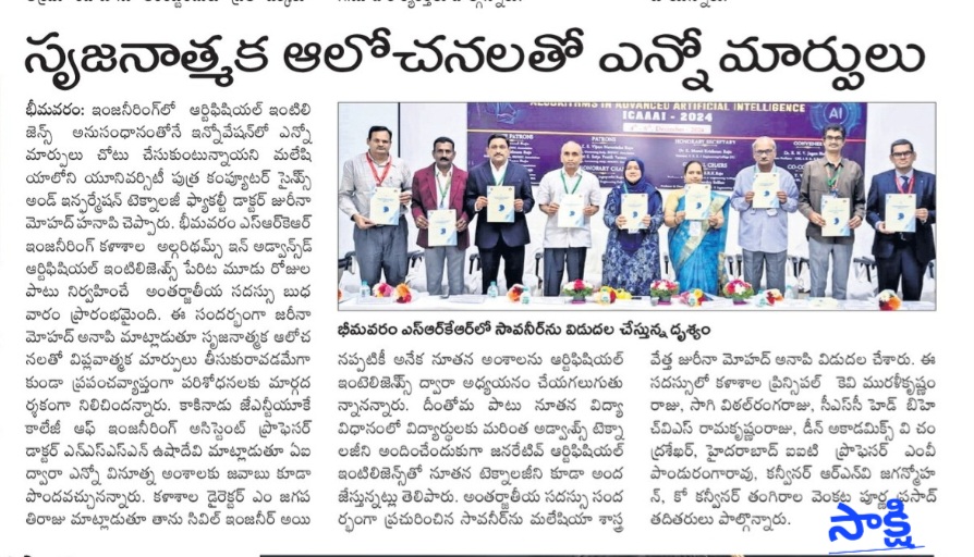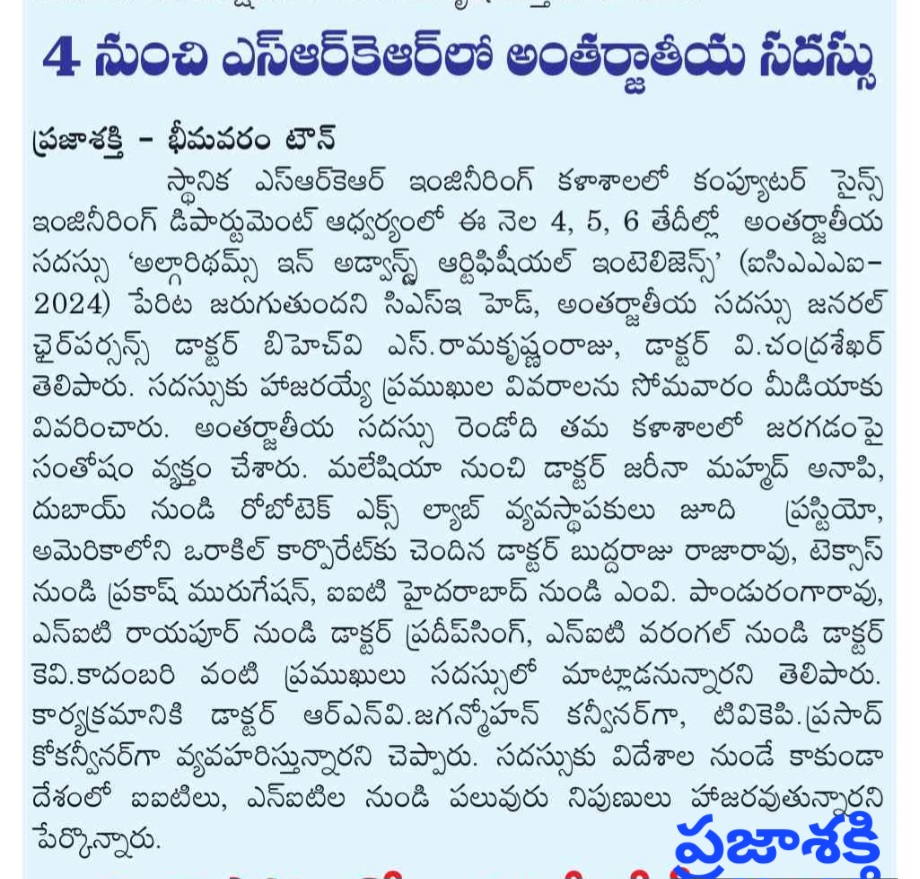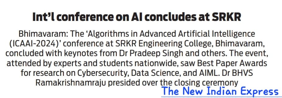 Bhimavaram, December 2: SRKR Engineering College is hosting an International Conference on "Algorithms in Advanced Artificial Intelligence" (ICAA-2024) on the 4th, 5th, and 6th of December. The conference is organized under the auspices of the Computer Science and Engineering Department and is being held at the college for the second time at an international level.