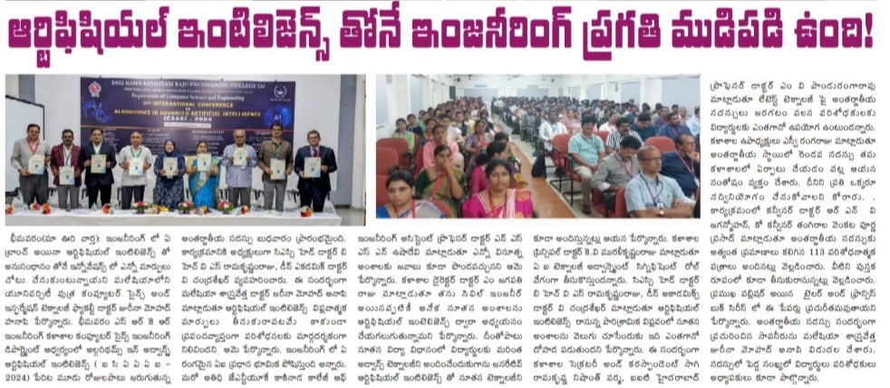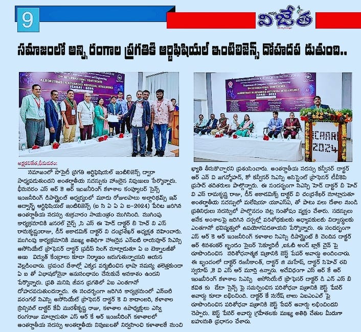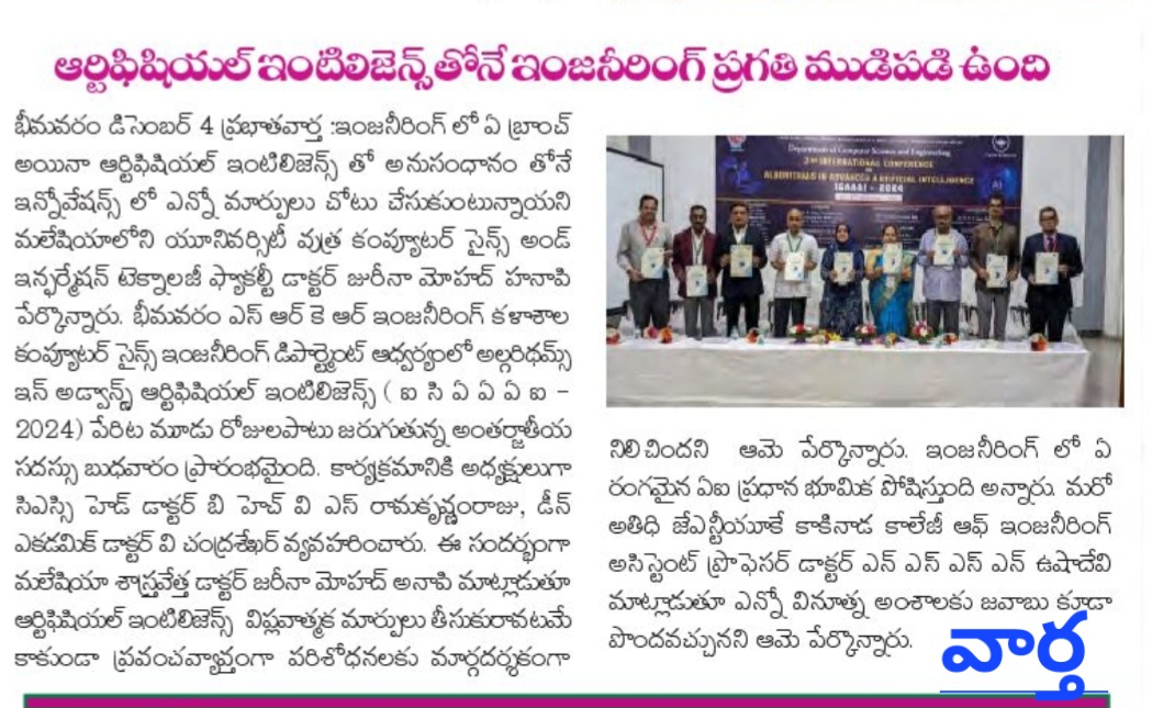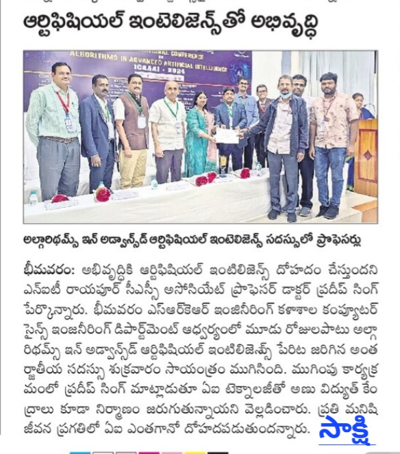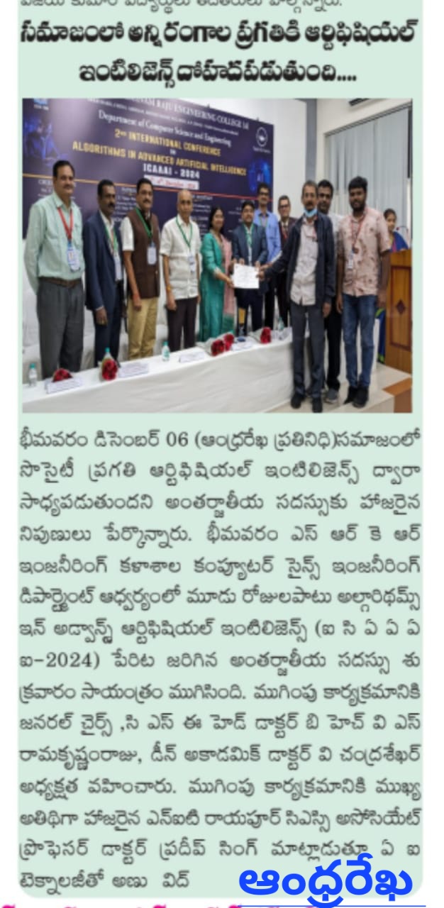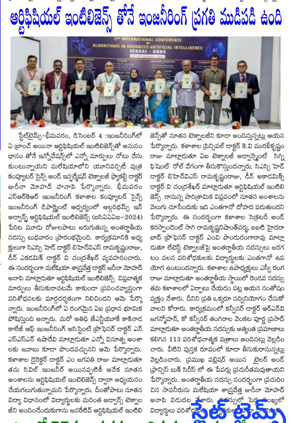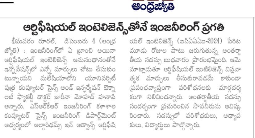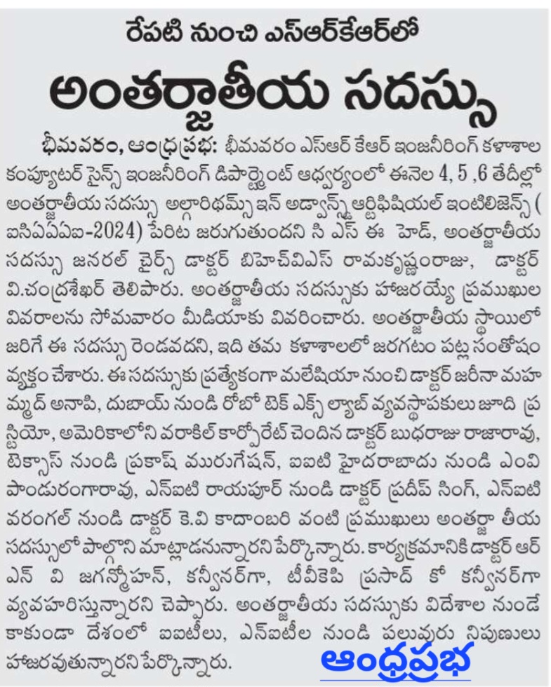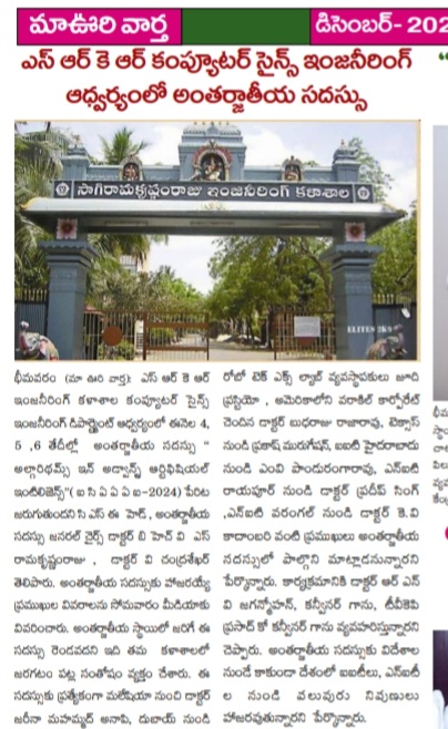 Bhimavaram, December 2: SRKR Engineering College is hosting an International Conference on "Algorithms in Advanced Artificial Intelligence" (ICAA-2024) on the 4th, 5th, and 6th of December. The conference is organized under the auspices of the Computer Science and Engineering Department and is being held at the college for the second time at an international level.