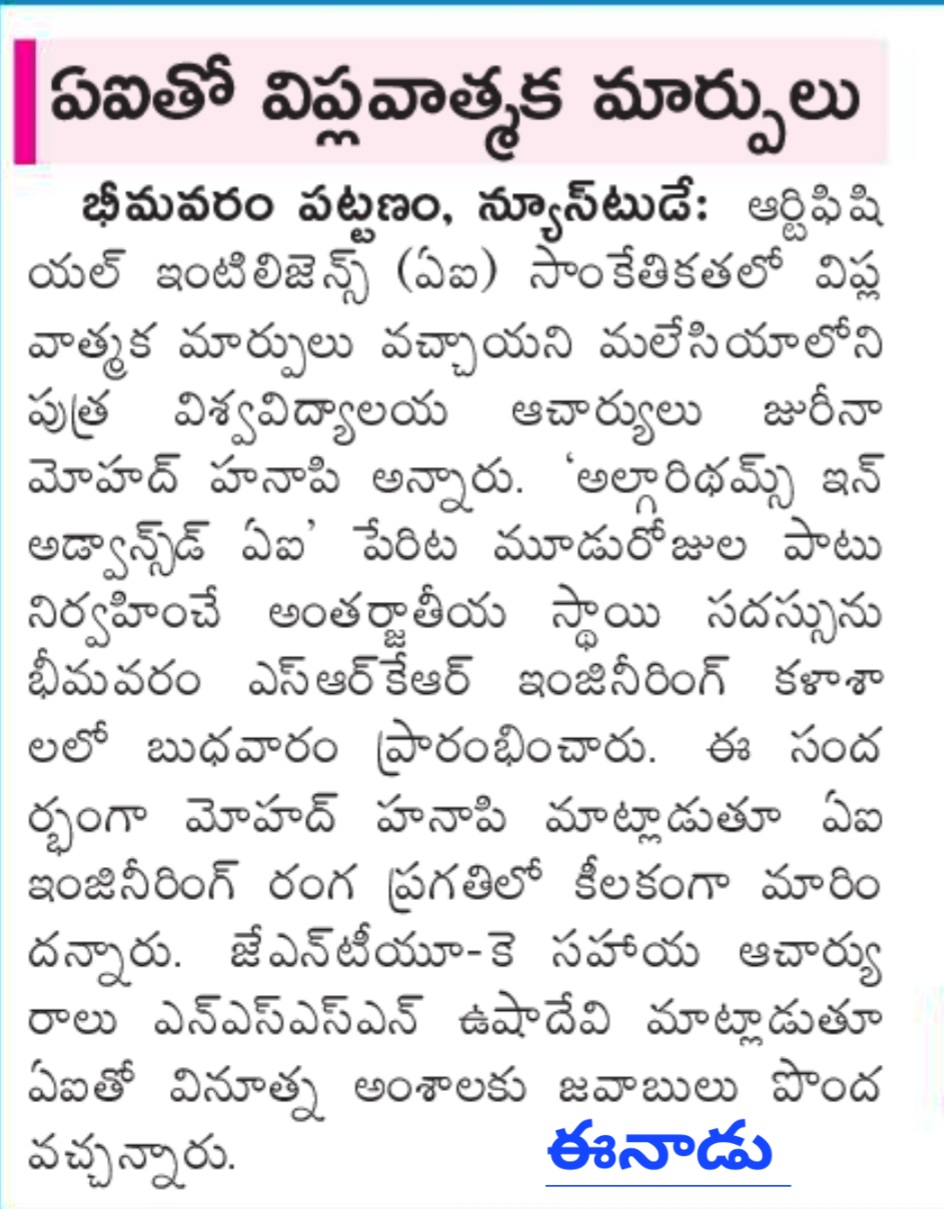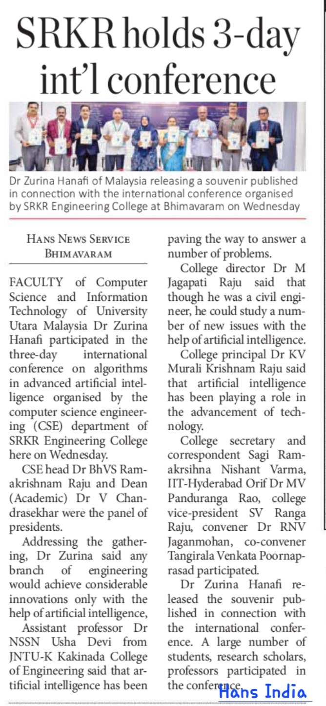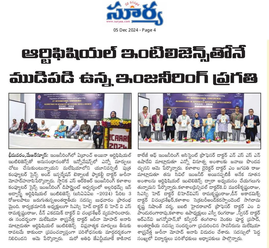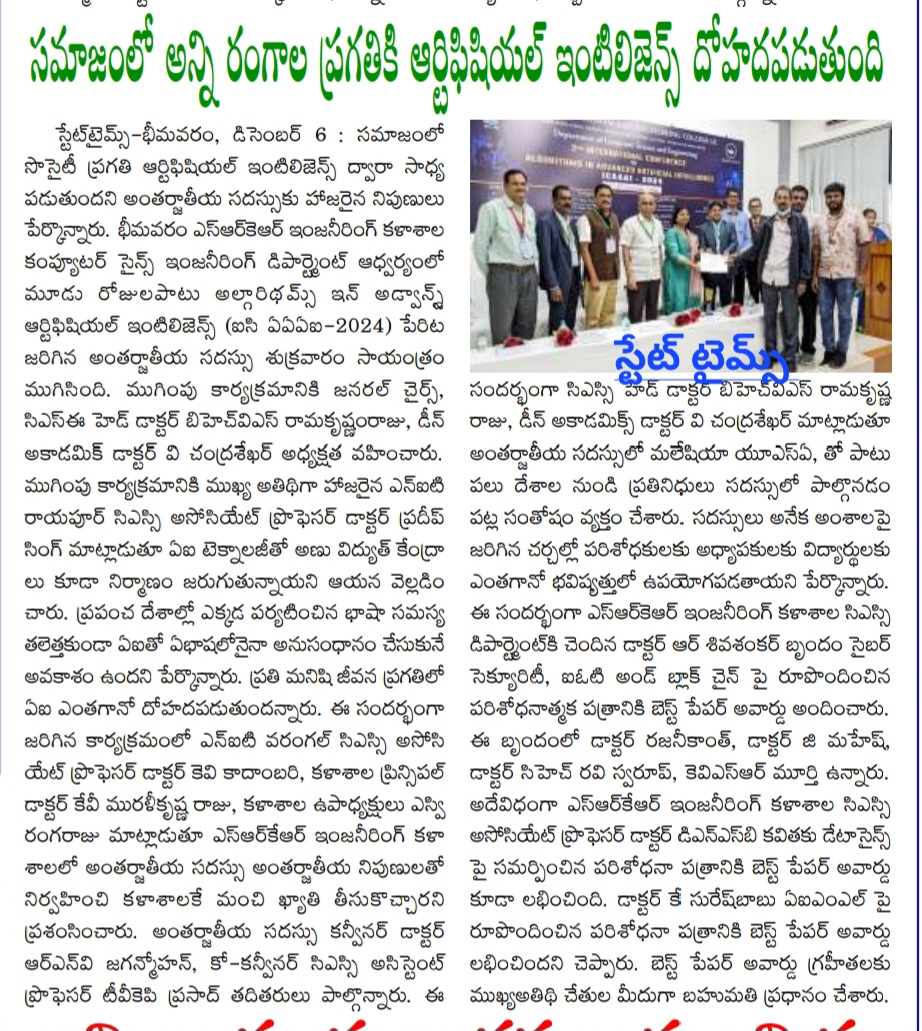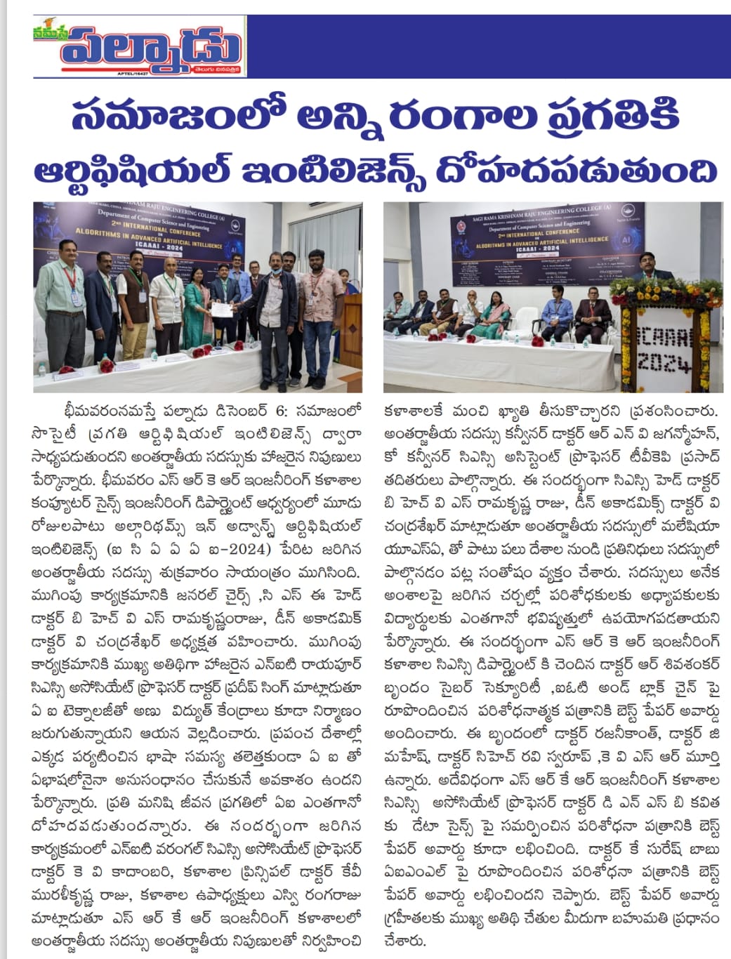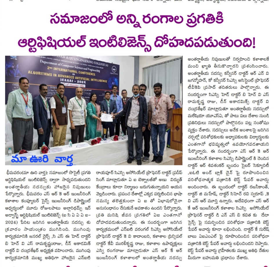 Bhimavaram, December 2: SRKR Engineering College is hosting an International Conference on "Algorithms in Advanced Artificial Intelligence" (ICAA-2024) on the 4th, 5th, and 6th of December. The conference is organized under the auspices of the Computer Science and Engineering Department and is being held at the college for the second time at an international level.