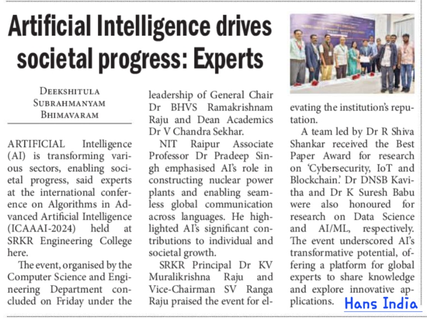 Bhimavaram, December: Experts at the three-day International Conference on Algorithms in Advanced Artificial Intelligence (ICAAI-2024) emphasized the transformative role of Artificial Intelligence (AI) in driving societal progress across various sectors. The conference, organized by the Computer Science and Engineering Department of SRKR Engineering College, concluded on Friday evening, with the participation of distinguished experts and researchers from around the world.