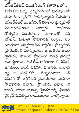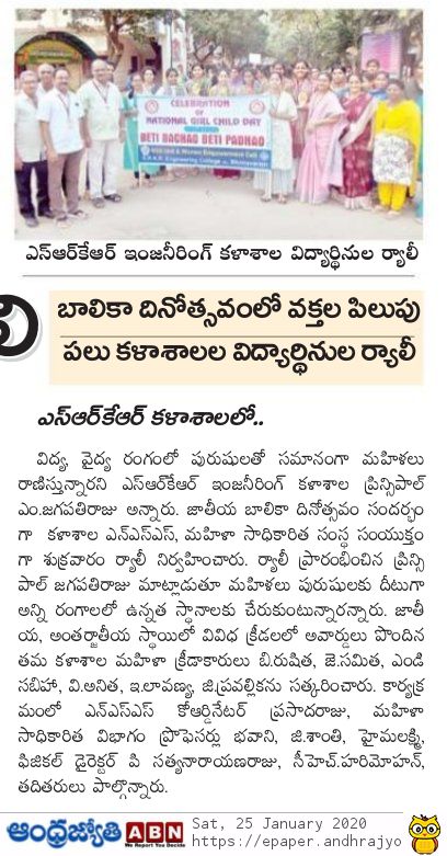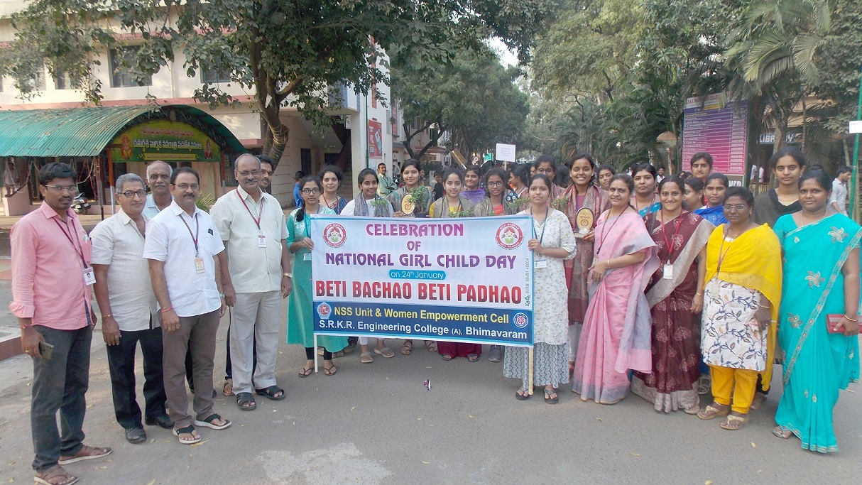 NSS unit in colloboration with womenempowerment cell celebrated National girl child day on 24-01-2020 on the theme of Beti Bachao Beti Padhao.Walkathon was conducted to bring awareness about "Beti Bachao Beti Padhao" among public surrounding the campus.On this occasion women sports persons were felicitated