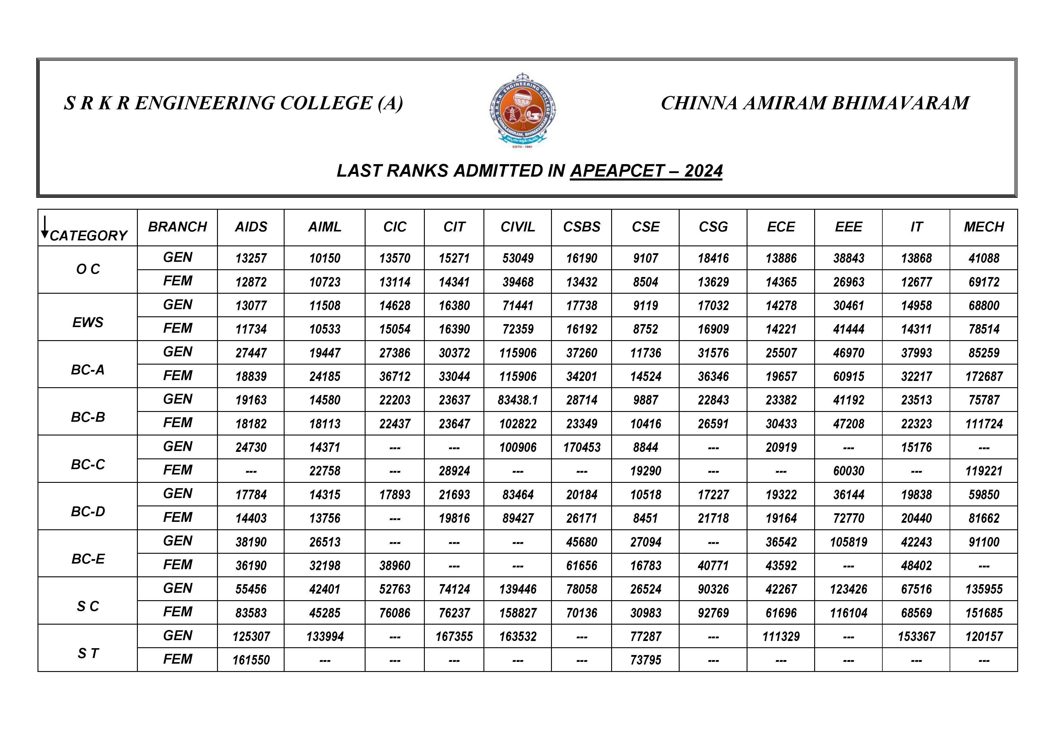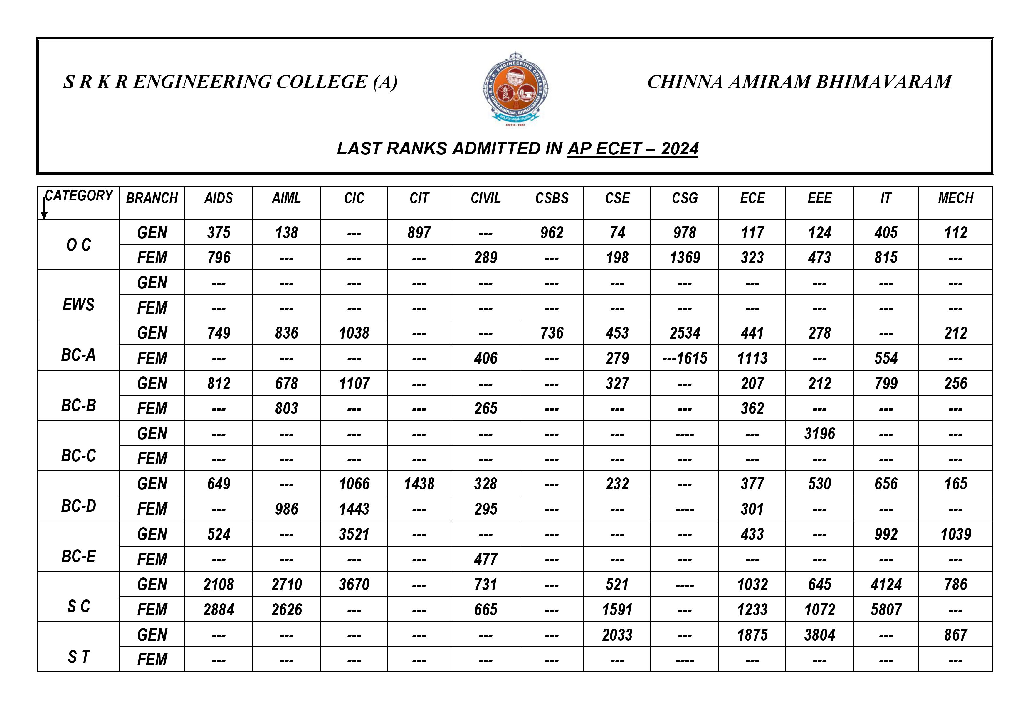 CATEGORY | GENDER | ECE | CSE-1 | CSE-2 | IT | EEE | MECH | CIV-1 | CIV-2 |