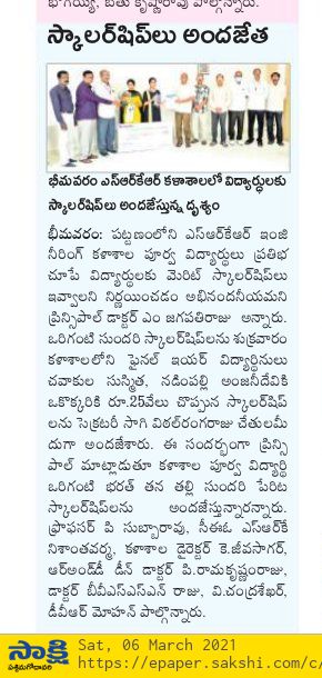 Smt Oruganti Sundari annual scholarship award sponsored by Mr Oruganti Bharat (1995 ECE Alumnus), Senior Vice President of operations at Q2 Inc. USA) has been presented to 2 best students of SRKREC. CHAVAKULA SUSMITHA (9.29 CGPA) from 4/4 ECE department and NADIMPALLI ANJANI DEVI (9.29 CGPA) of 4/4 CSE has been adjudged as winners of this award. A cash award of Rs.25,000/- has been presented to each of them.