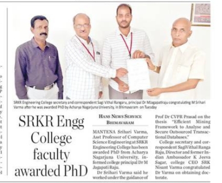 Mathena Sri Hari Varma, Assistant Professor of CSE Department, SRKREC has been awarded with PhD from Acharya Nagarjuna University for his thesis titled "Efficient Mining Framework to Analyse and Secure Outsourced Transactional Databases" under the guidance Dr. C V P R Prasad.
