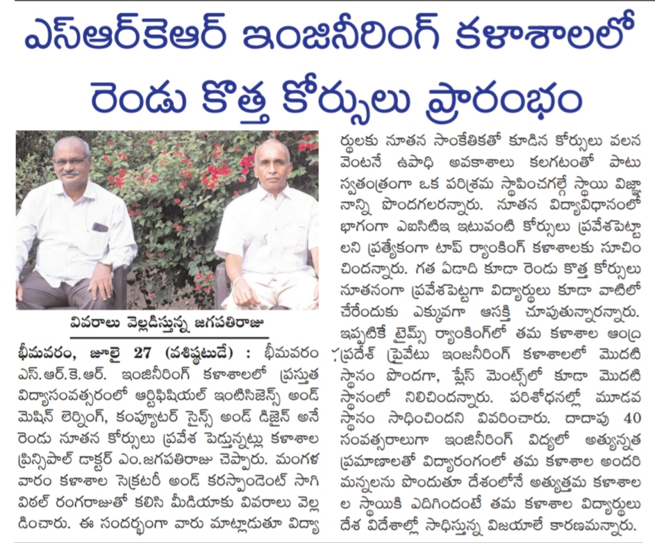 AICTE has sanctioned two new courses in SRKREC from the academic year 2021-22 along with the 2 additional branches sanctioned last year.
