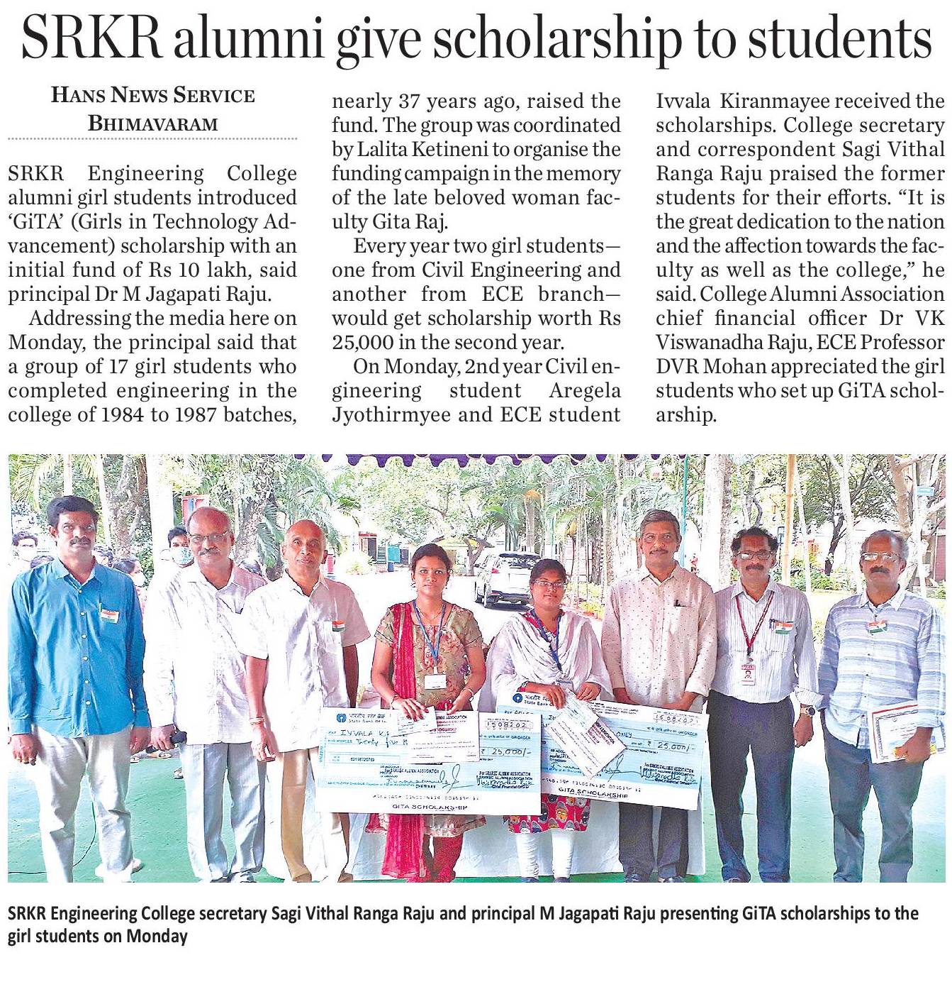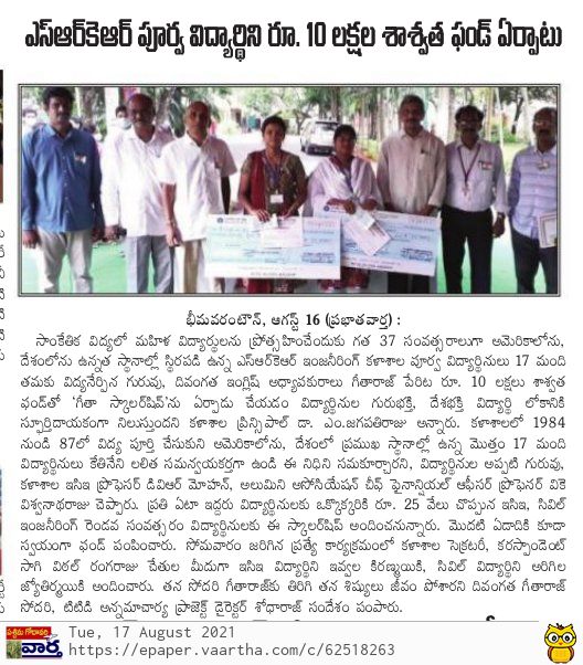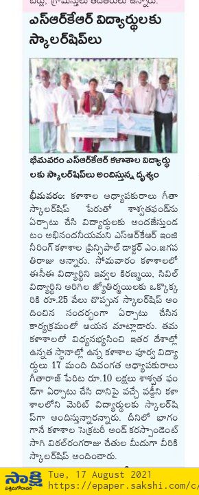 SRKREC alumni students introduced a special GiTA (Girls in Technology Advancement) scholarship with an inital fund of 10 lakh rupees. A group of 17 girl students who completed engineering in SRKREC from 1984 to 1987 batches has raised this fund in the memory of late beloved women faculty Gita Raj. As part of this scholarship, every year, two girl students - one from Civil Engineering and one from ECE branch would get scholarship worth Rs.25,000/-. For the year 2021, 2/4 Civil student Aregela Jyothirmayee and ECE student Ivvala Kiramnayee received the scholarships.