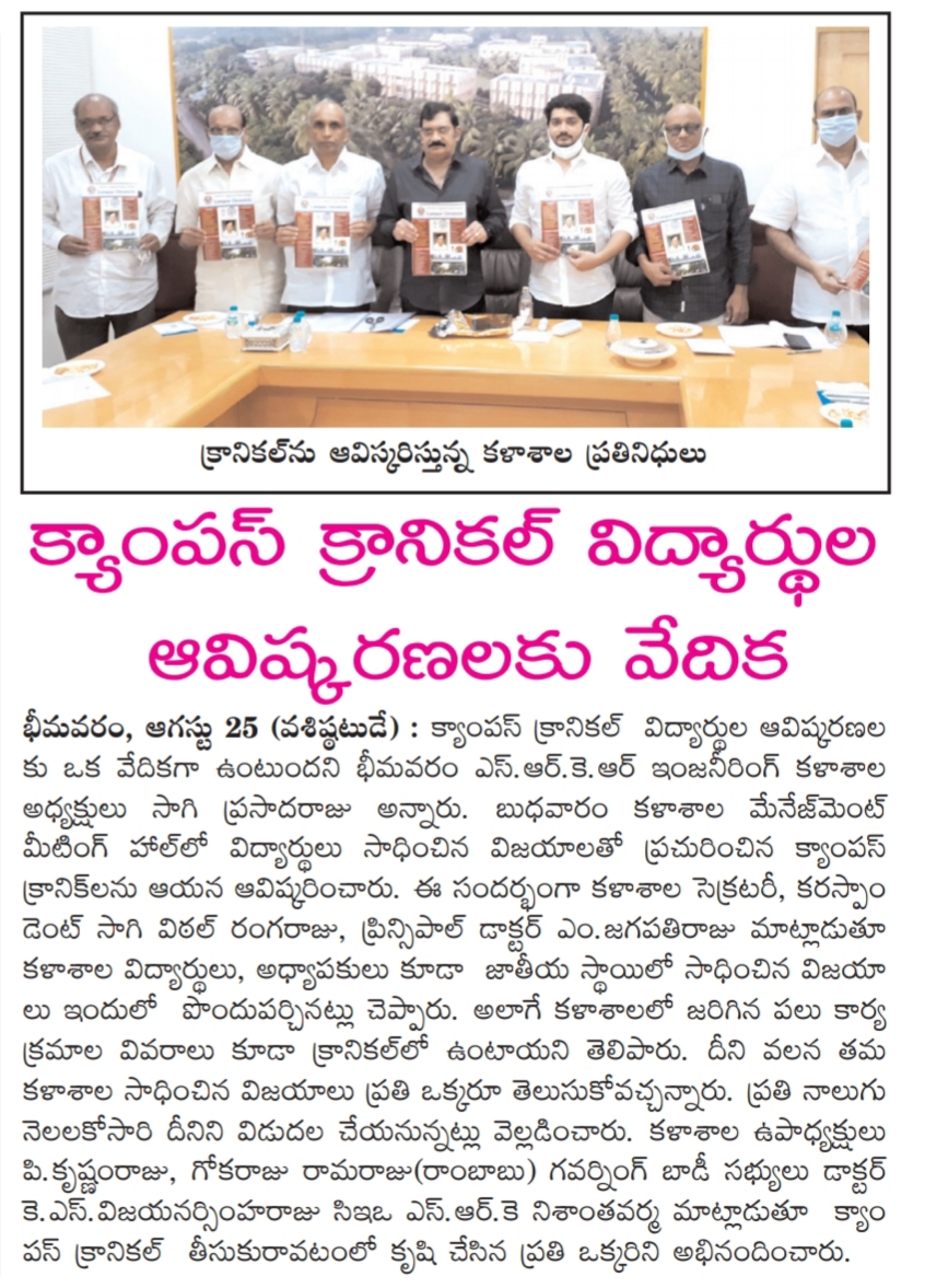 The campus magazine of SRKREC named Campus Chronicle has been launched officially by the college management here on campus. The Campus Chronicle magazine will publish all the achievements, activities and happenings of the campus every 4 months. The college committee President Sri Sagi Prasada Raju garu, Vice Presidents Sri P Krishnam Raju garu, Sri Gokaraju Ramaraju garu, Secretary & Correspondent Sri S.V. Rangaraju garu, Governing Body Member Dr. K.S. Vijaya Narasimha Raju garu, CEO Sri S.R.K. Nishant garu, Principal Dr. Jagapathi Raju garu, and others were present on this occasion.