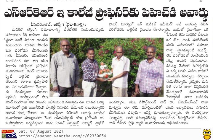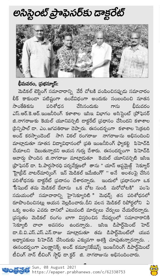 G Nagaraju, Assistant Professor of ECE Department has been awarded with PhD from KL University for his thesis titled "An optimised secure hybrid watermarking in medical imaging" under the supervision of Dr. P Pardhasaradhi, Professor in ECE, KL University.