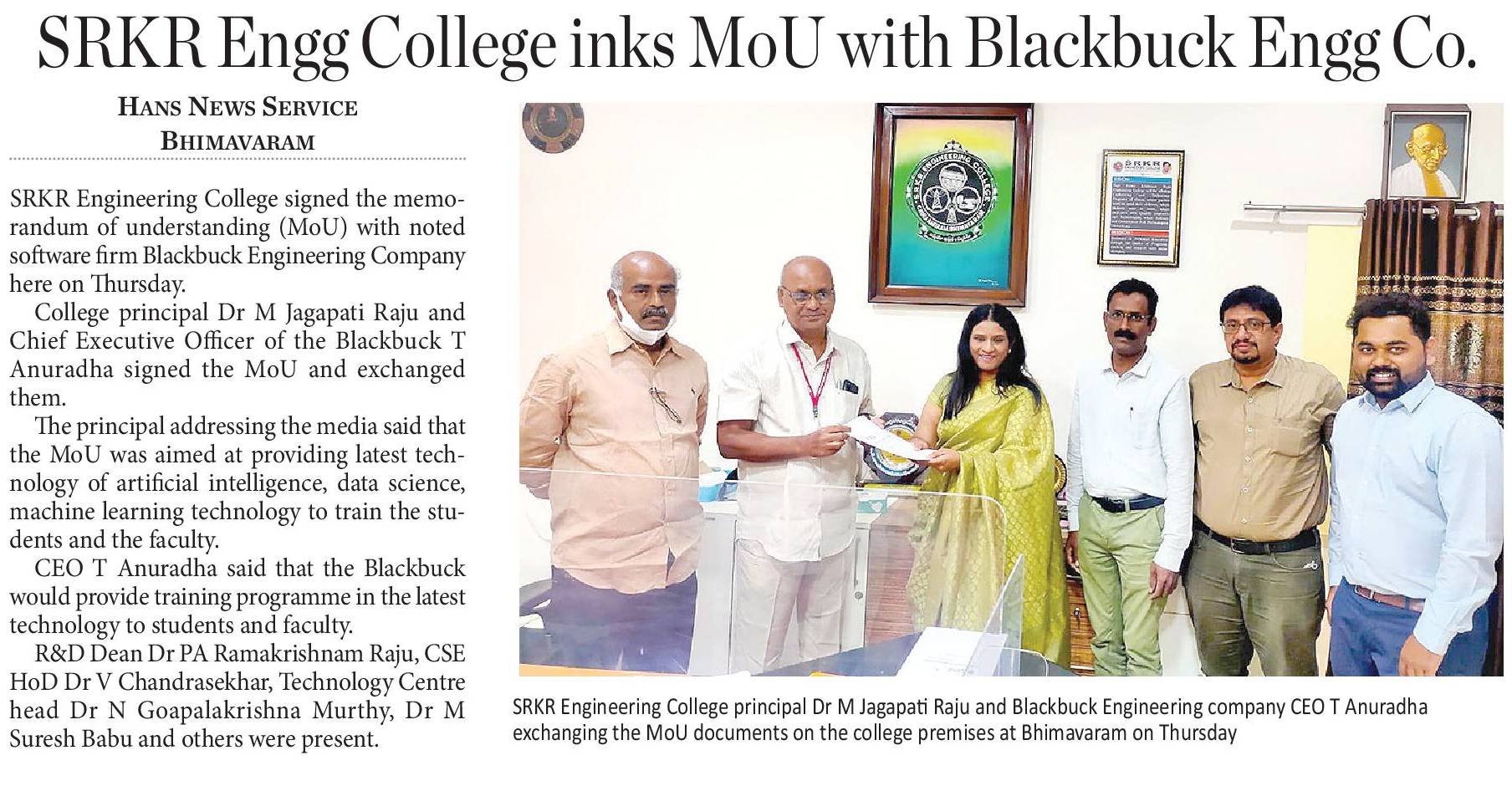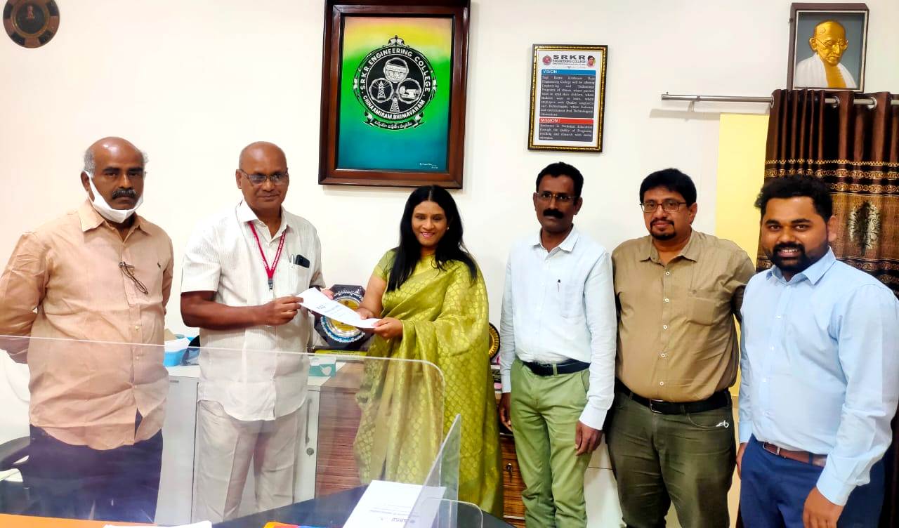 SRKREC signed Memorandum of Understanding with software firm Blackbuck Engineering Company on 27th November 2021. College principal Dr. M. Jagapathi Raju garu and CEO of Blackbuck T Anuradha signed the MoU and exchanged them. The MoU is aimed at providing triaing on latest technologies - Artificial Intelligence, Data Science, Machine Learning for students and faculty of SRKREC.