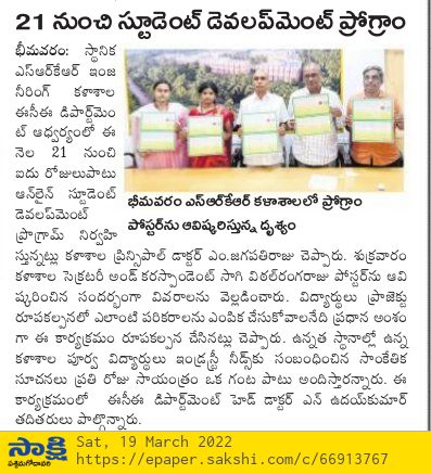 The Dept of ECE at SRKR Engineering College was conducting a one week Online Student Development Programme on "EXPOSURE ON FUNDAMENTALS AND TOOLS USAGE FOR PROJECT IMPLEMENTATION" from 21st March to 25th March, 2022. The poster relating to the same was inaugurated by the Secretary and Correspondent of SRKR Engg College, Sri. S. Vital Ranga Raju garu. This programme was aimed at enlightening the students on various tools that can be used during their project evaluation. The alumni of the college who are in prominent positions in the industry will enlighten the students everyday from 7PM to 8PM as a part of this programme. The Principal of SRKR Engg College Dr. M. Jagapathi Raju and the HOD of ECE Dept Dr. N. Uday Kumar urged the students to make use of this enriching sessions which will provide a platform for the students to equip the latest skills and knowledge through which they can enhance their knowledge.
