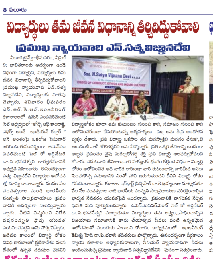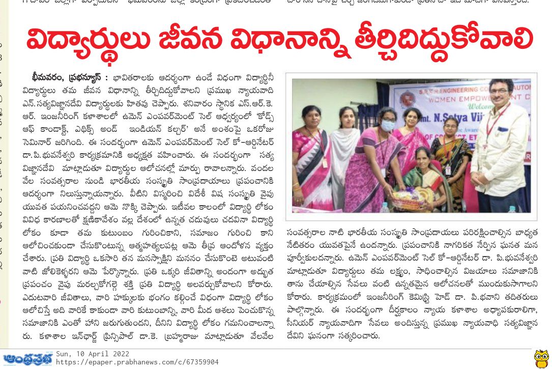 The Women Empowerment Cell at SRKR Engineering College had conducted a seminar on 'Codes of Conduct: Ethics and Indian Culture' on 8 th April, 2022. Prominent Advocate N. Satyavignana Devi has been the chief guest of this seminar. Speaking on this occasion she said that students of this generation should lead a life style which should be the role model for the upcoming generations. She emphasized that students should respect the Indian traditions and culture which are very prominent from the early ages and they should not get distracted towards the foreign culture which will create a negative impact. She said that students should control their emotions and committing suicides in the heat of the moment should be avoided. Incharge Principal of the College Dr. Brahma Raju had said that it is the moral obligation of the student community to protect the rich traditions and heritage of the India for the upcoming generations. Mrs. Devi was felicitated by the college authorities on this occasion. Women Empowerment Cell Coordinator Dr. Bhuvaneshwari has presided over this event along with Dr. P. Bhavani, the Head of the Chemistry Dept.