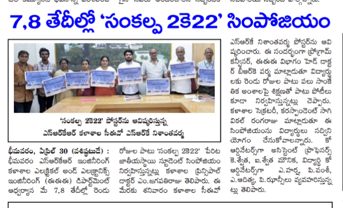 EEE Dept of SRKR was going to organize SANKALP 2K22 a National Level Student Symposium on 7th and 8th of May, 2022 Principal of SRKR Dr. M. Jagapathi Raju had said. The poster of the same was being inaugurated by CEO of SRKR Sri. SRK Nishanth Varma. Program convener and EEE HOD Dr. Varma had said that Students would be given training on various technical issues and various competitions would be conducted on these two days. Secretary and Correspondent of SRKR Sri. SV Ranga Raju had urged the students to make use of this symposium as a way for their bright future. Prof K. Swetha and I. Swetha Mounica will act as faculty coordinators and Mr. A. Harsha, Mr. P. Vamsi, Mr. A. Aditya and Ms. P. Jhansi will act as student coordinators for this symposium.