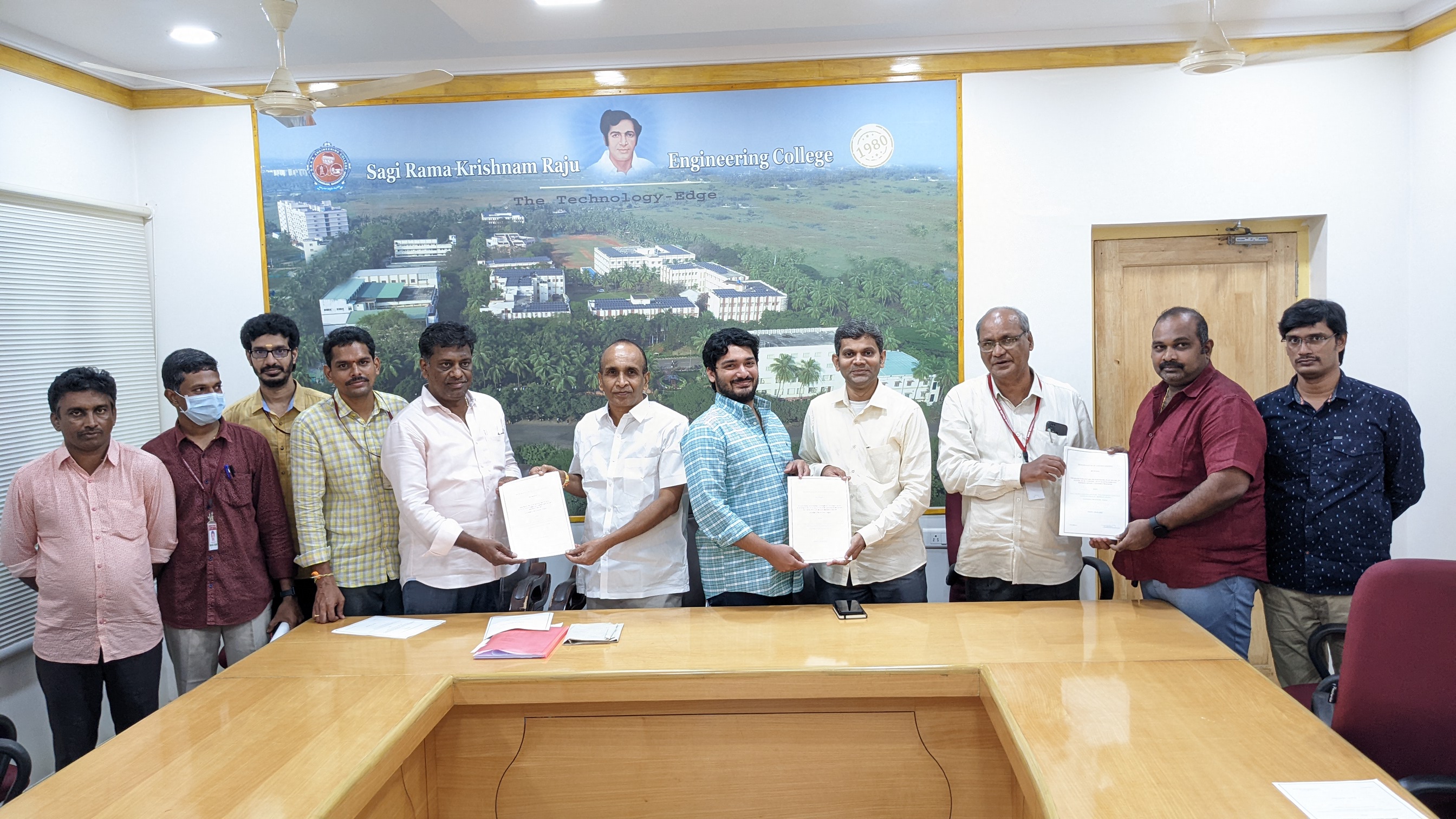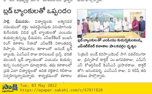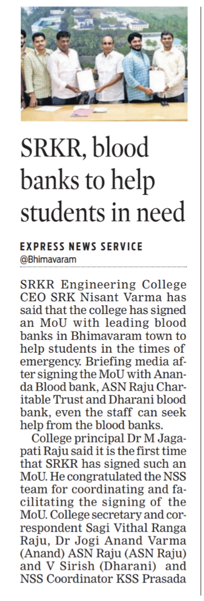 SRKR Engg College had entered an MOU with prominent Blood Banks in Bhimavaram which will facilitate the staff and students to avail blood during the case of emergencies. CEO of SRKR Mr. SRK Nishanth Varma had said that this MOU with Ananda Blood Bank, ASN Raju Charitable Trust and Dharani Voluntary Blood Bank will benefit the students and staff during the unforeseen circumstances. He also said that it is customary to conduct voluntary blood donation camps in the college every year by the students. Secretary & Correspondent of SRKR Sri. SV Ranga Raju, Principal Dr. M. Jagapathi Raju, NSS Coordinator KSN Prasada Raju and Blood Banks representatives Dr. Jogi Anand Varma, Mr. ASN Raju and Mr. V. Sirish took part in this noble activity.