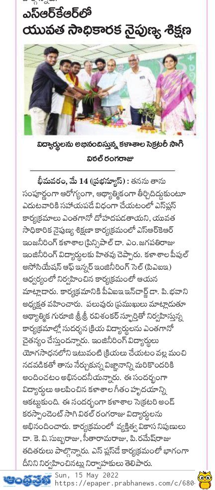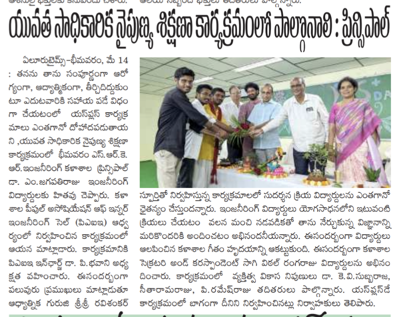 The People Association of Inner Engineering (PAIE) Cell at SRKR had conducted a student empowerment programme ‘YES+ DAY’ on 13th May, 2022. Speaking on this occasion Principal of SRKR Dr. M. Jagapathi Raju had said that students should mould themselves in a healthy and spiritual path towards which they can be of immense help to others and the society. It is with this prime objective that the PAIE Cell was constituted. Dr. P. Bhavani Incharge of PAIE Cell and HOD of Chemistry Dept presided over this meeting. Speaking on this occasion guests had said that various programmes under PAIE Cell including Sudarshan Kriya have been done to help the students with the divine blessings of Pandit Ravi Shankar Ji. Secretary& Correspondent of SRKR Sri. SV Ranga Raju had appreciated the students for being a part of this noble initiative. Personality Development Experts Dr. Subbaraju, Seetharama Raju and P. Ramesh Raju had participated in this programme along with a large number of students.