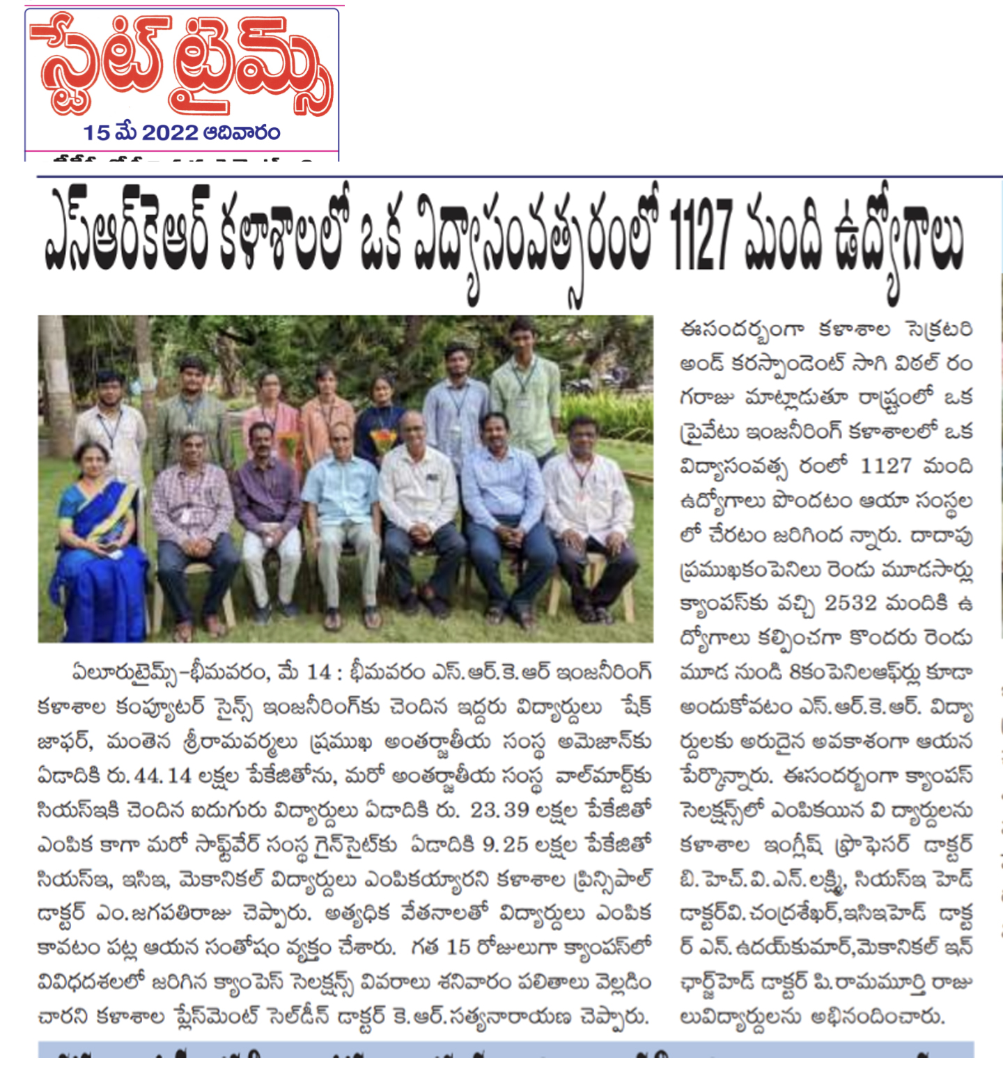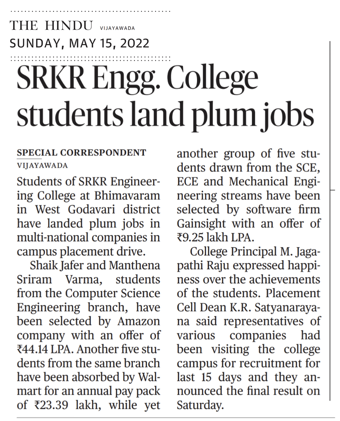 The students of SRKR from different branches excelled in the placements conducted by various premium companies and proved their mettle. The details of the same were released by the Principal of SRKR Dr. M. Jagapathi Raju and Secretary& Correspondent of SRKR Sri. SV Ranga Raju on 13th May, 2022.