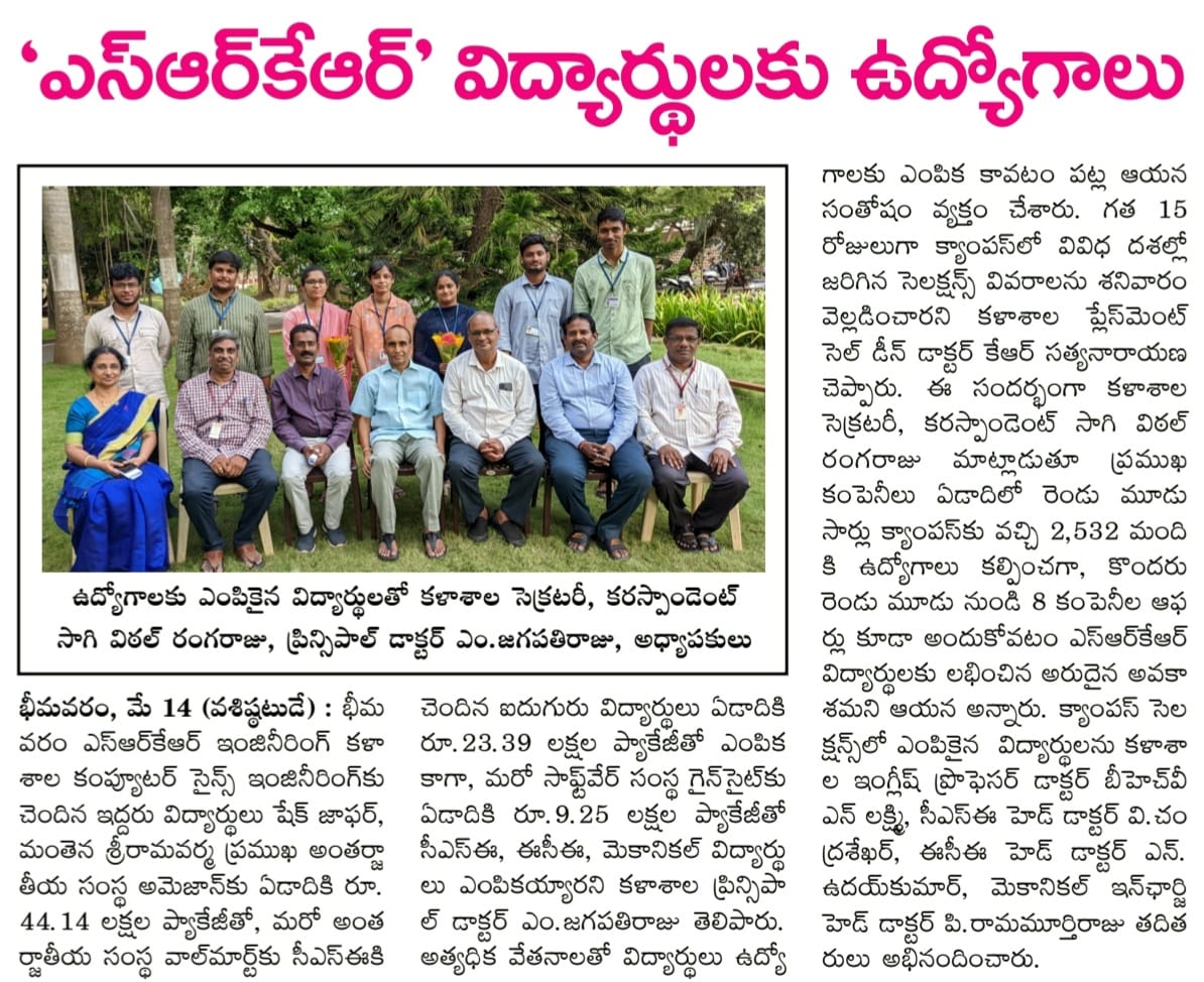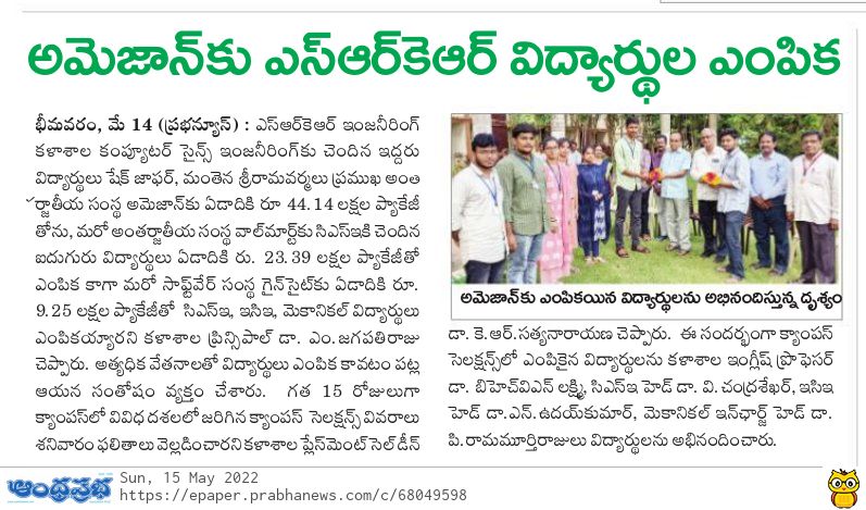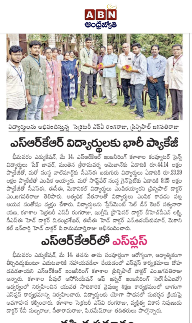 Principal Dr. M. Jagapathi Raju and Secretary& Correspondent of SRKR Sri. SV Ranga Raju had congratulated the students and wished them all the best for their future endeavors. Placement Dean Dr. Satyanarayana had said that many companies had visited the campus this season and many more are yet to visit the campus. HOD's of CSE, ECE, Mechanical and English Departments had participated in this occasion.