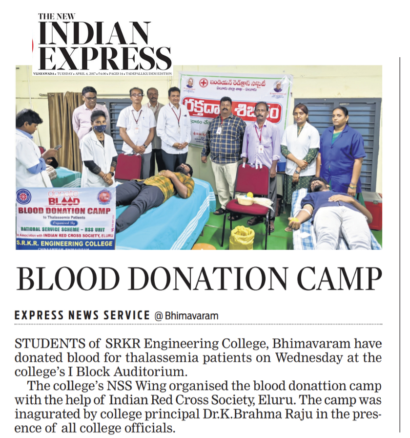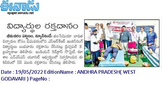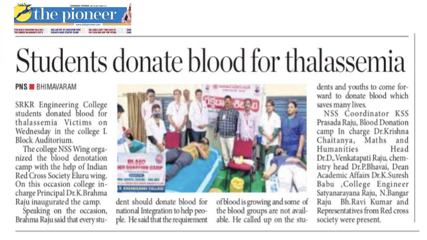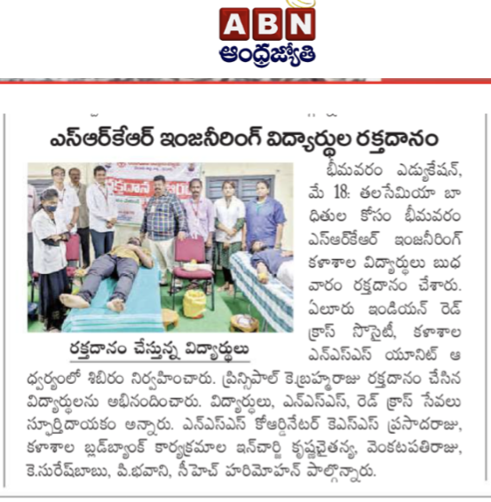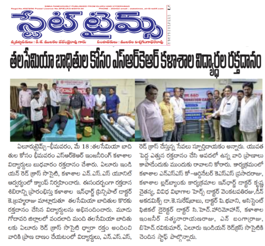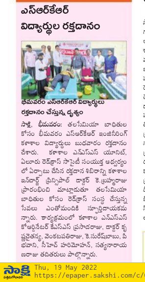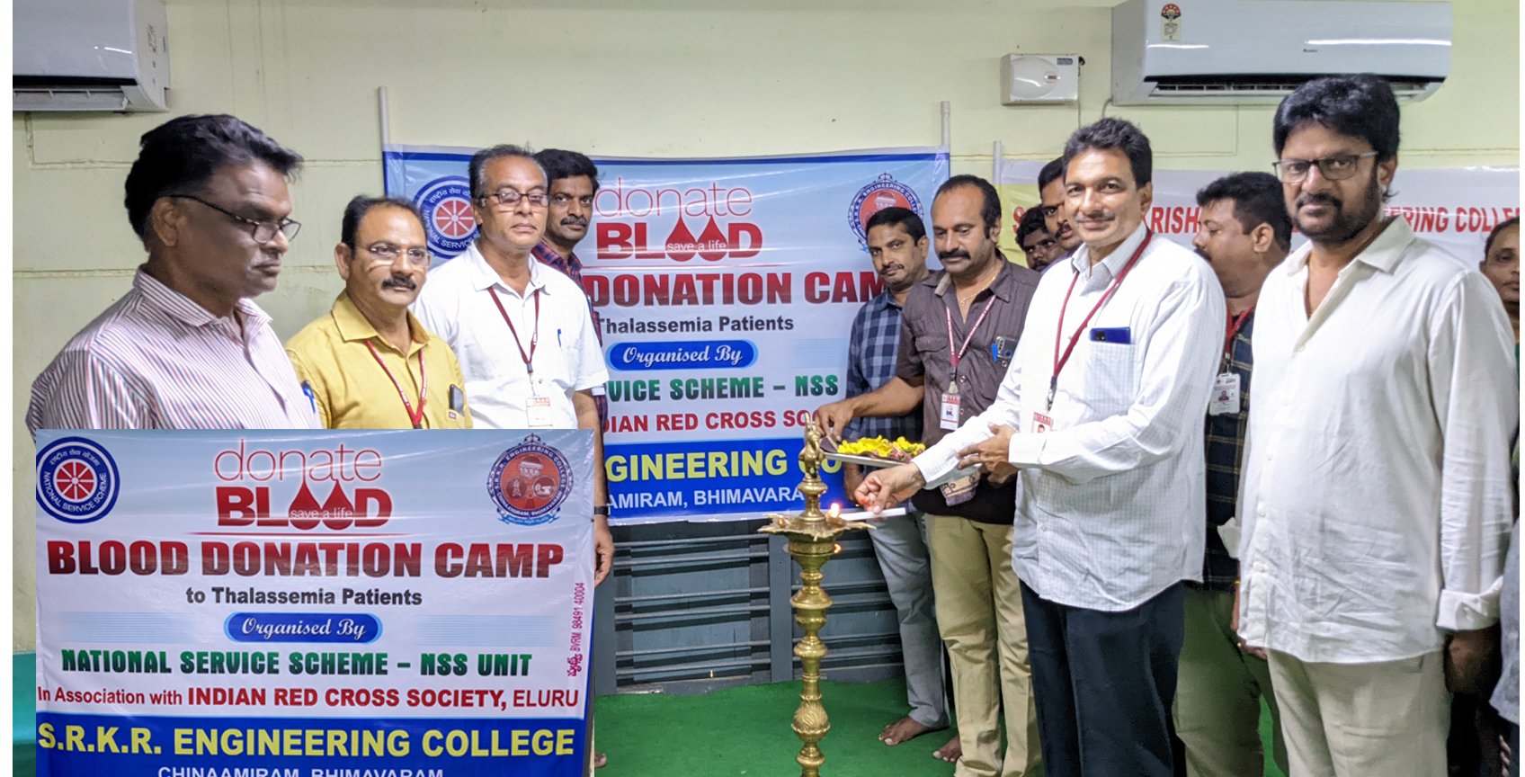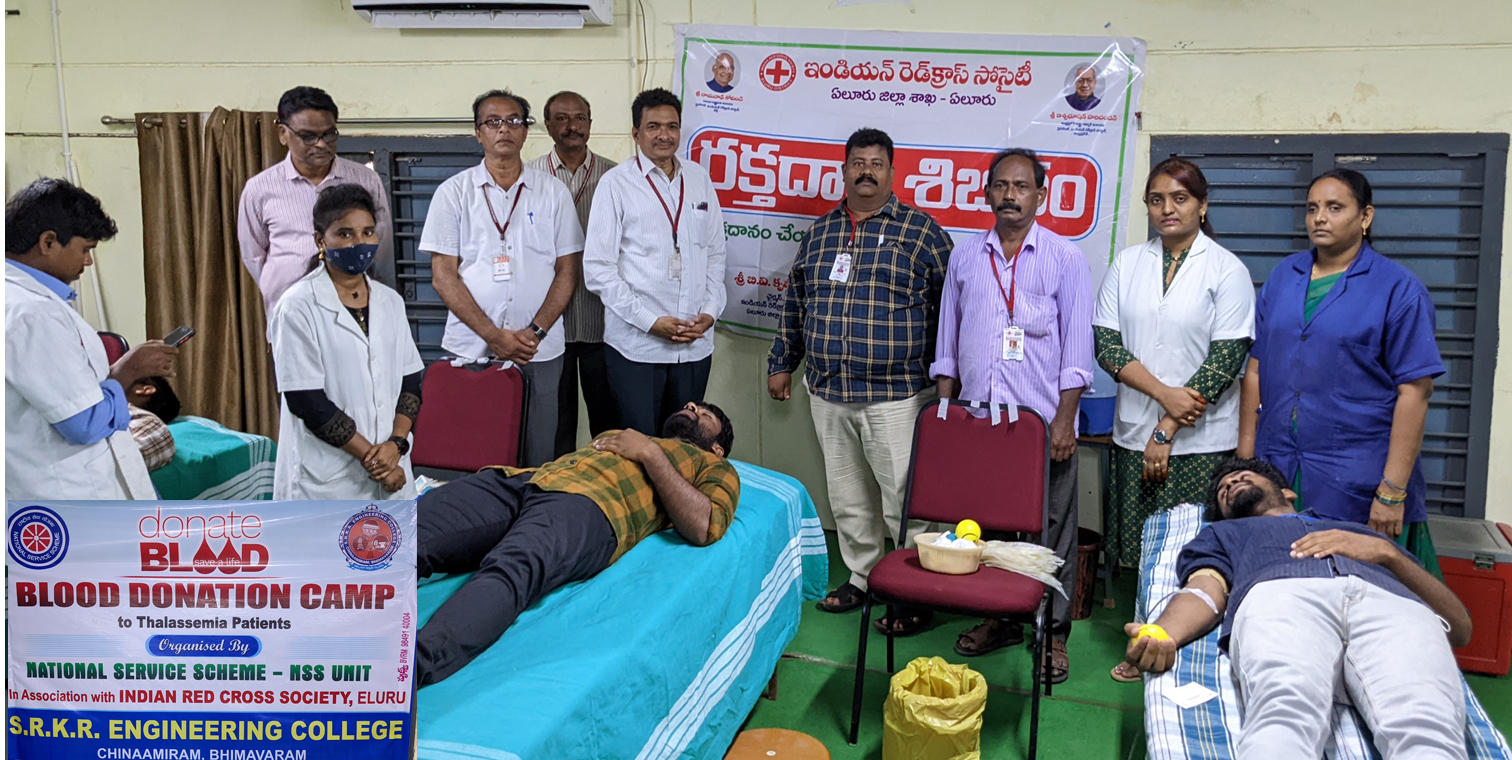 The students of SRKR had donated the blood for the Thalassemia patients at the blood donation camp organized in the college on 18th May, 2022. This camp was organized by the NSS Unit of the college in collaboration with Indian Red Cross Society, Eluru. Speaking on this occasion Incharge Principal and HOD of Mechanical Dept Dr. Brahmaraju had said that it was really a matter of great pride and inspiration that the students are participating voluntarily in this noble event. He lauded the services of the NSS and Indian Red Cross Society. He called the students to donate blood at frequent intervals which is good for health and also of great help to others who are in need of it. NSS Coordinator Prasadraju, Programme Coordinator Dr. Krishna Chaitanya, Head’s of various departments Dr. D. Venkatapathi Raju, Dr. P. Bhavani, Dean-Academics Dr. K. Suresh Babu, Assistant Physical Director Dr. Ch. Harimohan, College Engineer Satyanarayana Raju and other staff members participated in this programme.