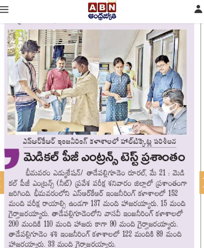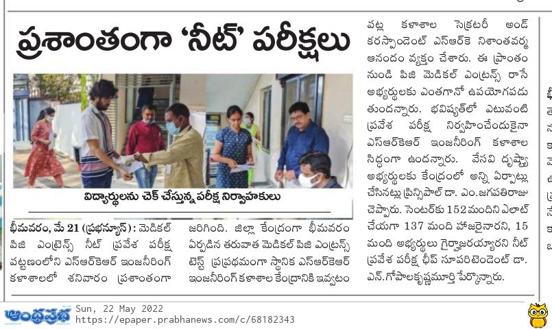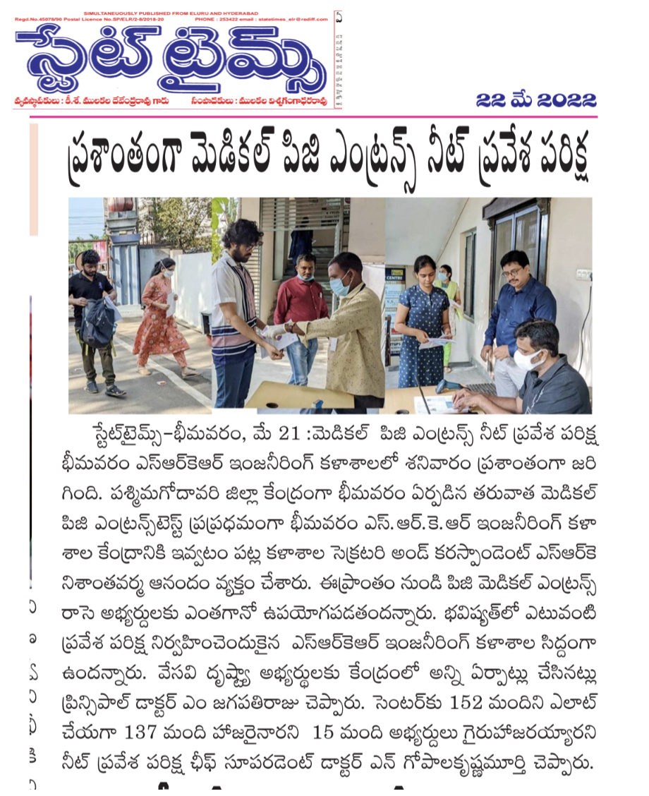 Medical PG Entrance examination NEET was conducted in a peaceful manner at SRKR on 21st May, 2022. This was the first time that SRKR was allotted as the examination center for NEET after Bhimavaram was announced as the district headquarters for the new West Godavari District. SRKR Secretary&Correspondent Sri. SRK Nishant Varma said that it was really a matter of pride for the SRKR to be allotted as the test center and he said that SRKR is ready to host as center for any national level examinations. Principal of SRKR Dr. M. Jagapathi Raju had said that all the arrangements were made for the candidates appearing for NEET keeping in view the temperature and climatic conditions. Total of 152 students were allotted and 137 were present and 15 were absent for the examination. Dr. N. Gopalakrishna Murthy acted as the Chief Superintendent for this examination.