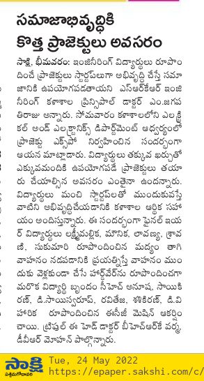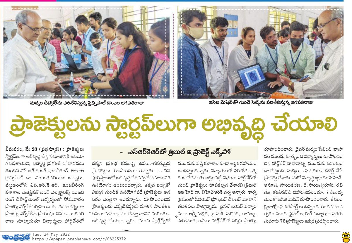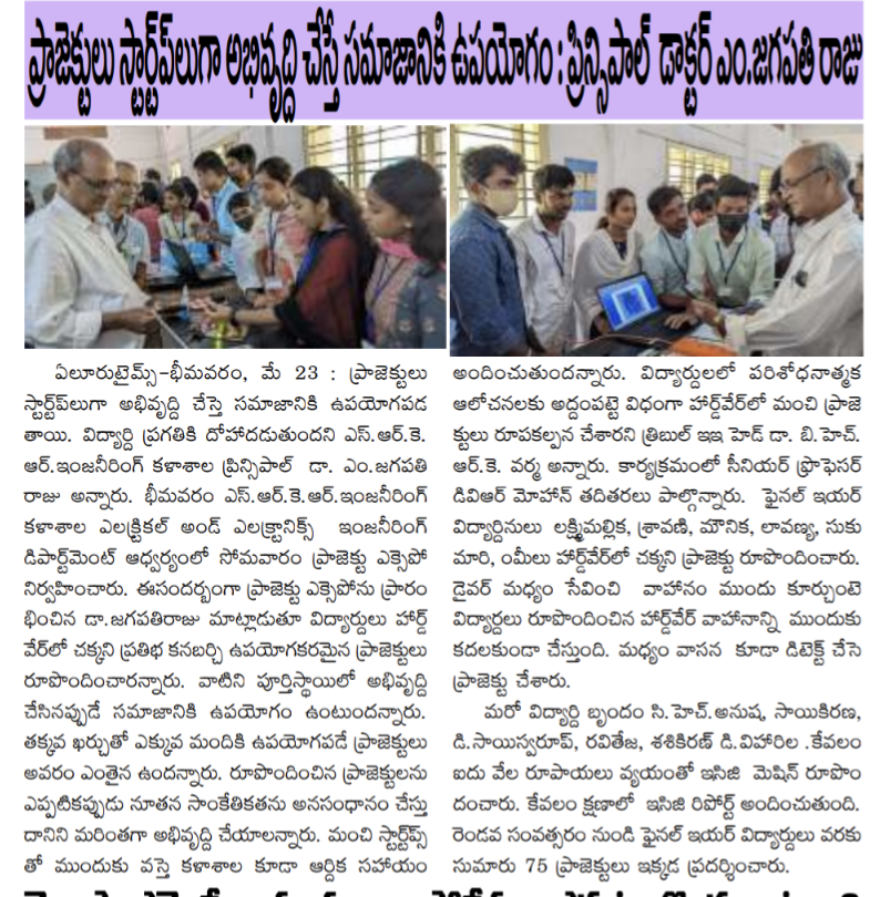 The Dept of EEE had conducted Project Expo on 23rd May, 2022. Speaking on this occasion Principal Dr. M. Jagapathi Raju had said that students should convert these projects into startups and then only it would be beneficial to the society. He said that students should do projects with minimum investment and maximum results. He emphasized that if students come forward with good projects, college is ready to invest in them and mould them into startups. Special attraction of this expo was the project which will not allow the vehicle to go forward if the driver is drunk and the ECG machine that was developed by the students. EEE Dept HOD Dr. Varma and faculty DVR Mohan also took part in this expo.