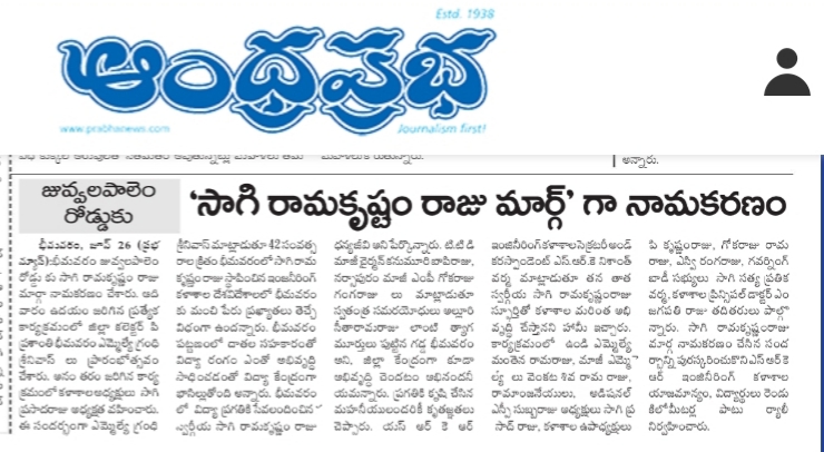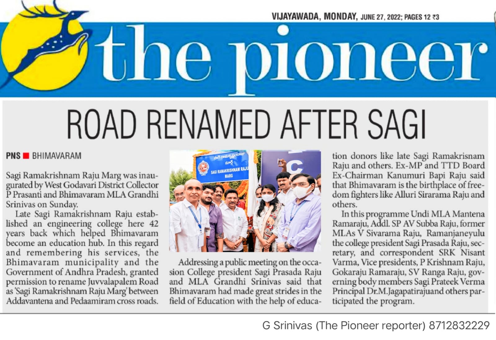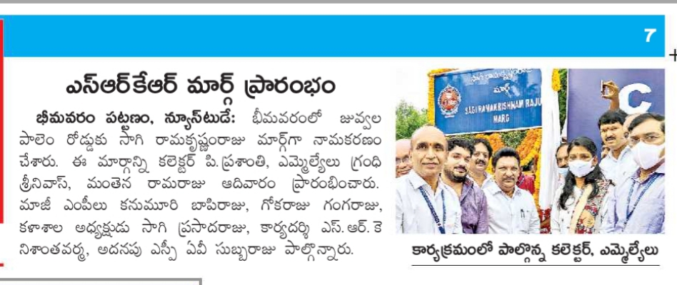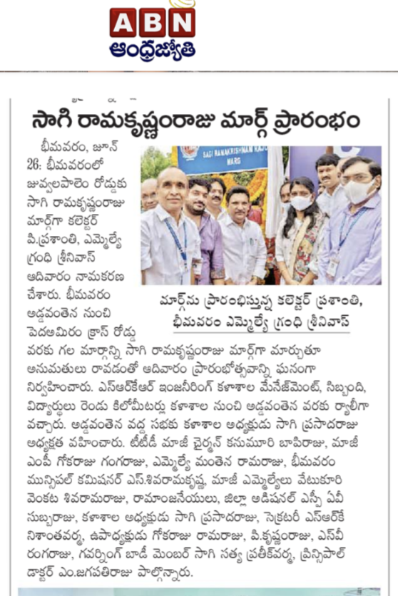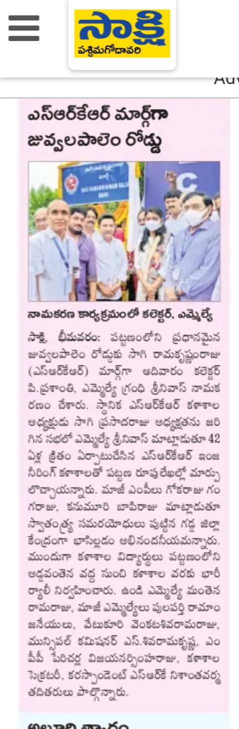 The prominent road in Bhimavaram which is called as Juvvalapalem Road until now has been officially named as 'Sagi Ramakrishnam Raju Marg' on 26th June, 2022 by MLA of Bhimavaram Mr. Grandhi Srinivas, Collector and District Magistrate of West Godavari District Mrs. P. Prashanthi IAS, Muncipal Commissioner of Bhimavaram Mr. S. Sivarama Krishna, President of SRKR Mr. S. Prasad Raju, Secretary & Correspondent of SRKR Mr. SRK Nishanth Varma, GB Members of SRKR in the presence of many prominent people of the city, Staff Members of SRKR and Students. Celebrating this occasion, the Leadership of SRKR along with the staff and students had conducted a rally in the SRKR Marg. Speaking on this occasion Mr. Grandhi Srinivas had said that Bhimavaram had become an educational hub based on the foundation of Mr. Sagi Ramakrishnam Raju. President of SRKR Mr. Prasad Raju had congratulated the govt for its noble gesture. Secretary Cum Correspondent of SRKR Mr. SRK Nishanth Varma had said that all the steps would be taken to carry forward the legacy of Mr. Sagi Ramakrishnam Raju. Principal of SRKR Dr. M. Jagapathi Raju had emphasized the prominence of SRKR in the country. Many Prominent Leaders, Police Officials and large number of people attended this occasion.
