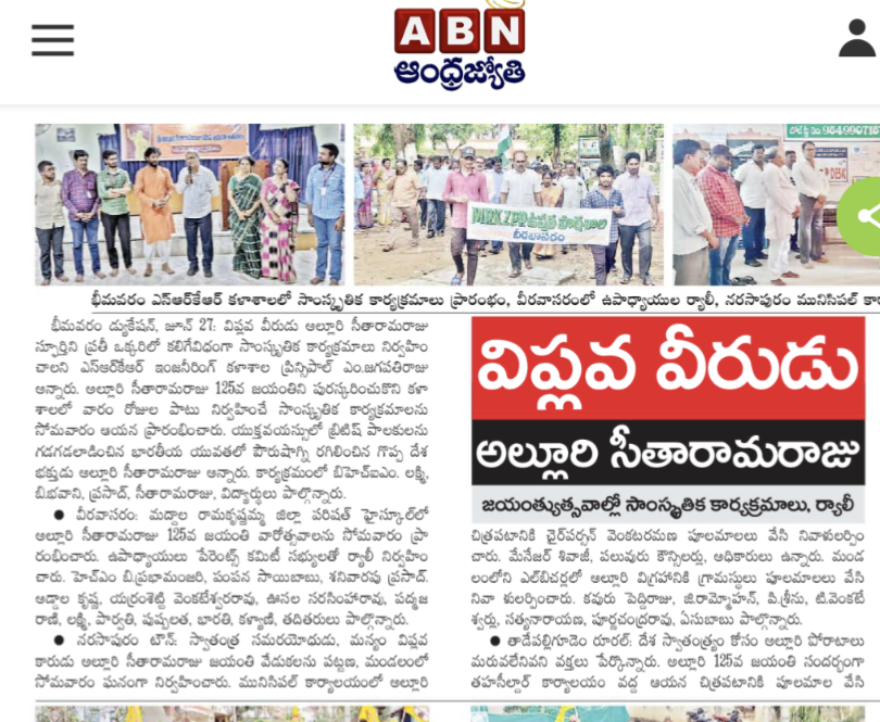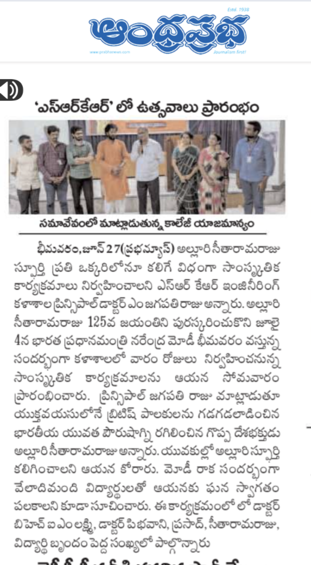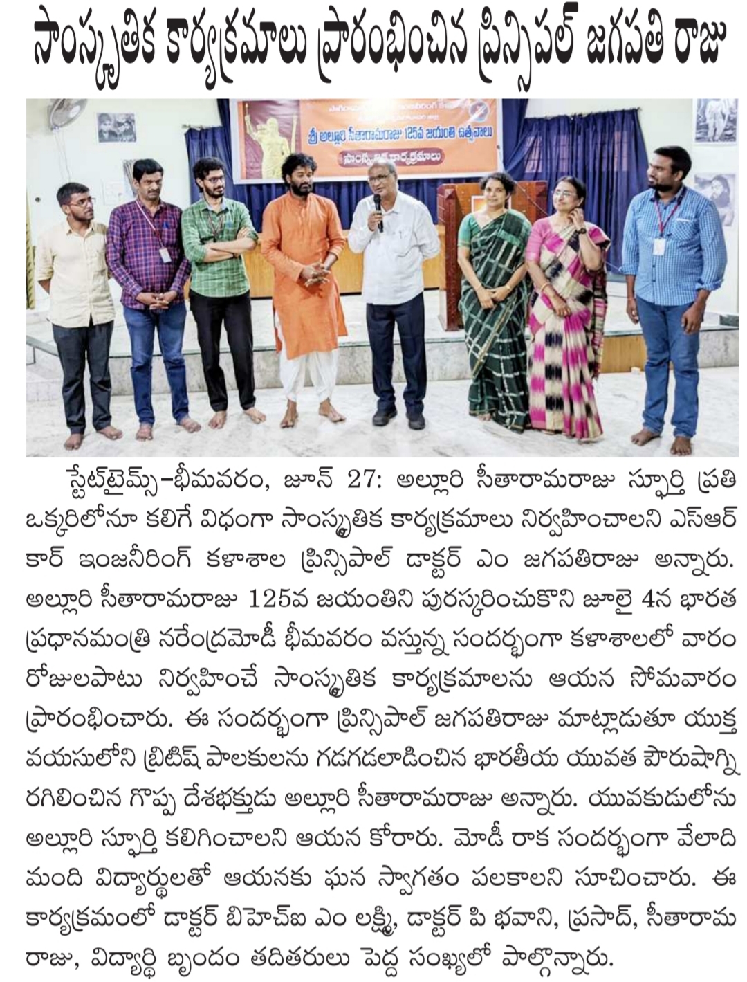 The 125th Anniversary Celebrations of Prominent Freedom Fighter Sri. Alluri Sitarama Raju had begun at SRKR Engg College on 27th June, 2022. These celebrations had gained major importance in view of the visit of the Honourable Prime Minister of India Mr. Narendra Modi to Bhimavaram on 4th of July, 2022. Speaking on this occasion Principal of SRKR Dr. M. Jagapathi Raju had said that these celebrations should inspire everyone regarding the life and passion of Alluri Sitarama Raju. He said that Alluri had inspired many people in his tender age and made them revolt against the British empire. The youth of this generation should learn about him and imbibe his leadership qualities. He inspired the students to welcome the Honourable PM of India in a very grand manner. Dr. Lakshmi, Dr. Bhavani. Mr. Seetharamaraju, Mr. Prasad and a large number of students took part in this occasion.