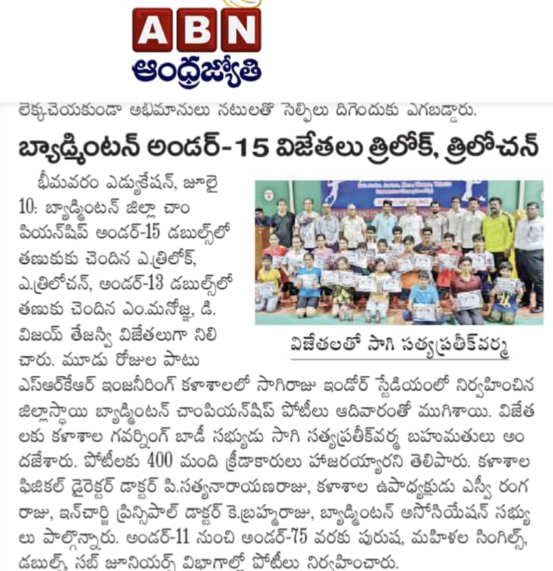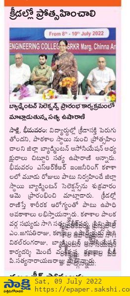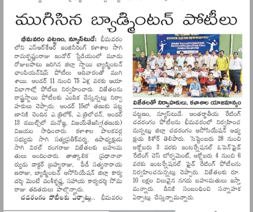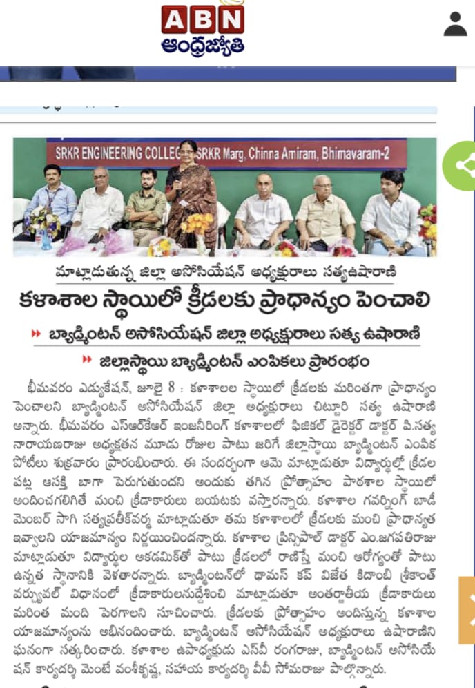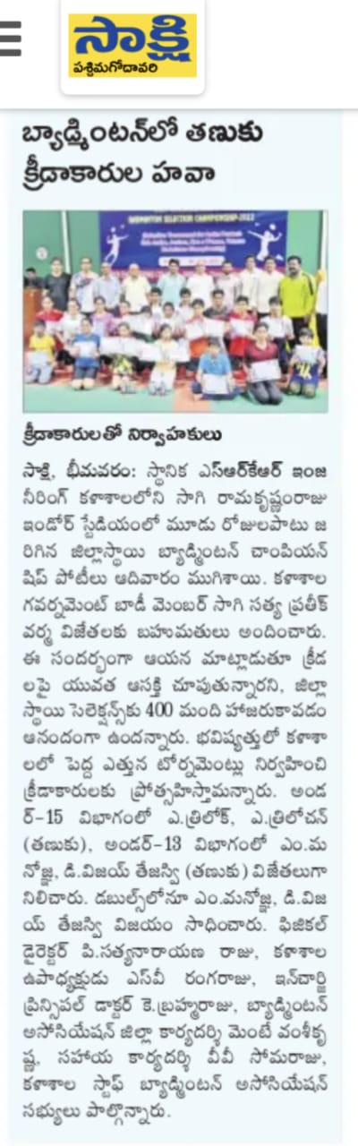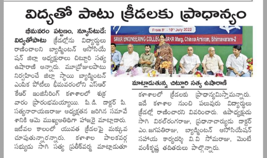 The Badminton selections of the old West Godavari District are going to be conducted at the SRKR Engineering College, Bhimavaram from 8th of July, 2022 said Secretary of the District Association Mr. Vamsi Krishna and Organising Secretary Dr. P. Satyanarayana Raju. Interested players are requested to submit the entries by the end of the day on 7th July, 2022. Winners of this selections will be playing at the State Level Championship. Principal of SRKR and Tournament Convener Dr. M. Jagapathi Raju had requested the interested players to avail this opportunity and he thanked the management or SRKR for their valuable support in conducting this event.