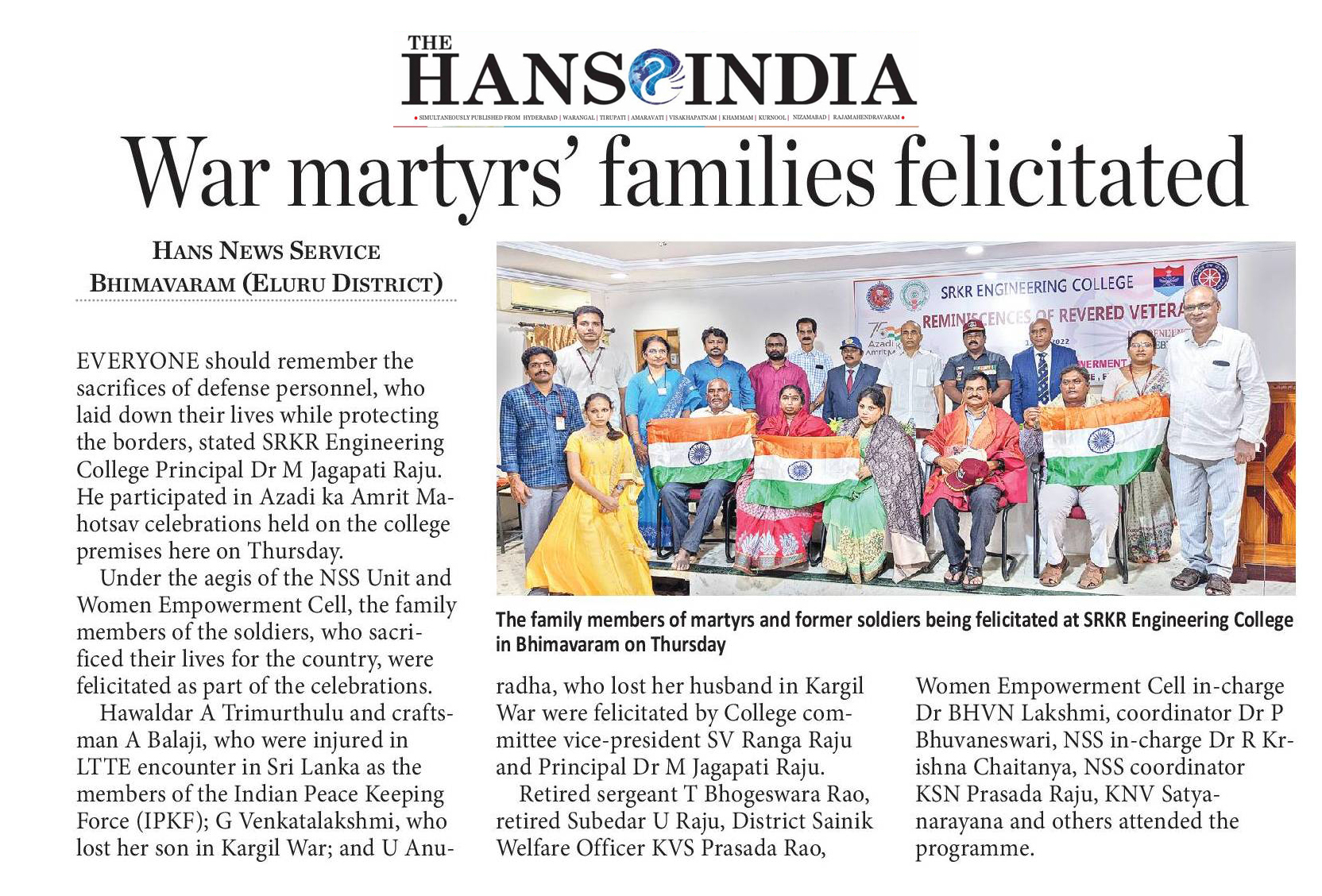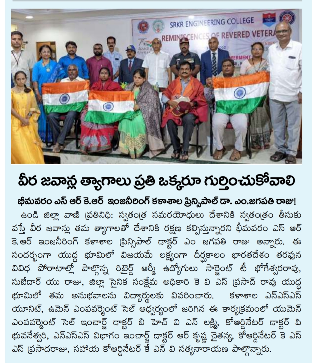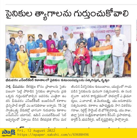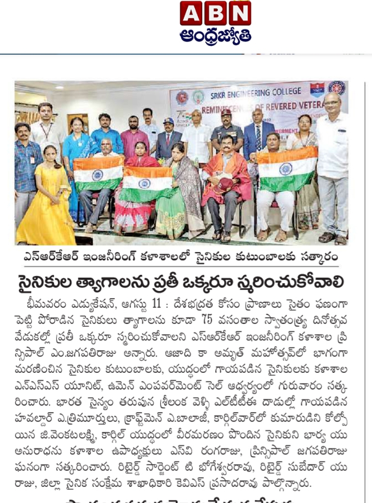 SRKR Engineering College in collaboration with NSS Unit and Women Empowerment Cell had felicitated the War Martyr's families and the army personnel who were injured in line of duty on 11th August, 2022 on the occasion of 'Azaadi Ka Amrit Mahotsav'. Speaking on this occasion, Principal of SRKR Dr. M. Jagapathi Raju had said that it is the duty of everyone to recognize the efforts of the martyrs and other army personnel sacrifices. Havaldar A. Trumurthulu, G. Balaji, A. Venkata Lakshmi, U. Anuradha were being felicitated. Vice President of SRKR Sri. SV Ranga Raju, Retired Sargent T. Bhogeswara Rao, U. Raju, District Sainik Welfare Officer Mr. Prasada Rao, Dr. P. Bhuvaneshwari, R. Krishna Chaitanya took part in this noble occasion.