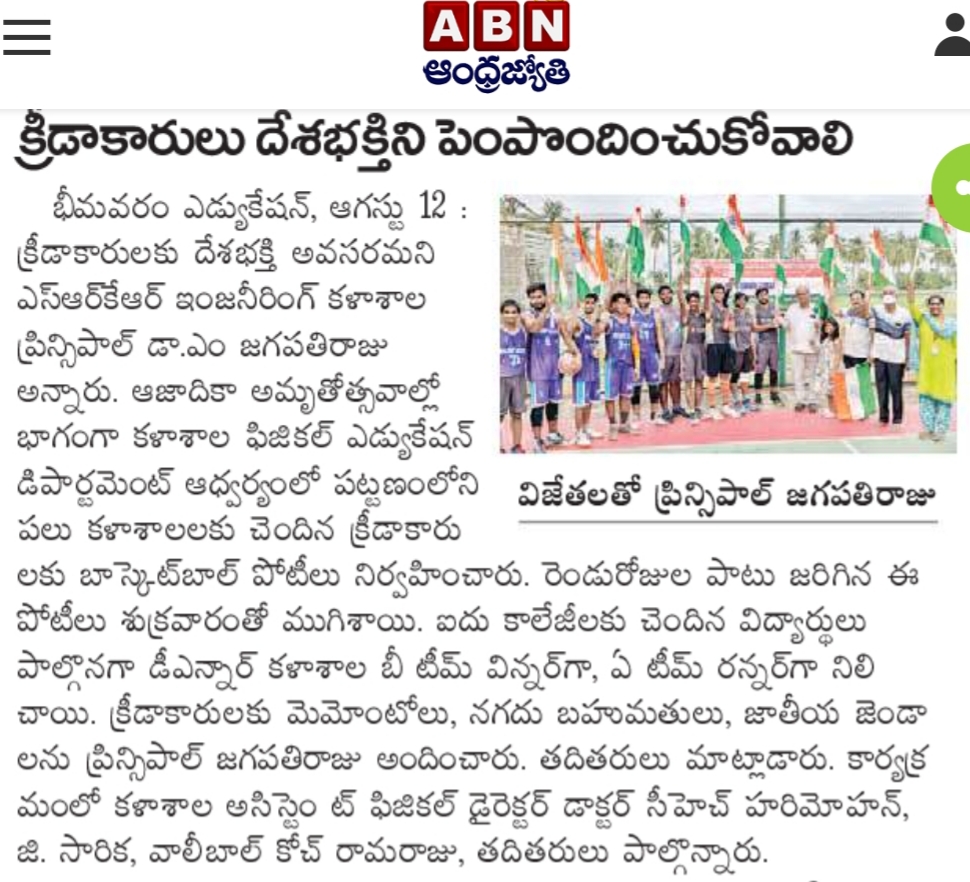 SRKR Engineering College Physical Education Department had conducted Basketball competitions on the occasion of 'Azaadi Ka Amrit Mahotsav' to various colleges in Bhimavaram. Speaking on this occasion, Principal of SRKR Dr. M. Jagapathi Raju had said that sportspersons should show patriotism towards the country along with the sportive spirit. These competitions were being held for two days in which DNR College had emerged as winner in B Team and as runner in A team. Cash Awards, Mementoes and National Flags were being distributed to the players on this occasion. Physical Education Dept Staff Dr. Harimohan, Ms. Sarika, Mr. Ramaraju took part in this event.