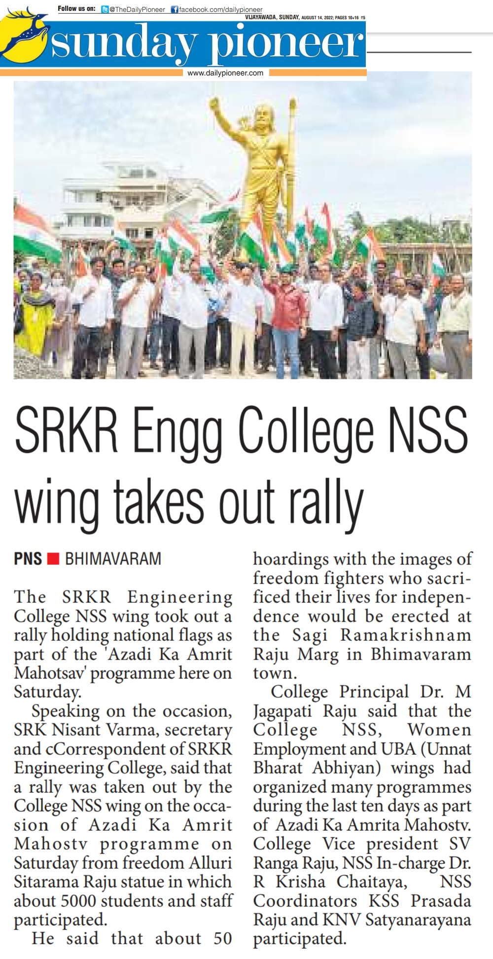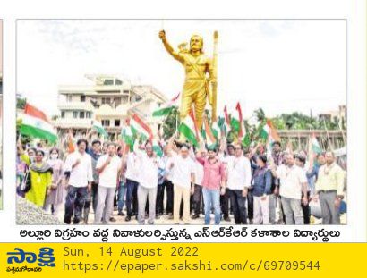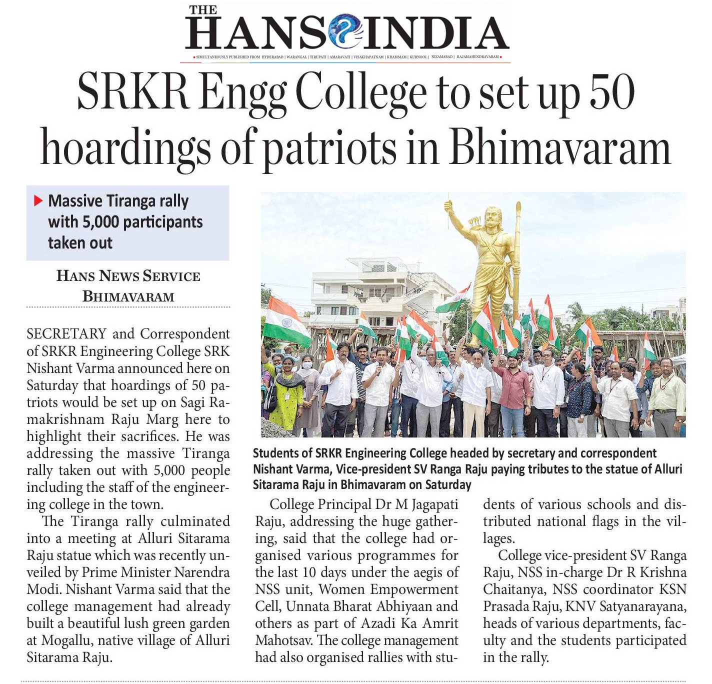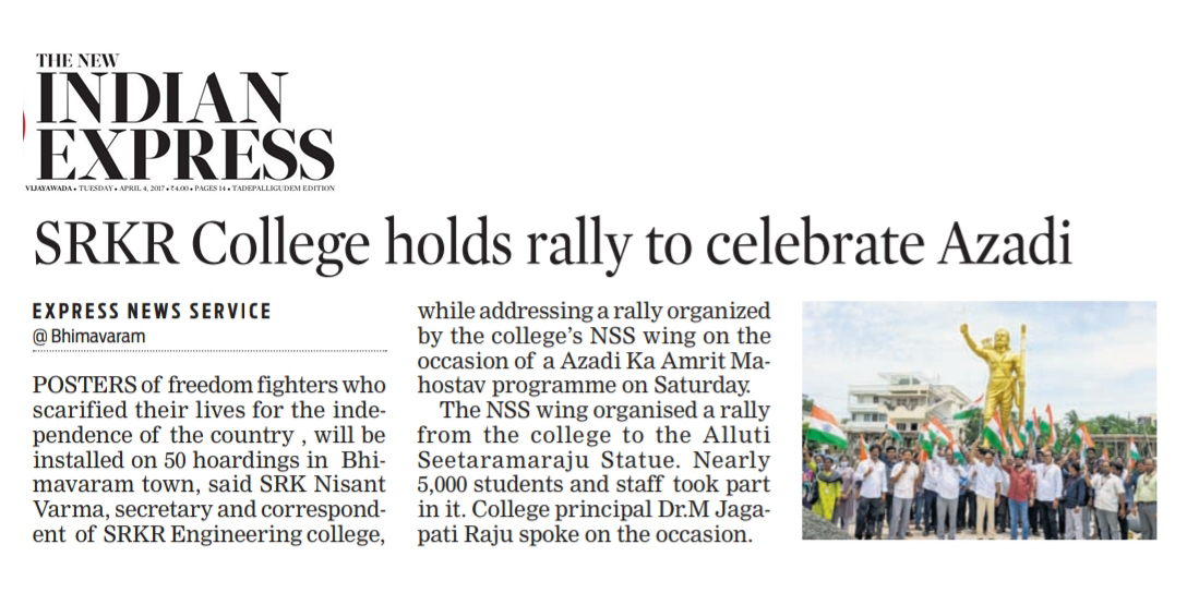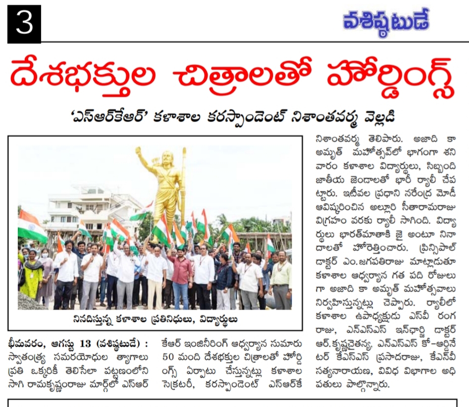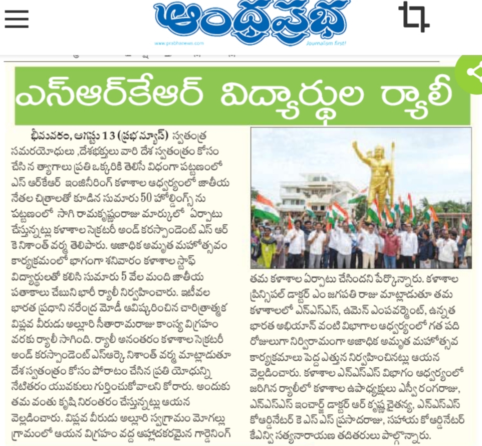 SRKR Engineering college had held a massive rally with 5000 staff and students from college to Alluri Seetharamaraju statue on the occasion of 'Azaadi Ka Amrit Mahotsav'. Speaking on this occasion SRKR Secretary and Correspondent Sri. SRK Nishanth Varma had said that around 50 hoardings of prominent freedom fighters will be installed in Bhimavaram town on the occasion of 75 Years of Indian Independence. SRKR College in association with Women Empowerment Cell and NSS had been conducting many programmes from the last 10 days in celebrating this jubilant occasion and it is the duty of everyone to remember the sacrifices of the freedom fighters and army personnel in this august moment. Principal of SRKR, Dr. M. Jagapathi Raju, Vice President of SRKR Sri. SV Ranga Raju, NSS In charge Dr. Krishna Chaitanya, NSS Coordinator Sri. Prasad Raju, staff and students took part in this occasion.