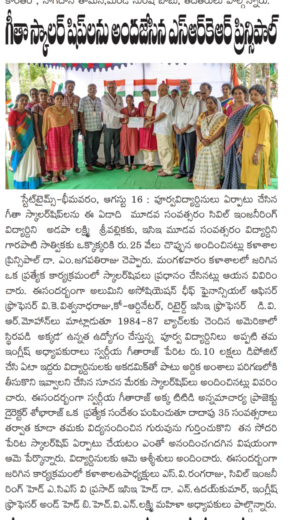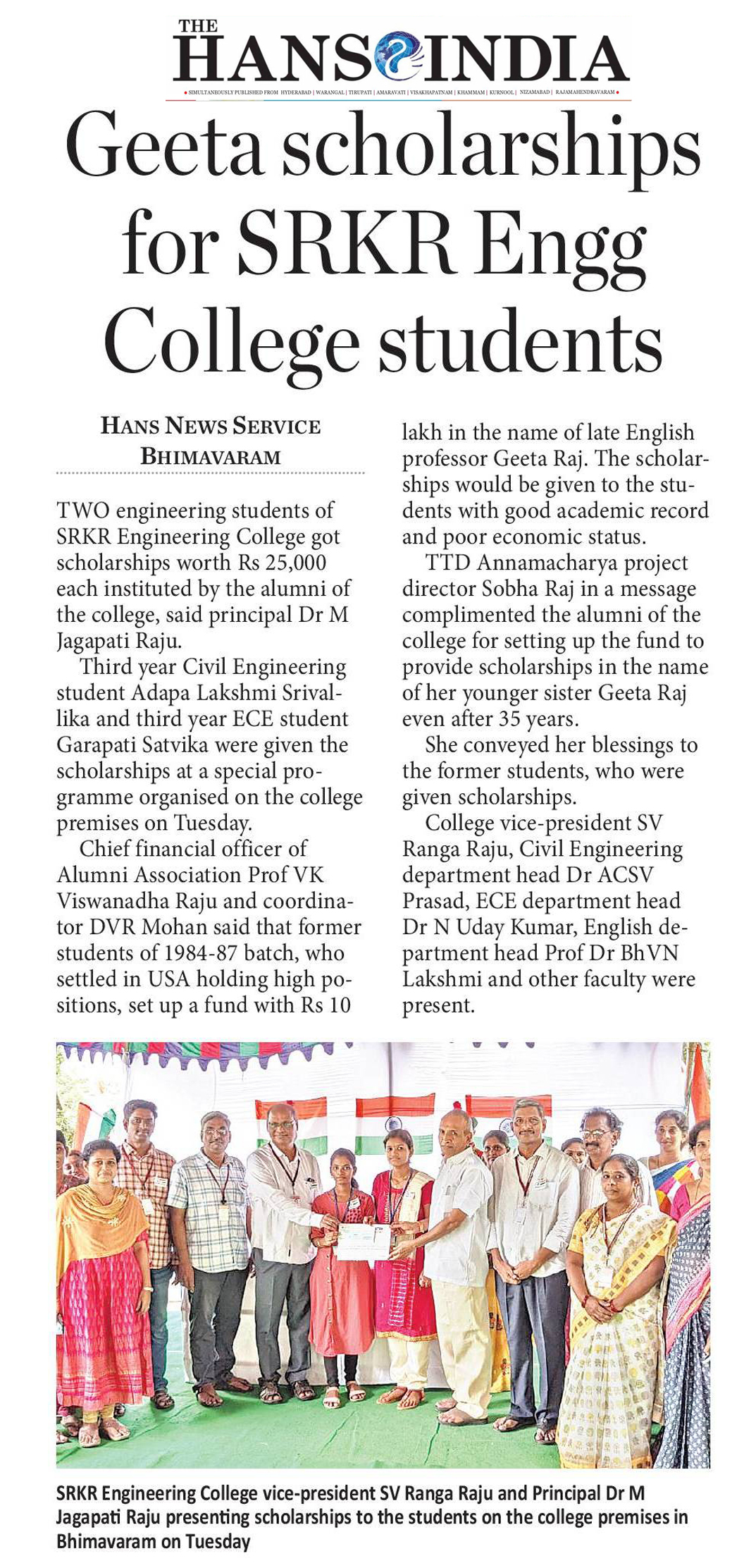 Two SRKR students were given scholarships worth Rs.25000/- instituted in the name of Former Professor Ms. Geetharaj by the 1984-87 batch students. These scholarships were given to the students with good academic record and poor financial status. These scholarships were given to III Year Civil student Ms. Srivallika and III Year ECE student Ms. Satvika. TTD Annamacharya Project Director Smt. Shobaraj, who was the sister of Late. Geethraj, lauded the efforts of the alumni in giving these scholarships. College Vice President Sri. SV Rangaraju, Principal Dr. M. Jagapathi Raju and representatives of the alumni association participated in this event.