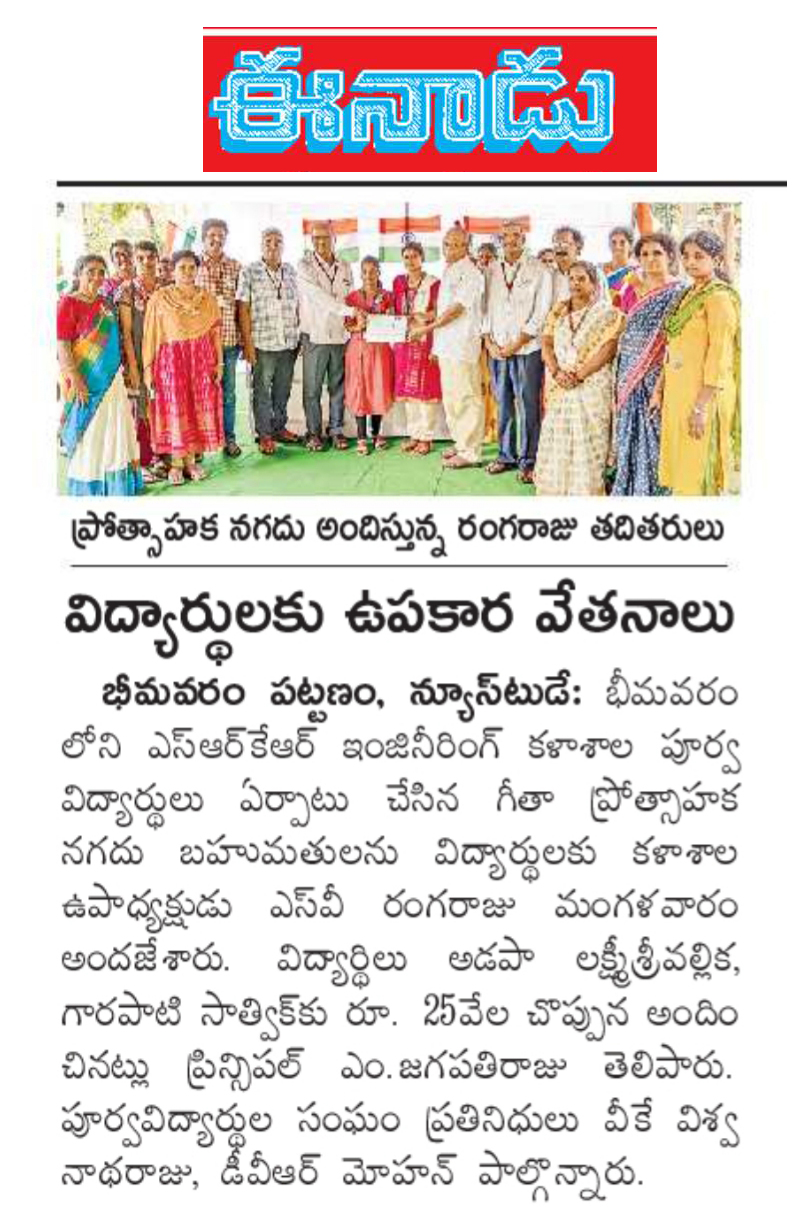 Merit Scholarships of Rs. 25000 each bestowed in the name of Origanti Sundari were being awarded to ECE Final Year Student Ms. Kusuma and Civil Final Year Student Ms. Saranya by Principal of SRKR Dr. M. Jagapathi Raju and Vice President of SRKR Sri. SV Ranga Raju. Speaking on this occasion Alumni Association Coordinators Dr. Viswanadha Raju and Prof. Subbarao had said that these scholarships were being donated by ECE 1995 batch student and presently the Vice President of Multi Billion Dollars Bank Q2 in US Mr. Origanti Siva Bharat. Civil HOD Dr. Prasad and ECE HOD Dr. Uday Kumar took part in this event.