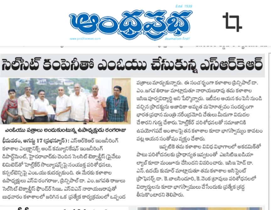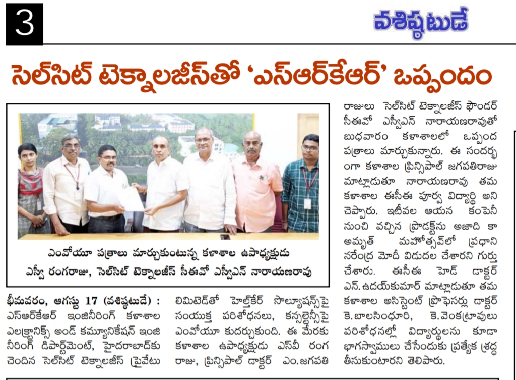 SRKR Engineering College had entered an MOU with Hyderabad based 'SALCIT Technologies Pvt Ltd' to work mutually on research pertaining to healthcare solutions and consultancy services. The agreement documents regarding the same were mutually exchanged by the Vice President of SRKR Sri. SV Ranga Raju, Principal of SRKR Dr. M. Jagapathi Raju and SALCIT Technologies founder CEO Sri. SVN Narayana Rao. Speaking on this occasion, Principal of SRKR Dr. M. Jagapathi Raju had said that Sri. Narayana Rao was an elite alumnus of SRKR and his product was recently inaugurated by PM Modi on the occasion of 'Azaadi Ka Amrit Mahotsav'. HOD of ECE Dr. Udaykumar had said that Assistant Professors of ECE Dr. Balasindhuri and Venkata Rao with the students of ECE will take this collaborative research ahead.