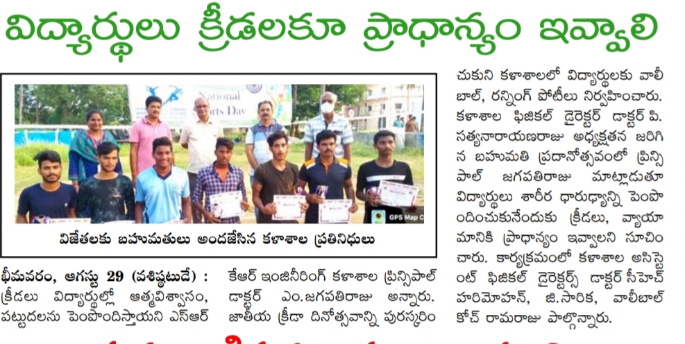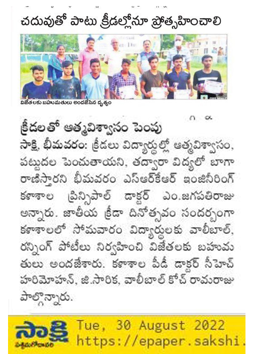 National Sports Day Celebrations were held in a grand manner at SRKR Engineering College and various sports events such as Volley Ball and Running competitions were held and prizes were distributed to the winners by the Principal of SRKR, Dr. M. Jagapathi Raju. Speaking on this occasion, he said that sports will increase self-confidence and zeal through which students may further advance in studies. Physical Education Dept Staff Dr. Satyanarayana Raju, Sri. Harimohan, Smt. Sarika, Volleyball Coach Sri. Ramaraju took part in this event.