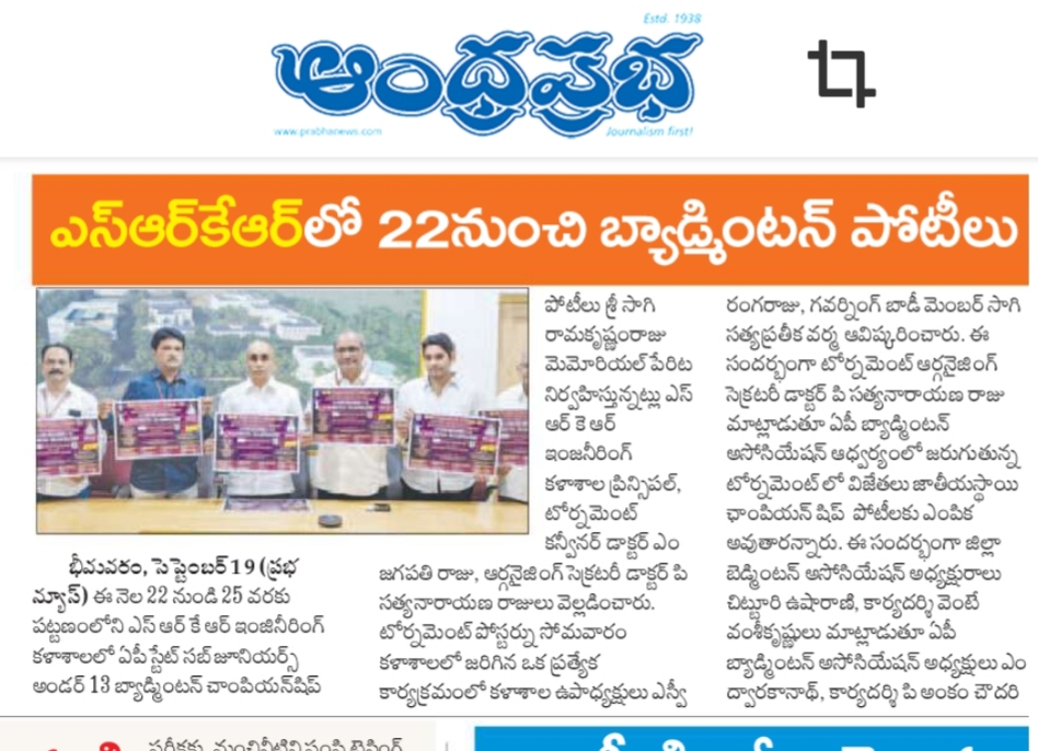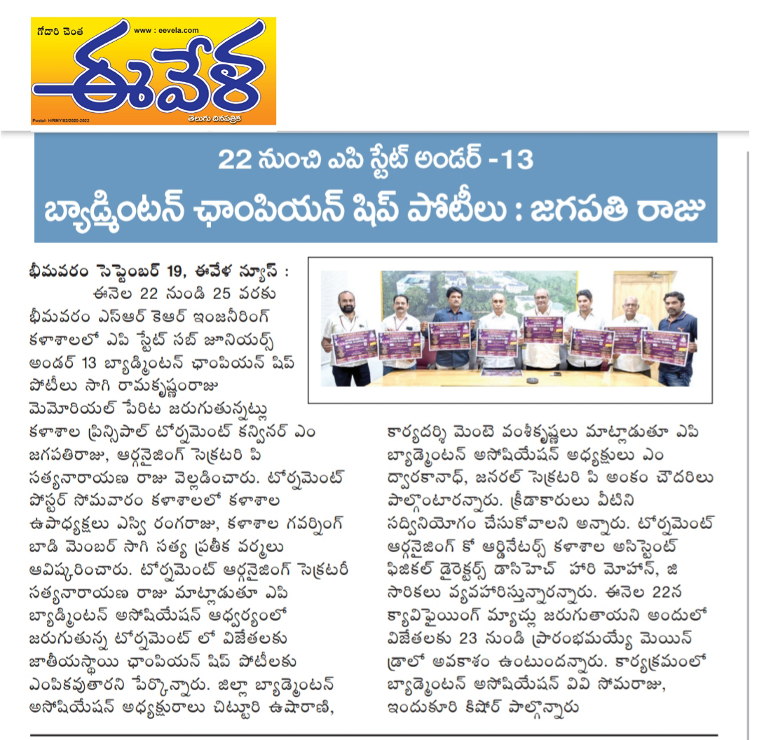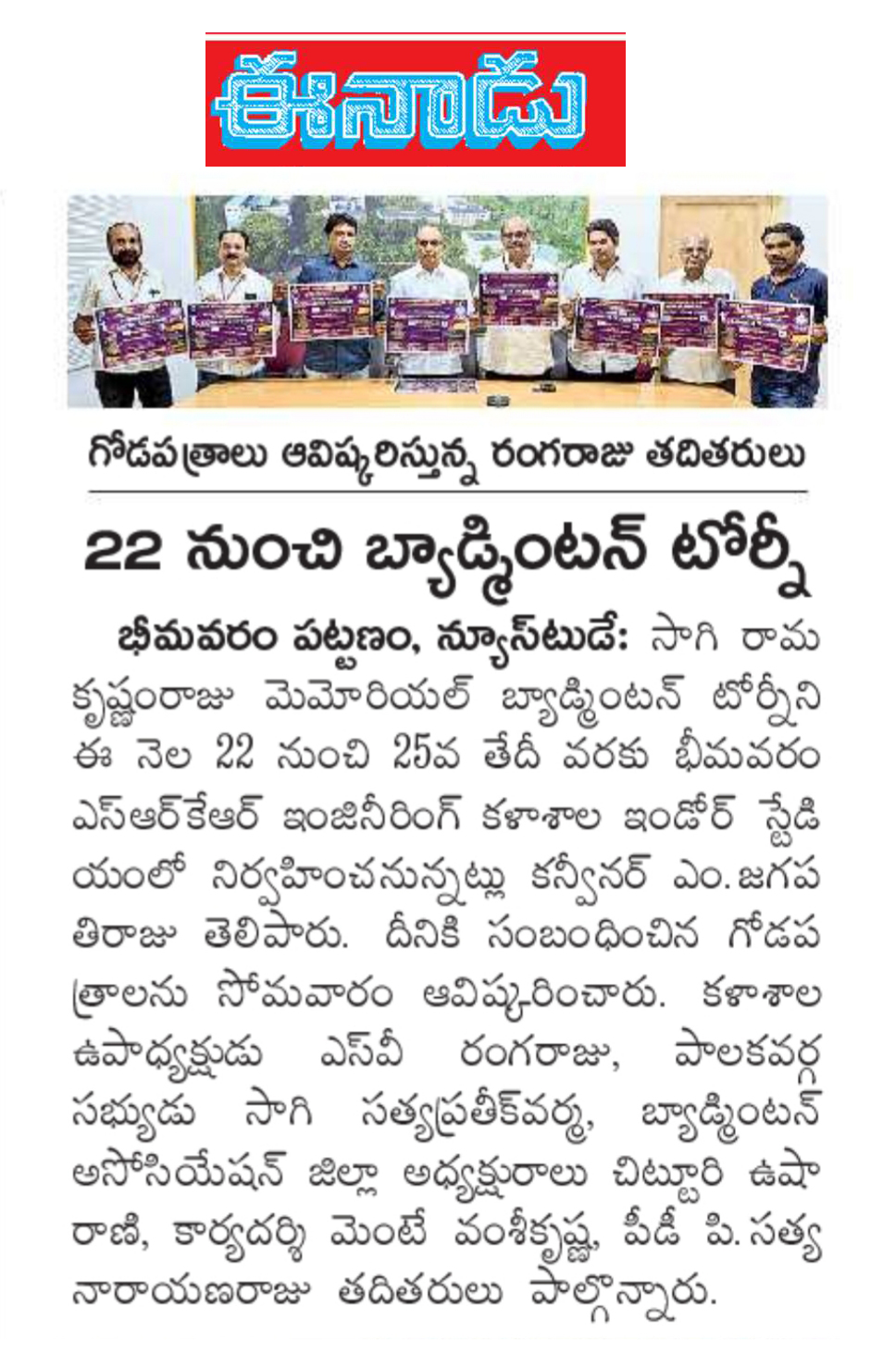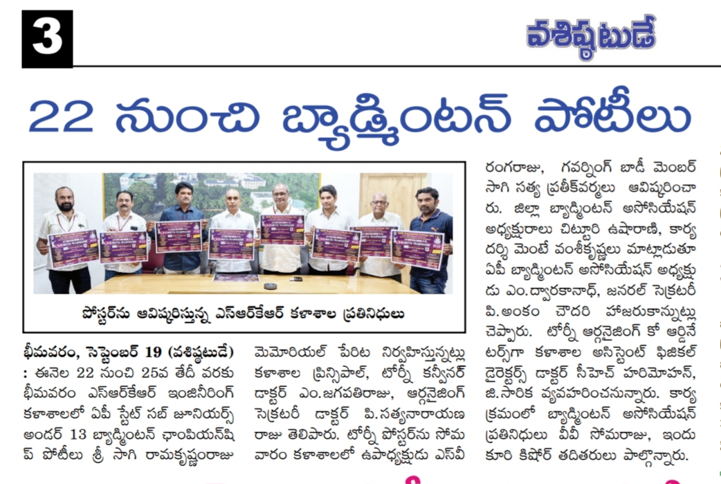 SRKR Engineering College would be hosting the prestigious AP State Sub Junior Under-13 Badminton Championship from 22nd to 25th of this month said Principal of SRKR, Dr. M. Jagapathi Raju. The poster relating to the same was unveiled in the campus by Vice President of SRKR, Sri. SV Ranga Raju. SRKR Governing Council Member Mr. Pratik Varma, District Badminton Association President Smt. Chitturi Usharani, Secretary Mr. Mentee Vamsi Krishna, PD Dr. P. Satyanarayana Raju took part in this programme.