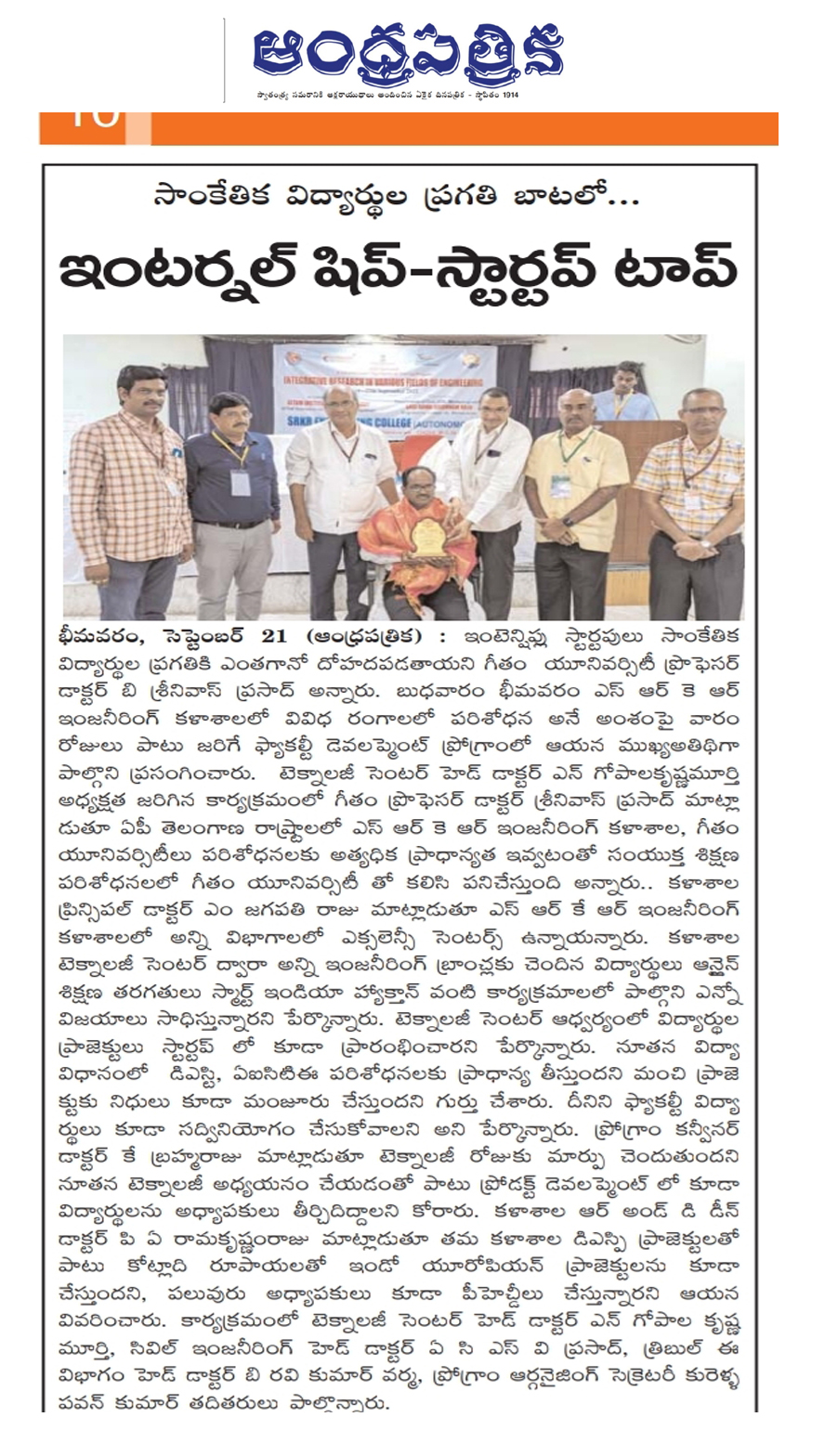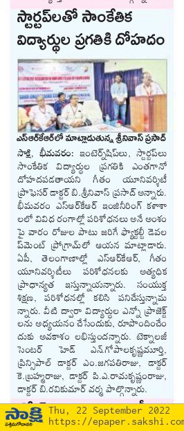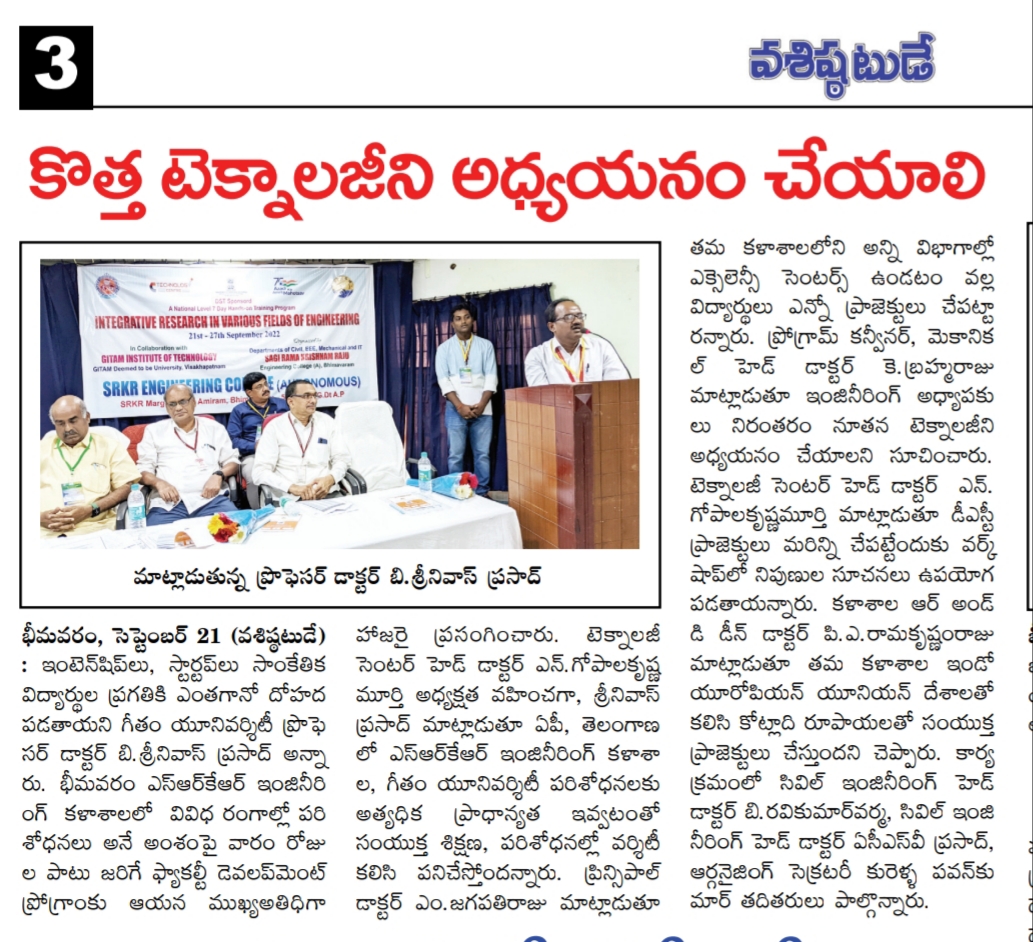 Inaugural Function of FDP on 'INTEGRATIVE RESEARCH IN VARIOUS FIELDS OF ENGINEERING' had took place on Tuesday. Professor of GITAM University Dr. Srinivas Prasad had attended the same as a chief guest and addressed the participants. He said that Internships and Start-ups would play a key role in the development of technical students. SRKR and GITAM are playing a vital role in the areas of research in the states of AP and Telangana. Collaborative Research and Training programmes are being organised by both the institutes through which students and faculty may have expertise and develop in their careers. Principal of SRKR, Dr. M. Jagapathi Raju, HOD of Mechanical Dept Dr. Brahma Raju, Technology Centre Head Dr. Gopalakrishna Murthy, Dr. P.A. Ramakrishnam Raju, Dr. B. Ravi Kumar Varma took part in this event.