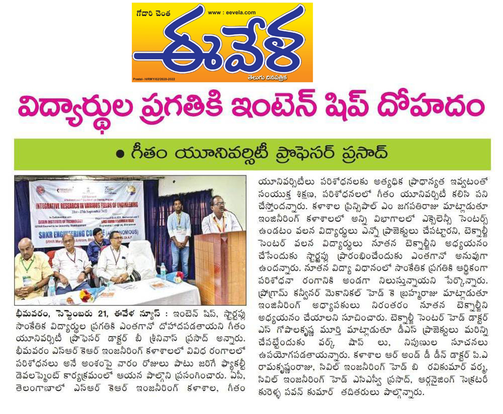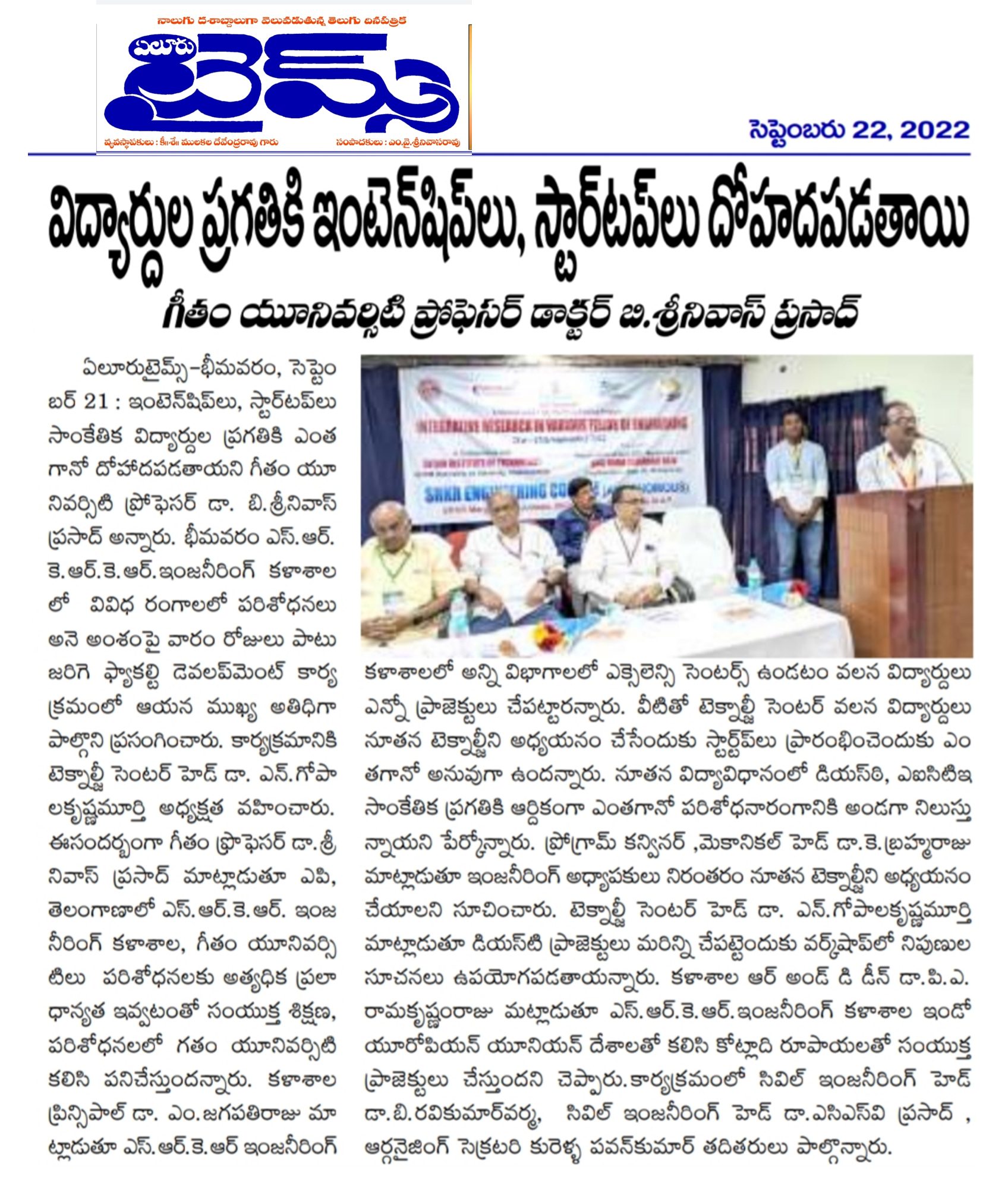 SRKR Engineering College is conducting a FDP on 'Integrative Research in Various Fields of Engineering' from 21st to 27th of Sept, 2022 in association with GITAMS University, Principal of SRKR Dr. M. Jagapathi Raju had said. The brochure relating to the same was inaugurated by SRKR Vice President Mr. SV Ranga Raju. Speaking on this occasion, Technology Centre Head Dr. Gopalakrishna Murthy had said that this FDP would concentrate on various techniques and methods used in projects relating to DST and other funded agencies. HOD of Mechanical Dept, Dr. Brahma Raju would act as Convener, Dr. Gopalakrishna Murthy would be the Coordinator, Dr. Suresh Babu would be the Co-Coordinator and Mr. Pavan Kumar would be the Organizing Secretary for this FDP.