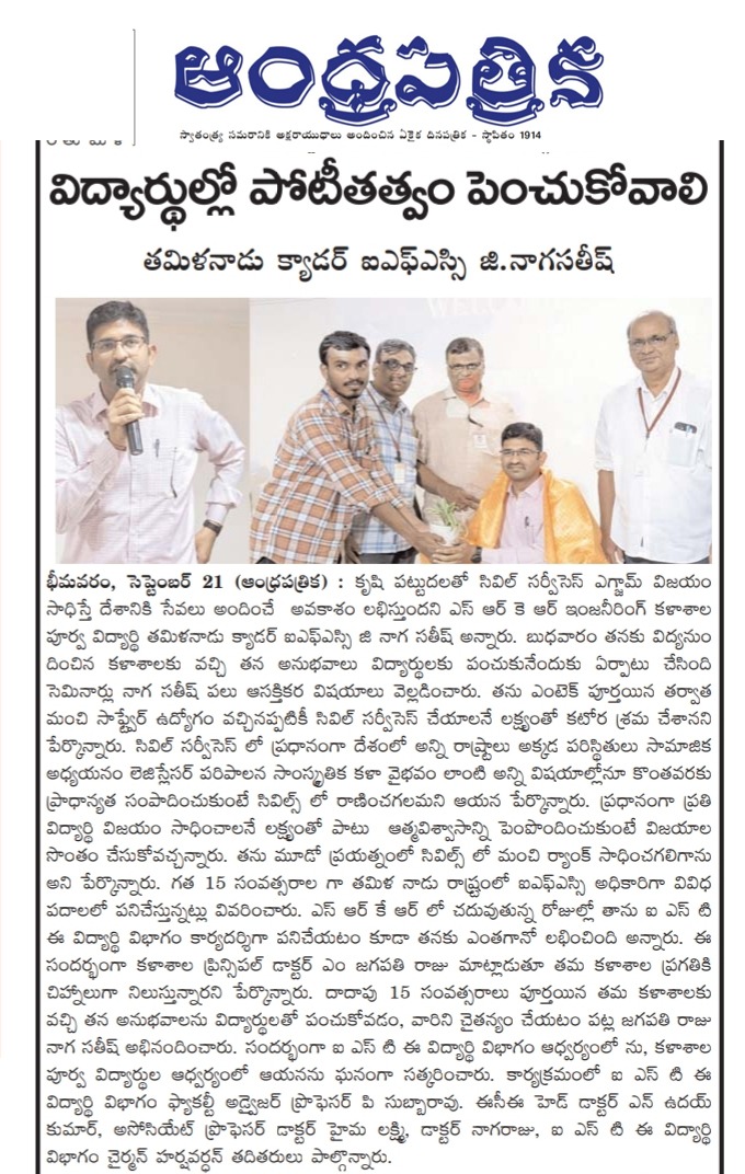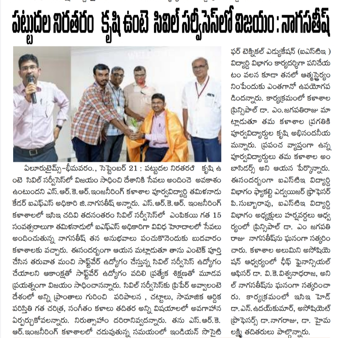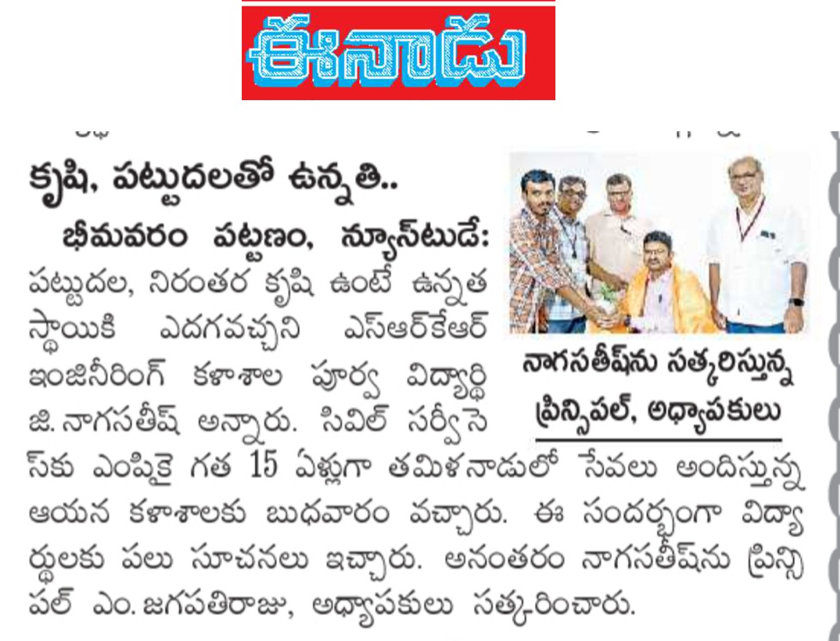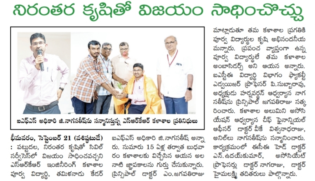 Prominent Alumni of SRKR and Tamil Nadu Cadre IFS Officer Mr. Nagasatish, had visited the campus on Tuesday and addressed the students. He said that students should be mentally and physically strong and should be aware of all the latest happenings and then they can excel in their careers. They should not have inferiority complex. He said that SRKR played a vital role in moulding his career and making him what he is today. Principal of SRKR, Dr. M. Jagapathi Raju, ECE HOD Dr. Udaykumar and team had felicitated the guest and wished him all the best for his future endeavours.