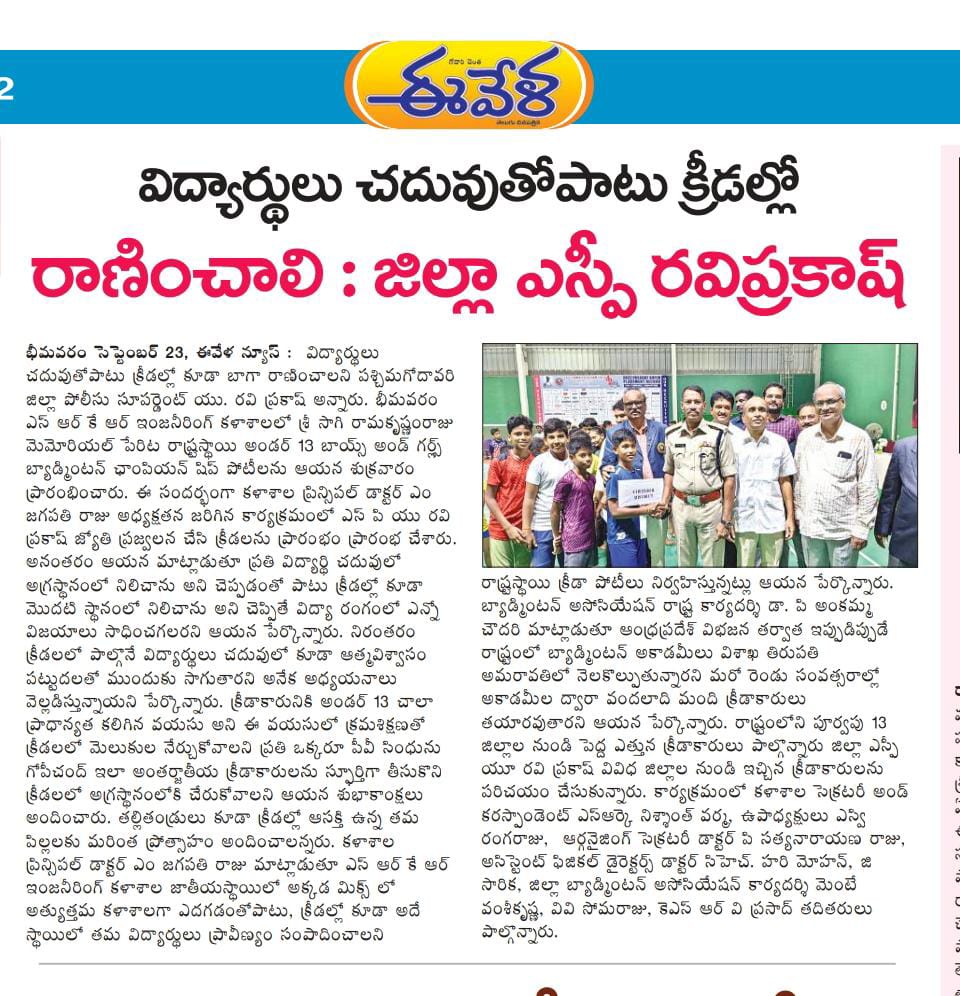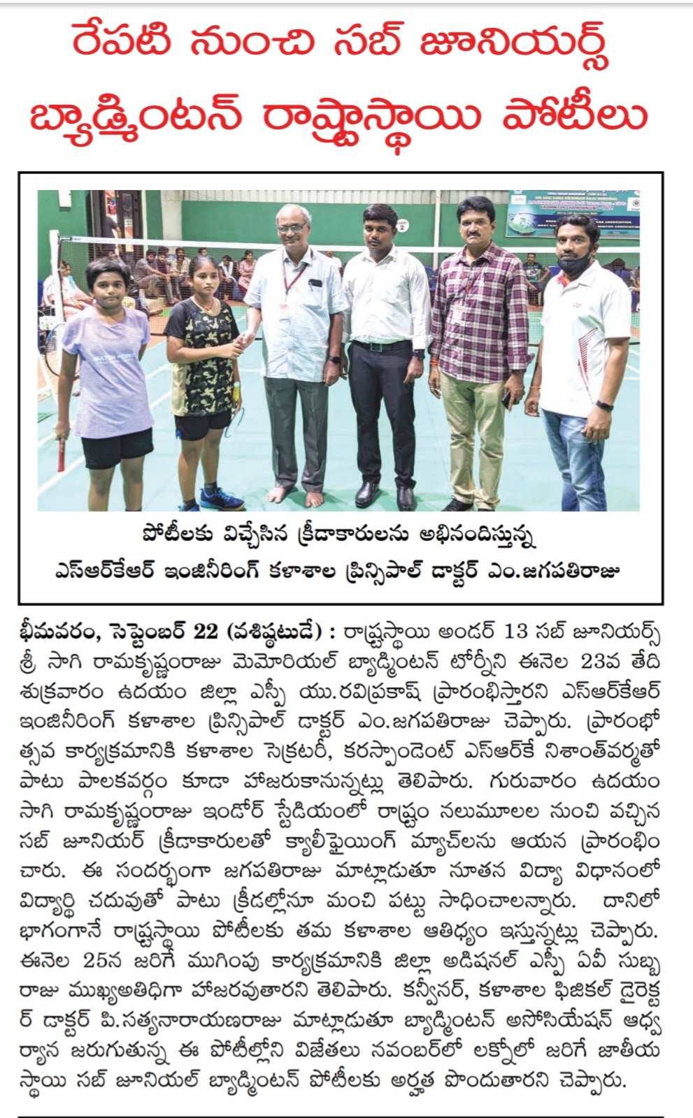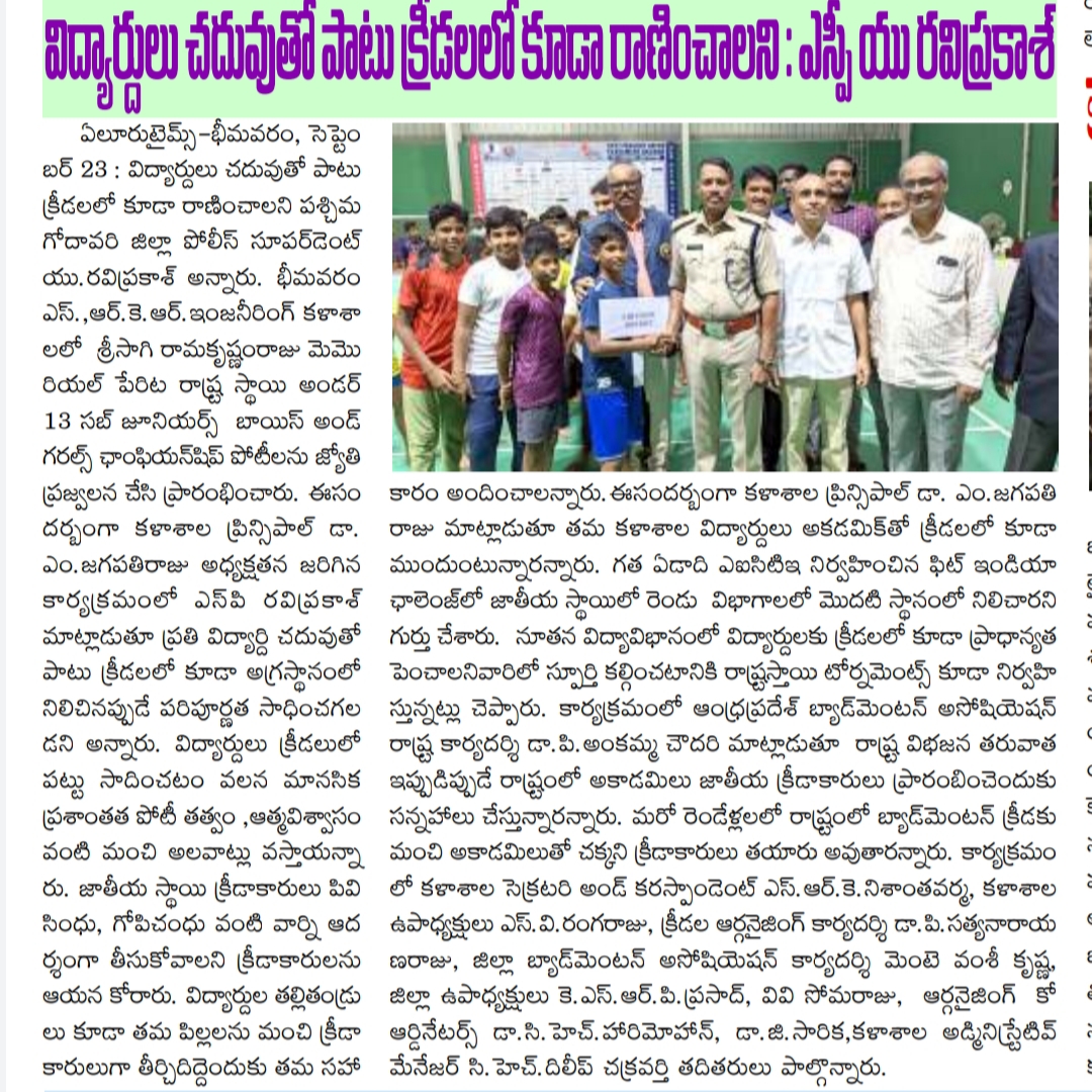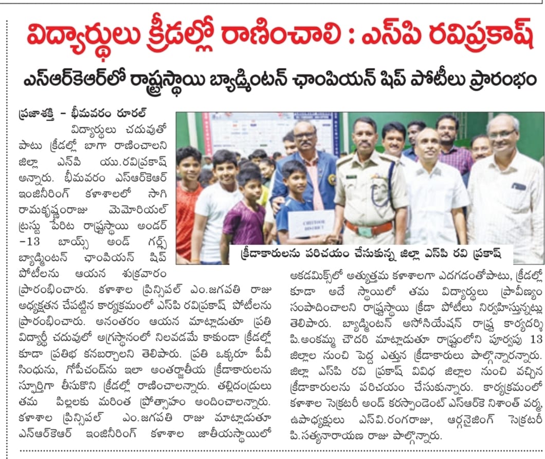 The State Level U-13 Badminton Championship was inaugurated at SRKR by Superintendent of Police, West Godavari District Sri. Ravi Prakash. Speaking on this occasion he said that students should strive ahead in sports too along with academics and then only they can larch ahead with confidence. Principal of SRKR, Dr. M. Jagapathi Raju had said that the college is renowned at the National Level for its achievements. Badminton Association State Secretary Mr. Chowdary had said that the new state is marching ahead in the field of badminton. The SP had personally interacted with all the participants and wished them all the best. SRKR Vice President Sri. SV Ranga Raju, Physical Education Department Team and other officials took part in this event.