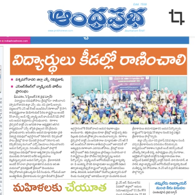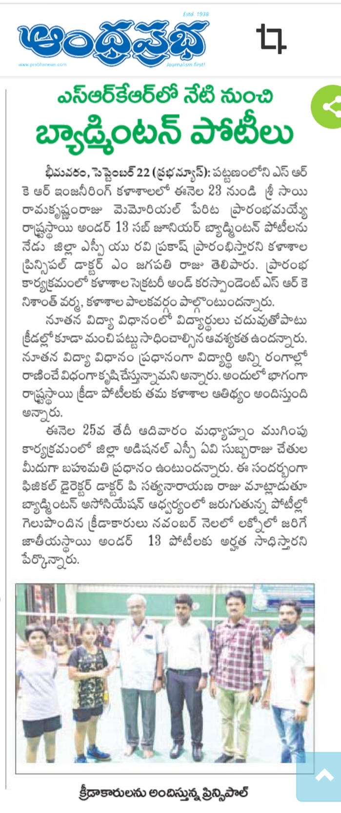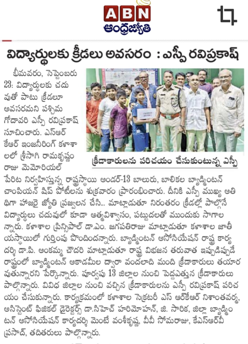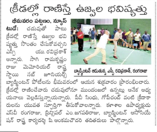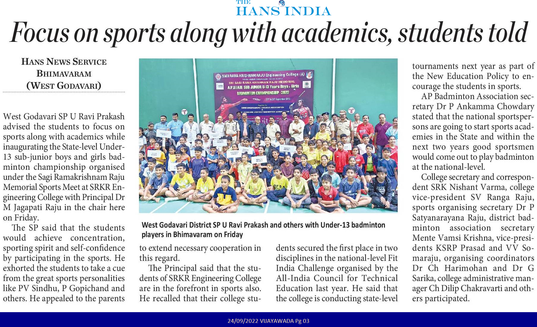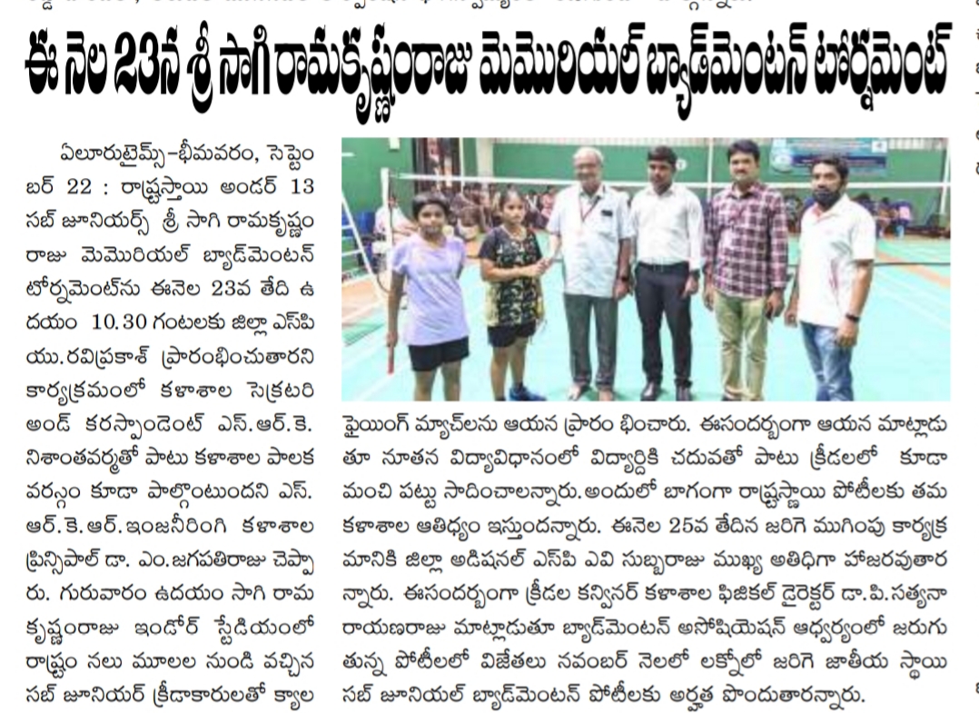 The State Level U-13 Badminton Championship was inaugurated at SRKR by Superintendent of Police, West Godavari District Sri. Ravi Prakash. Speaking on this occasion he said that students should strive ahead in sports too along with academics and then only they can larch ahead with confidence. Principal of SRKR, Dr. M. Jagapathi Raju had said that the college is renowned at the National Level for its achievements. Badminton Association State Secretary Mr. Chowdary had said that the new state is marching ahead in the field of badminton. The SP had personally interacted with all the participants and wished them all the best. SRKR Vice President Sri. SV Ranga Raju, Physical Education Department Team and other officials took part in this event.