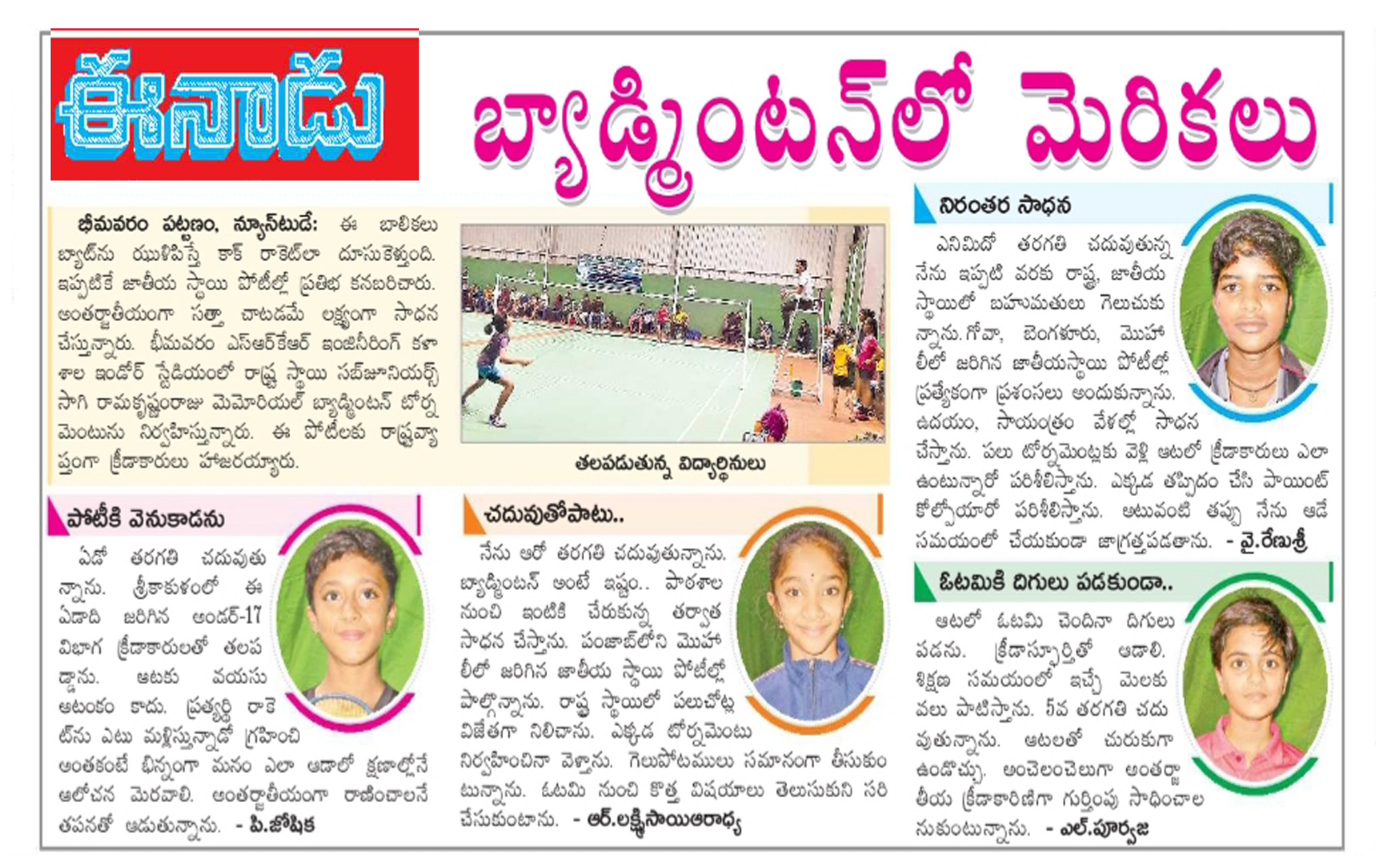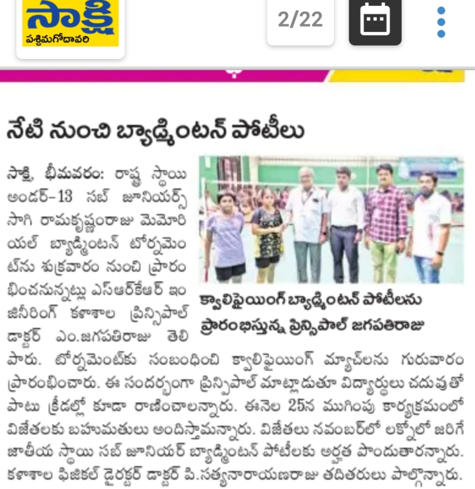 SRKR Engineering College is hosting the prestigious Sri. Sagi Ramakrishnam Raju Memorial Badminton Championship (State Level U-13 Sub Juniors Badminton Championship) from Friday. The qualifying matches were inaugurated by Principal of SRKR Dr. M. Jagapathi Raju. He said that students excel in sports as well as well as academics. The valedictory would be conducted on 25th and the winners would participate at National Level Championship at Lucknow. Physical Director Dr. Satyanarayana Raju and team took part in this event.