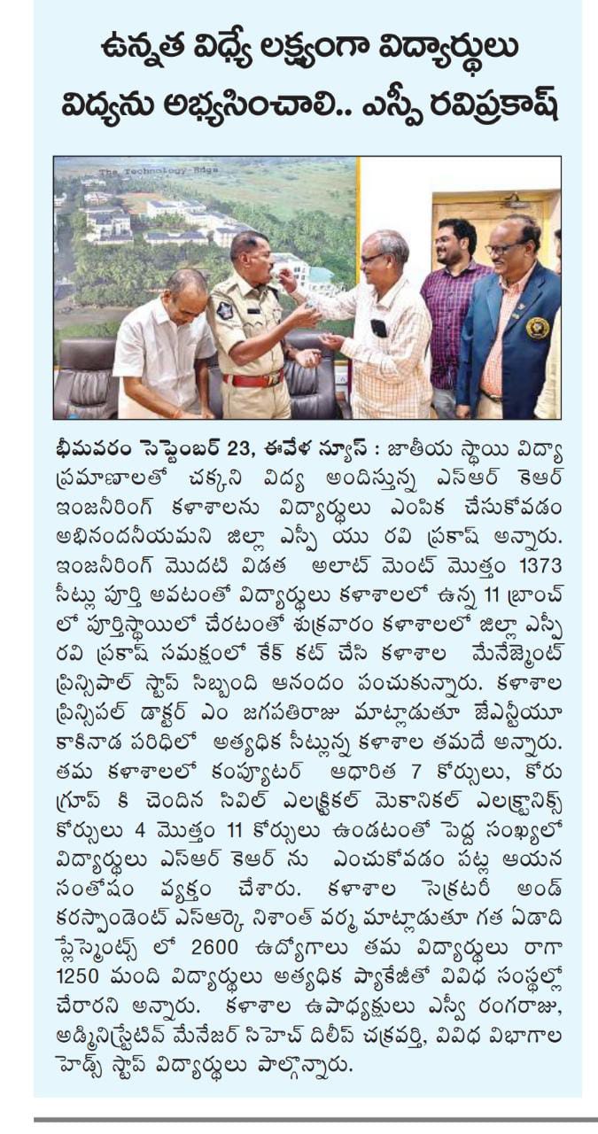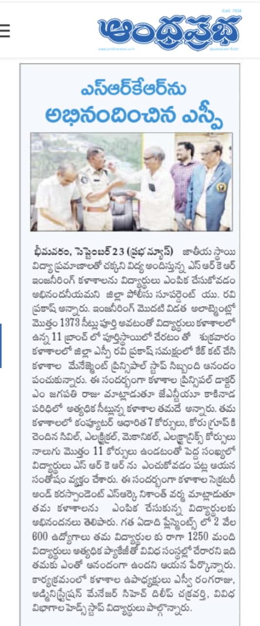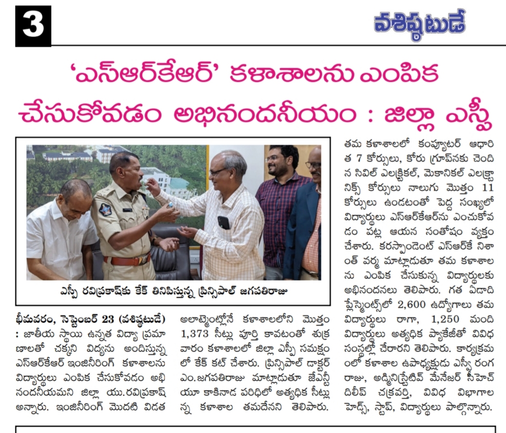 SP Mr. Ravi Prakash had congratulated the management of SRKR for completing all the seats in the first phase allotment of EAPCET. Principal of SRKR, Dr. M. Jagapathi Raju had said that SRKR is the only college with large number of seats under JNTUK. Secretary and Correspondent of SRKR Sri. Nishanth Varma had congratulated all the students for selecting SRKR and he said that the management will strive hard top make their dreams come true. Vice President of SRKR, Sri. SV Ranga Raju and administrative team members participated in this joyous moments.