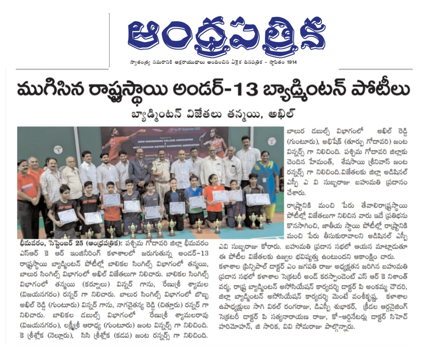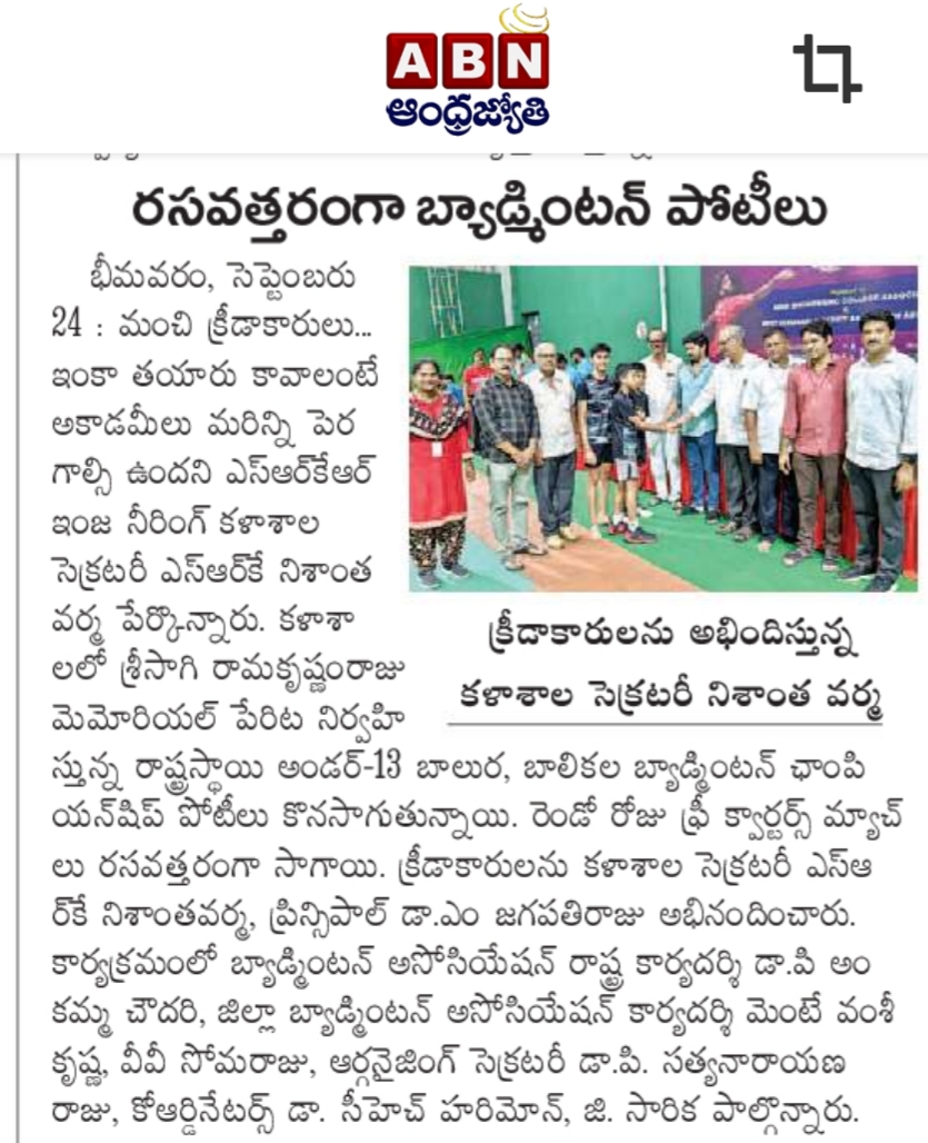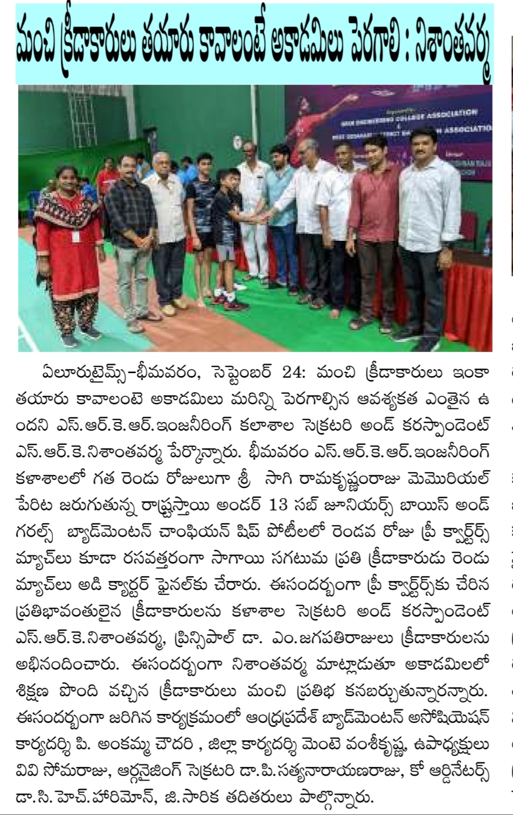 The valedictory championship of State Level U-13 Badminton Championship had happened at SRKR and ASP Sri. Subbaraju attended the same as the Chief Guest. He distributed the prizes to the winners and said that it is only with sports that students can march ahead in life with confidence and values. Secretary and Correspondent of SRKR, Sri. Nishanth Varma had said that SRKR is hosting this event every year. Vice President of SRKR, Sri. SV Ranga Raju, Principal of SRKR, Dr. M. Jagapathi Raju, State Badminton Association Members, Physical Education Department Members and players took part in this event.