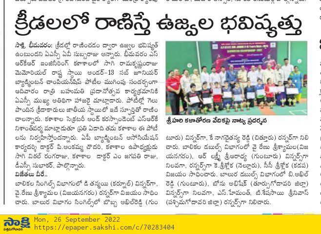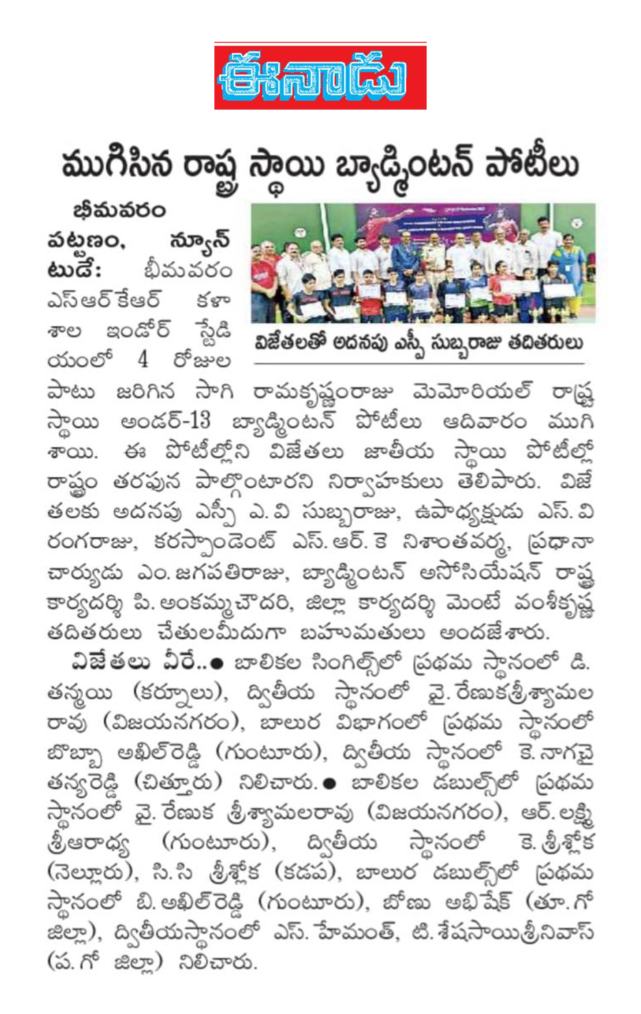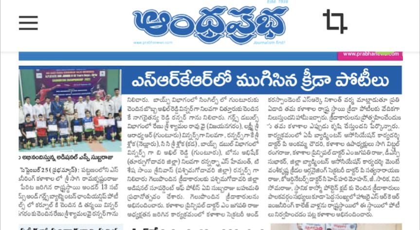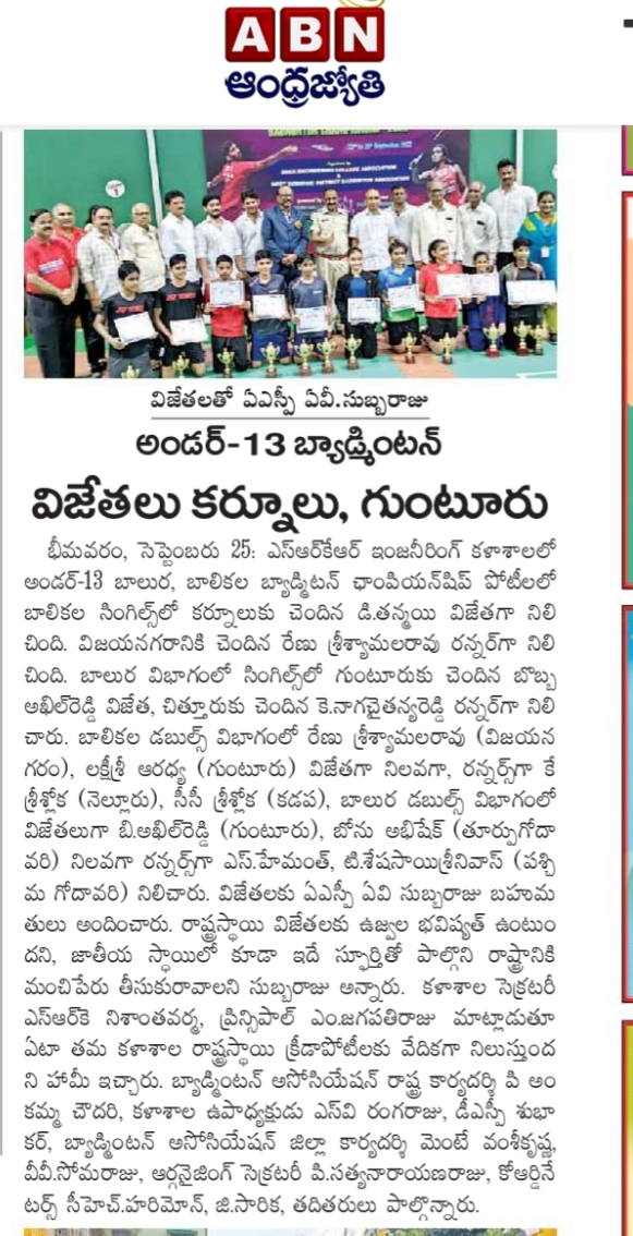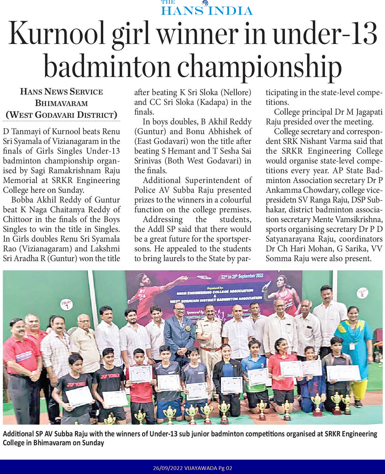The valedictory championship of State Level U-13 Badminton Championship had happened at SRKR and ASP Sri. Subbaraju attended the same as the Chief Guest. He distributed the prizes to the winners and said that it is only with sports that students can march ahead in life with confidence and values. Secretary and Correspondent of SRKR, Sri. Nishanth Varma had said that SRKR is hosting this event every year. Vice President of SRKR, Sri. SV Ranga Raju, Principal of SRKR, Dr. M. Jagapathi Raju, State Badminton Association Members, Physical Education Department Members and players took part in this event.