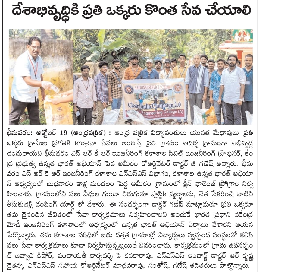 The students of SRKR Engg College had conducted an Clean Challenge drive at Pedamiram Village under the college NSS Unit. Speaking on this occasion, Professor of Civil Engg Dr. Ganesh had said that students should voluntarily come forward to serve in the villages. The students took part in an awareness campaign in the village.