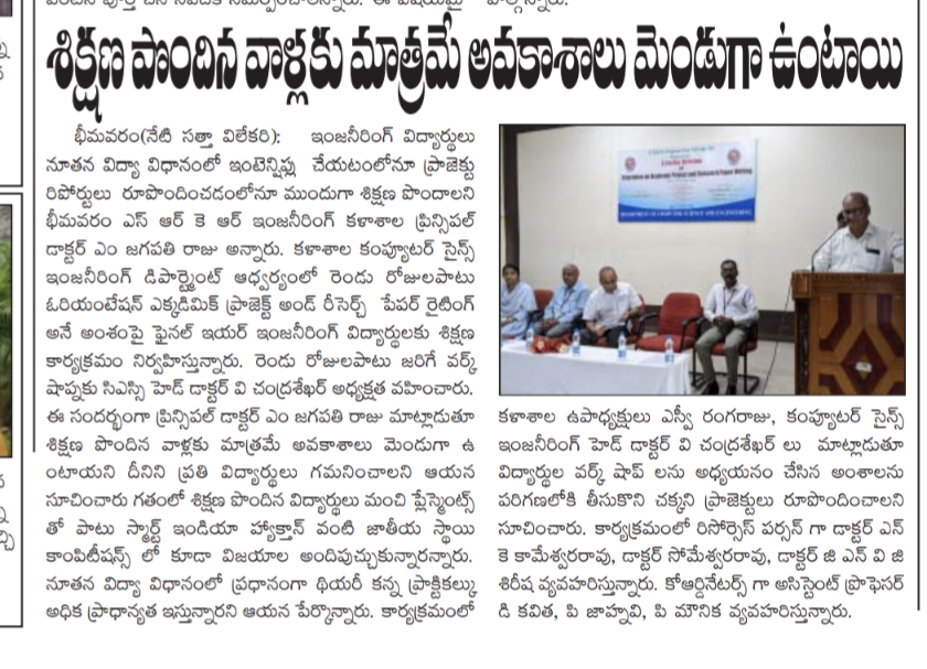 The Dept of CSE is conducting an Orientation Programme On Academic Project and Research Paper Writing for two days. The same has been inaugurated in the campus by Vice President of SRKR Sri. SV Ranga Raju and Principal of SRKR, Dr. M. Jagapathi Raju. Speaking on this occasion Principal had said that it is mandatory for the students to have training on academic projects and research paper writing under the new National Educational Policy. The students with this skill set will have more chances for their career upgrade. Faculty of CSE Dept and students took part in this occasion.