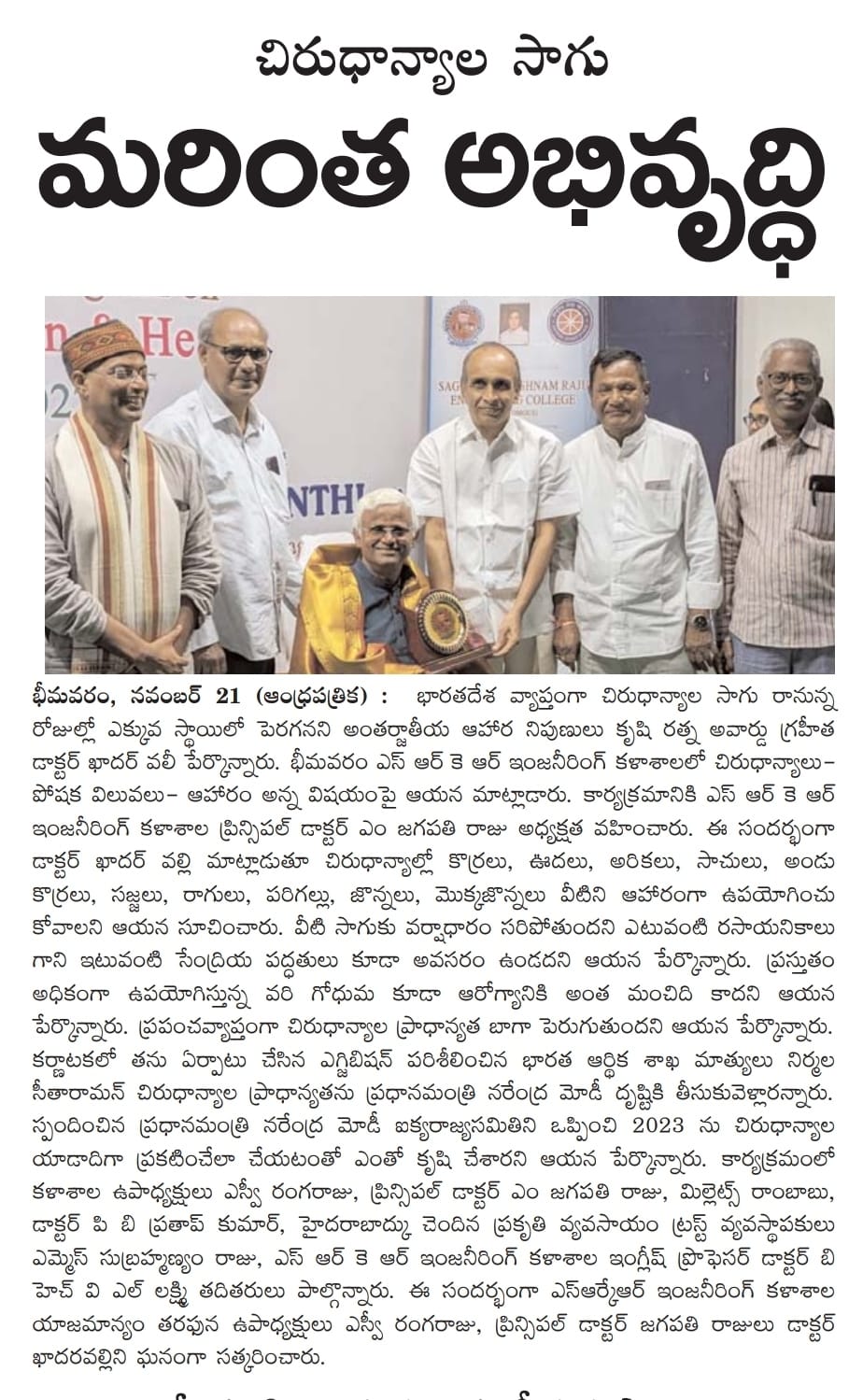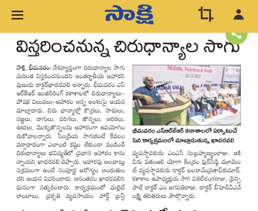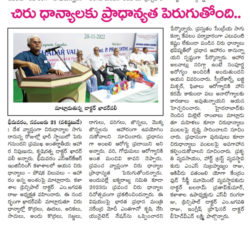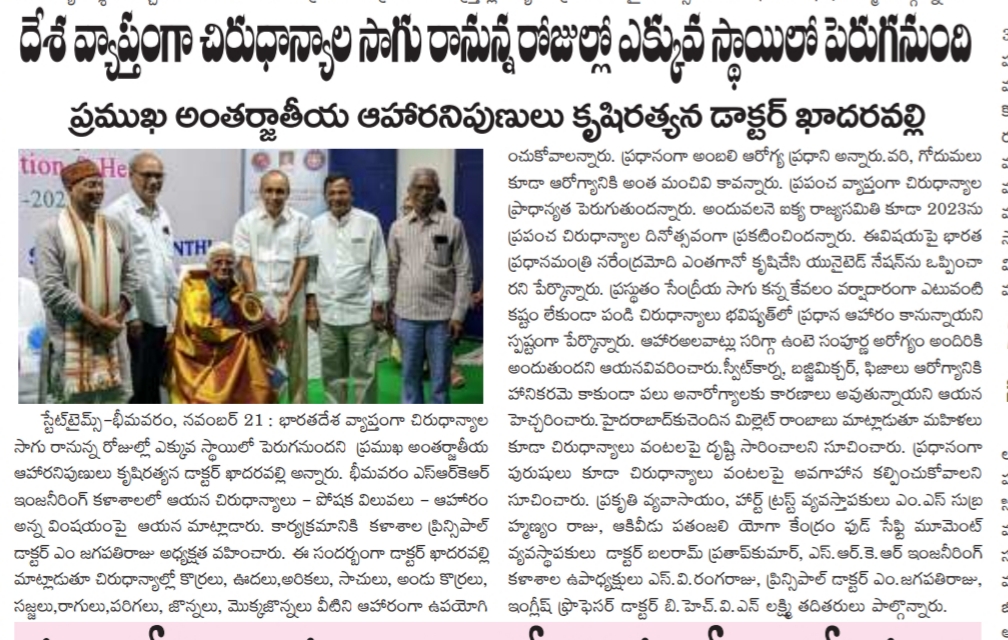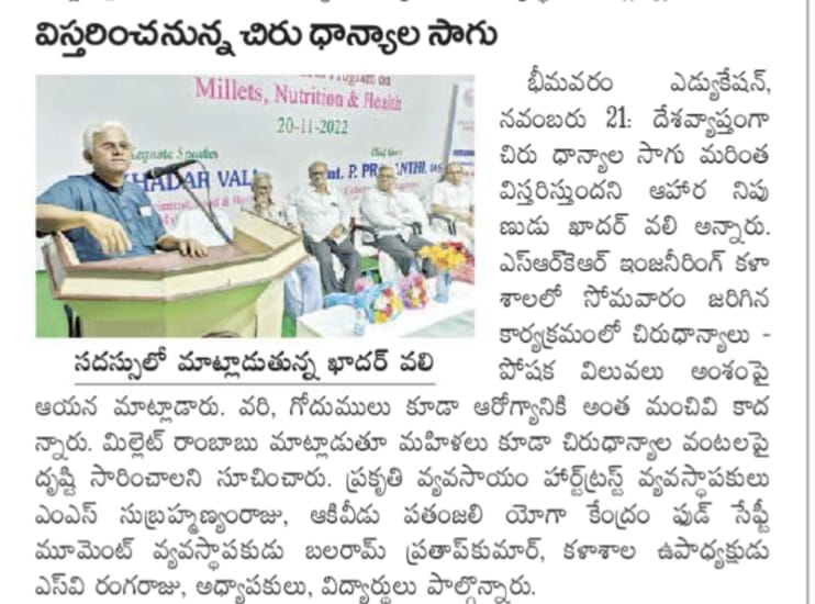 An awareness session was organized on 'Millets Nutrition & Health' at SRKR Engg College on 20th Nov, 2022. Speaking on this occasion International Food Expert Dr. Khader Vali had said that Millets farming is going to increase in the coming days. He said that Millets will gain prominence in the coming days due to its nutrition value and health benefits. He was grandly felicitated by the college management. Mr. Millet Rambabu, Organic Farming Heart Trust Founder MS. Subramanyam Raju, Vice President of SRKR Sri. SV Ranga Raju, Principal Dr. M. Jagapathi Raju, Dr. BHVN Lakshmi took part in this occasion.
